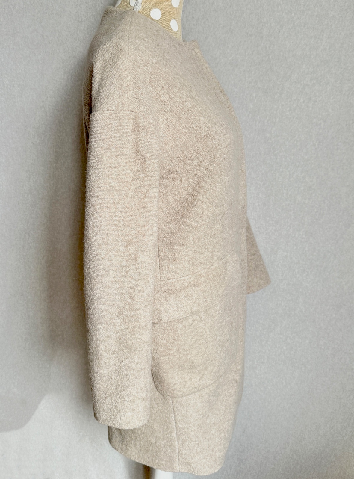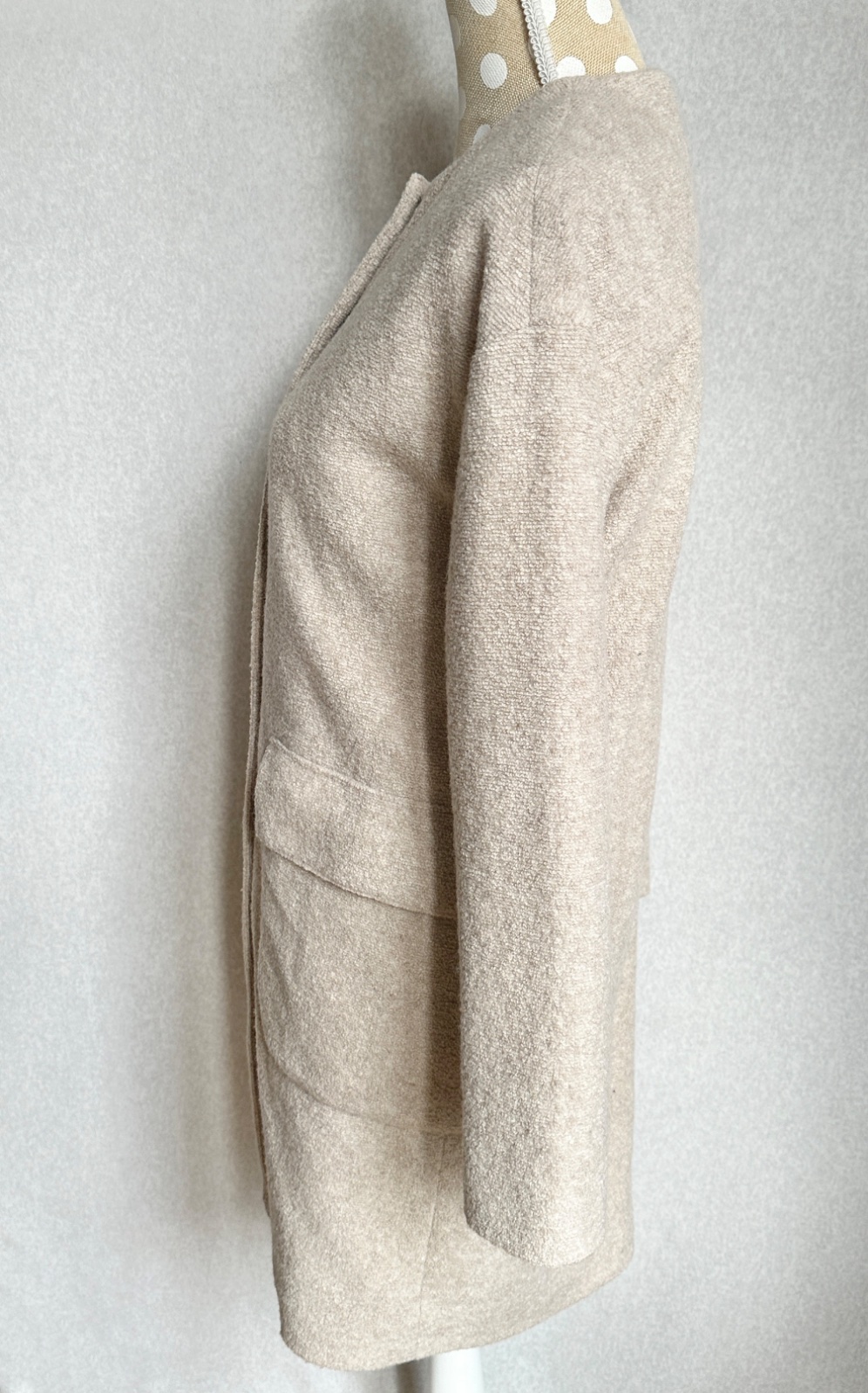 Kabát na teplejšiu zimu alebo prechodné obdobie v jemnej béžovej farbe. Pôsobí veľmi elegantne a nadčasovo. Zloženie 57% vlna, 21% polyamid, 18% polyester, 4% iné materiály. Zapínanie na patentky (zvonku neviditeľné). Má aj uško na zavesenie. Vo veľmi peknom stave, bez poškodení.