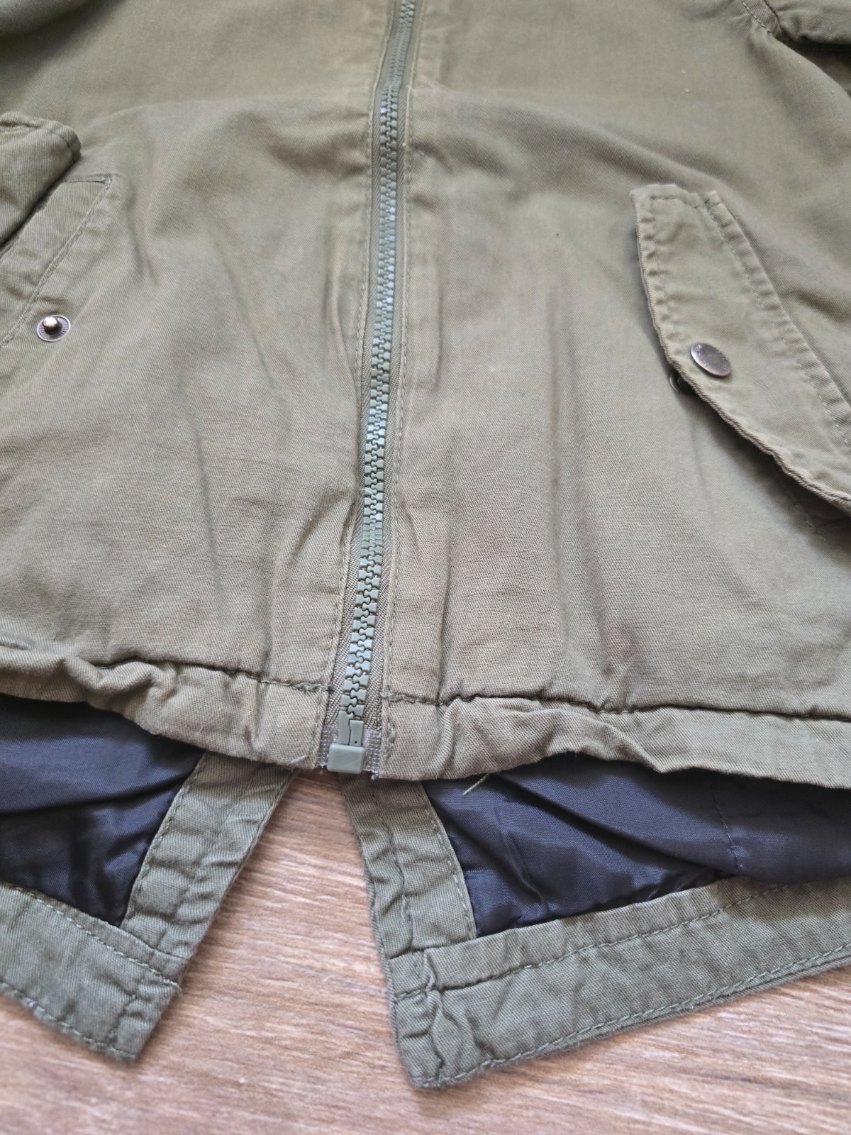 Velmi pekny stav, stylova bunda, podsita bavlnou, pc vysoka. Krasna farba - vojenska zelena/olivova.