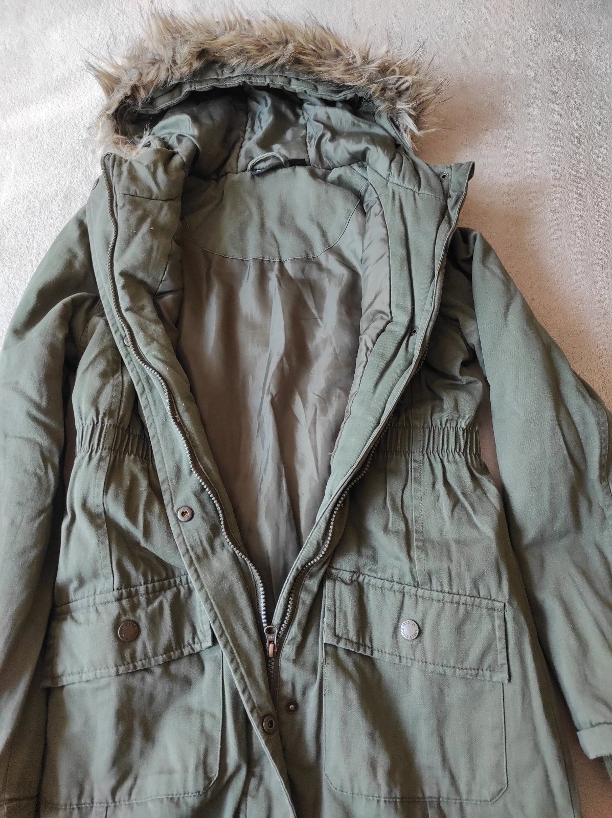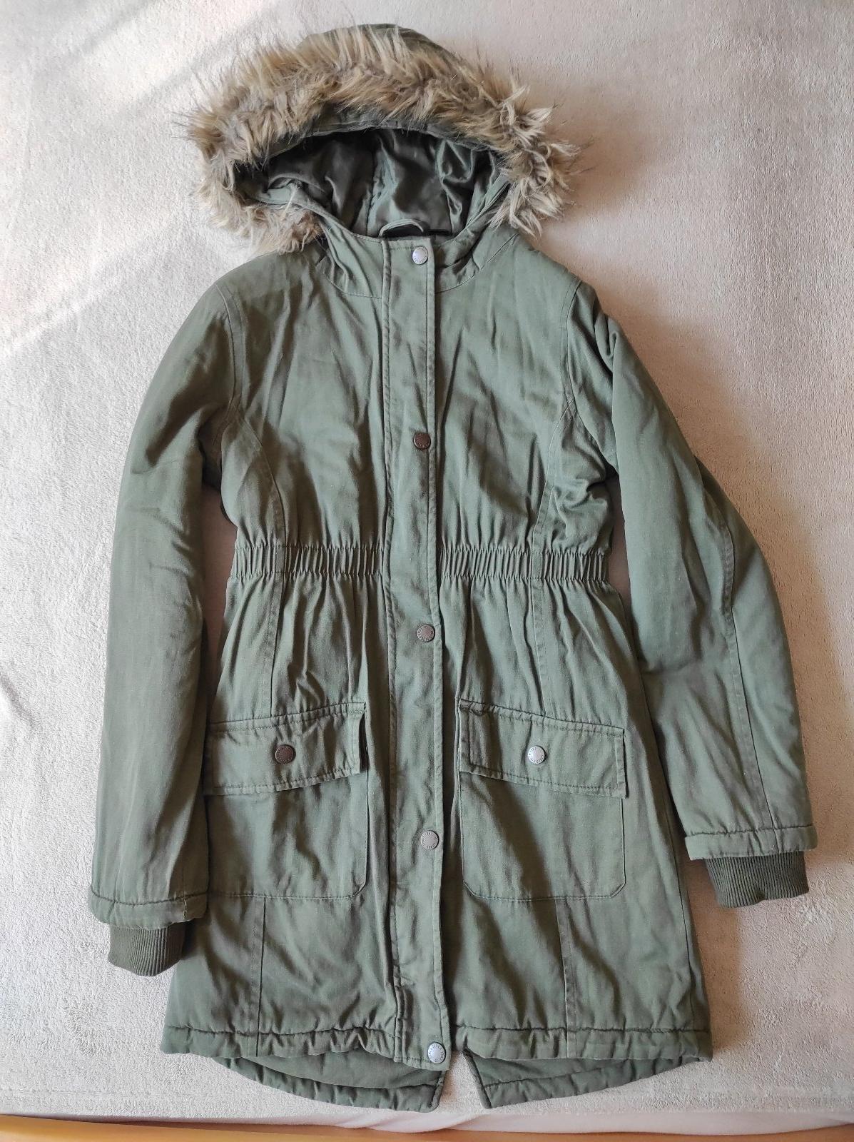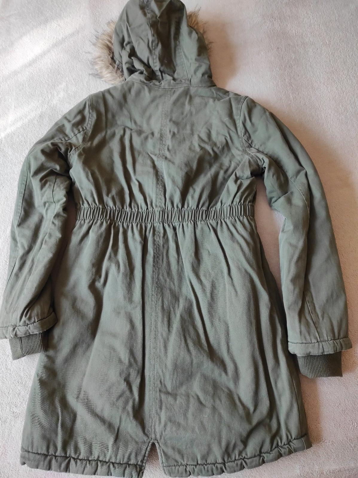 Bunda je nosená, nemá poškodenia. Materiál je hrubá bavlna, nie šušťak. V páse trochu sťahuje guma, vpredu vrecká, celá podšitá, kapucňa napevno. Výrobca Peppert, veľkosť 164. D: 85 cm, š- 50cm, rukáv od krku 75 cm.