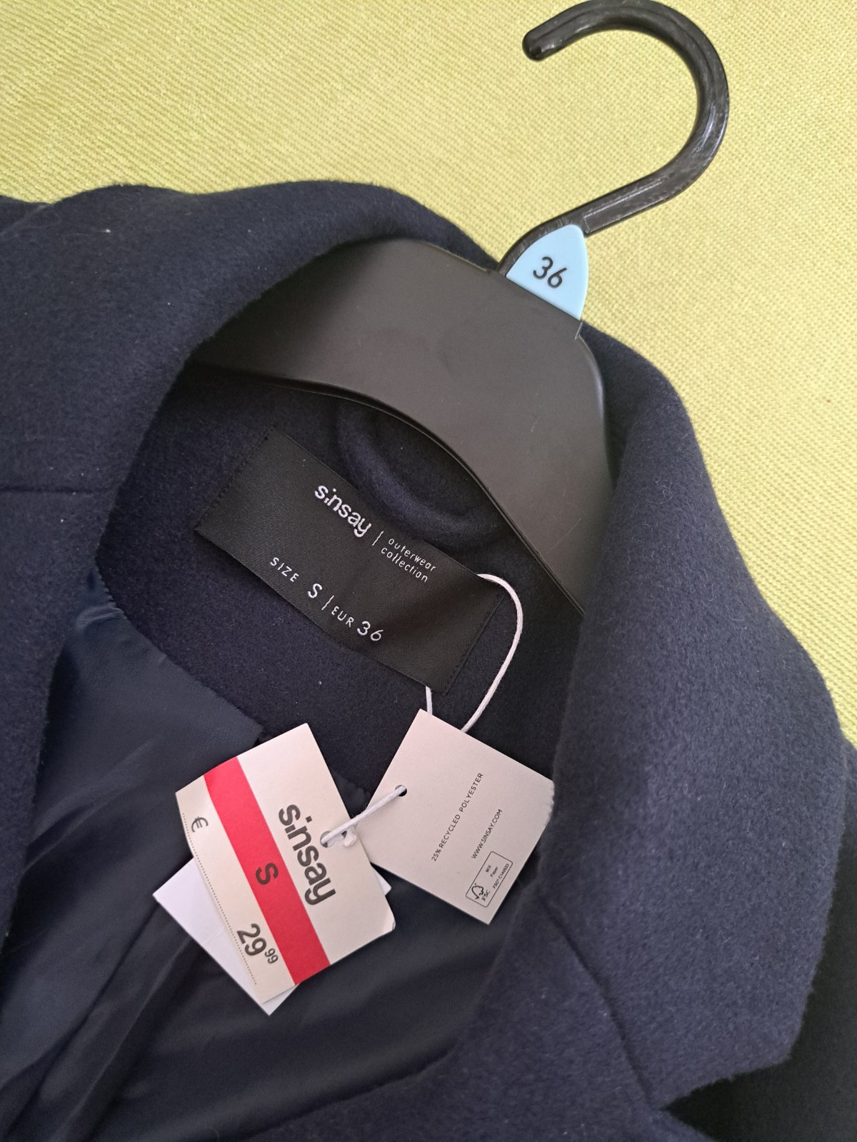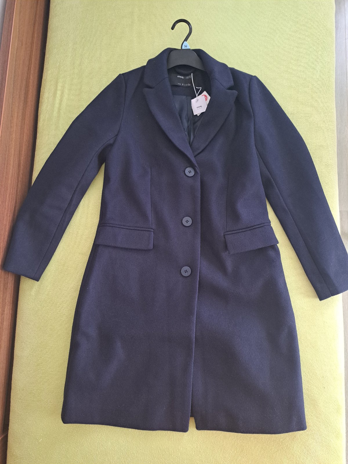 Tmavomodry kabat Sinsay, nenoseny novy este s vysackami. Velkost S - 36, rozmery vo fotkach. Povedala by som, ze tensi, prechodny. Zapinanie na 3 gombiky, vrecka, hladka podsivka. Pov. cena 29,99 e.