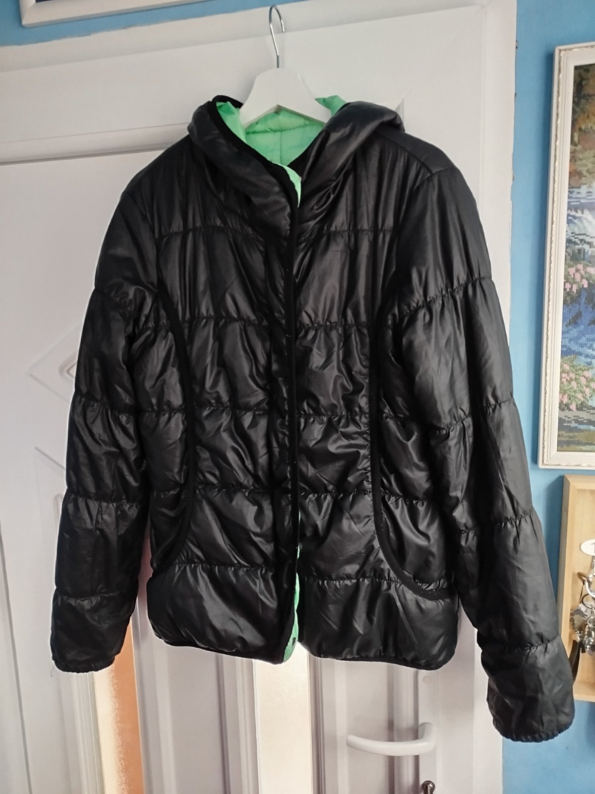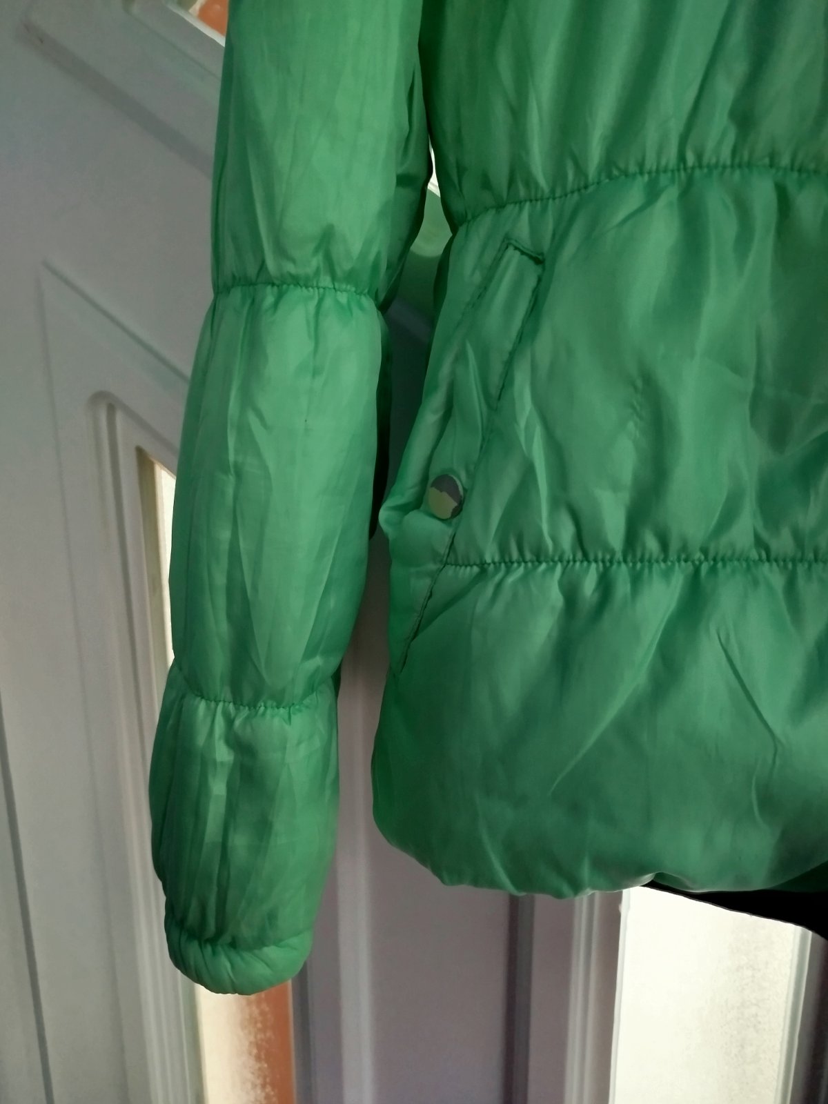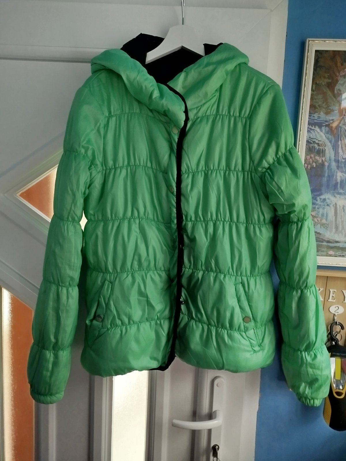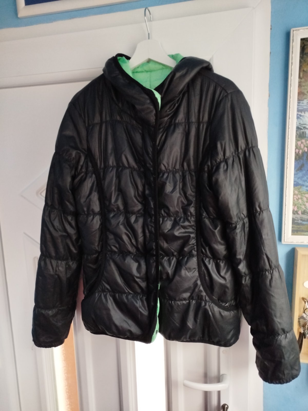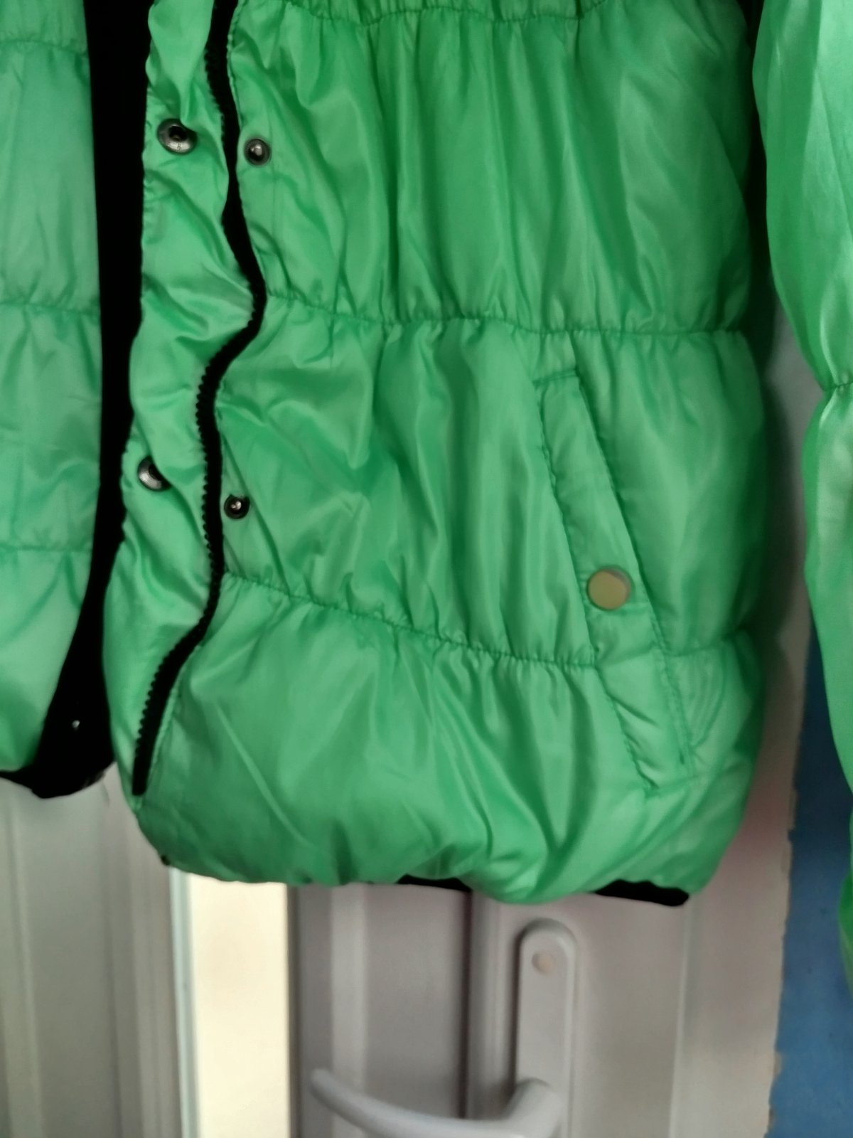 - na miernu zimu, šírka 2x50cm, takže udana veľkosť nesedí, je menšia, chyby na poslednych 2fotkach, a gombíky šuchnuté, snáď ešte poslúži, obojstranná, druha strana zelena