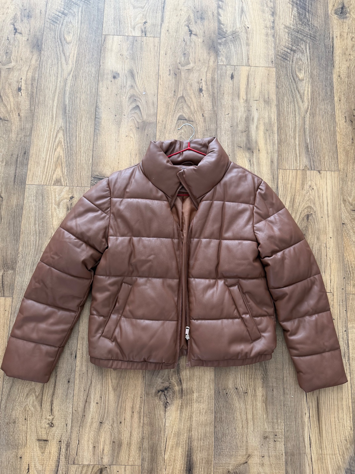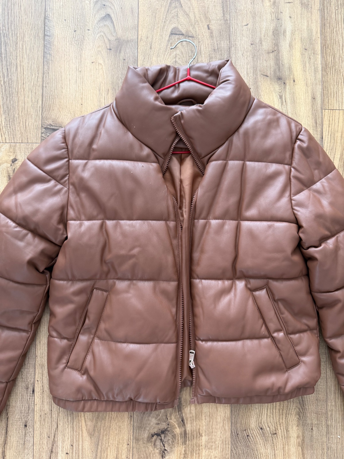 Bunda nenosena,nesadla mi veľkosť. Koženkova, štýl Puffer. Teplá na zimu. Väčšie M-ko.