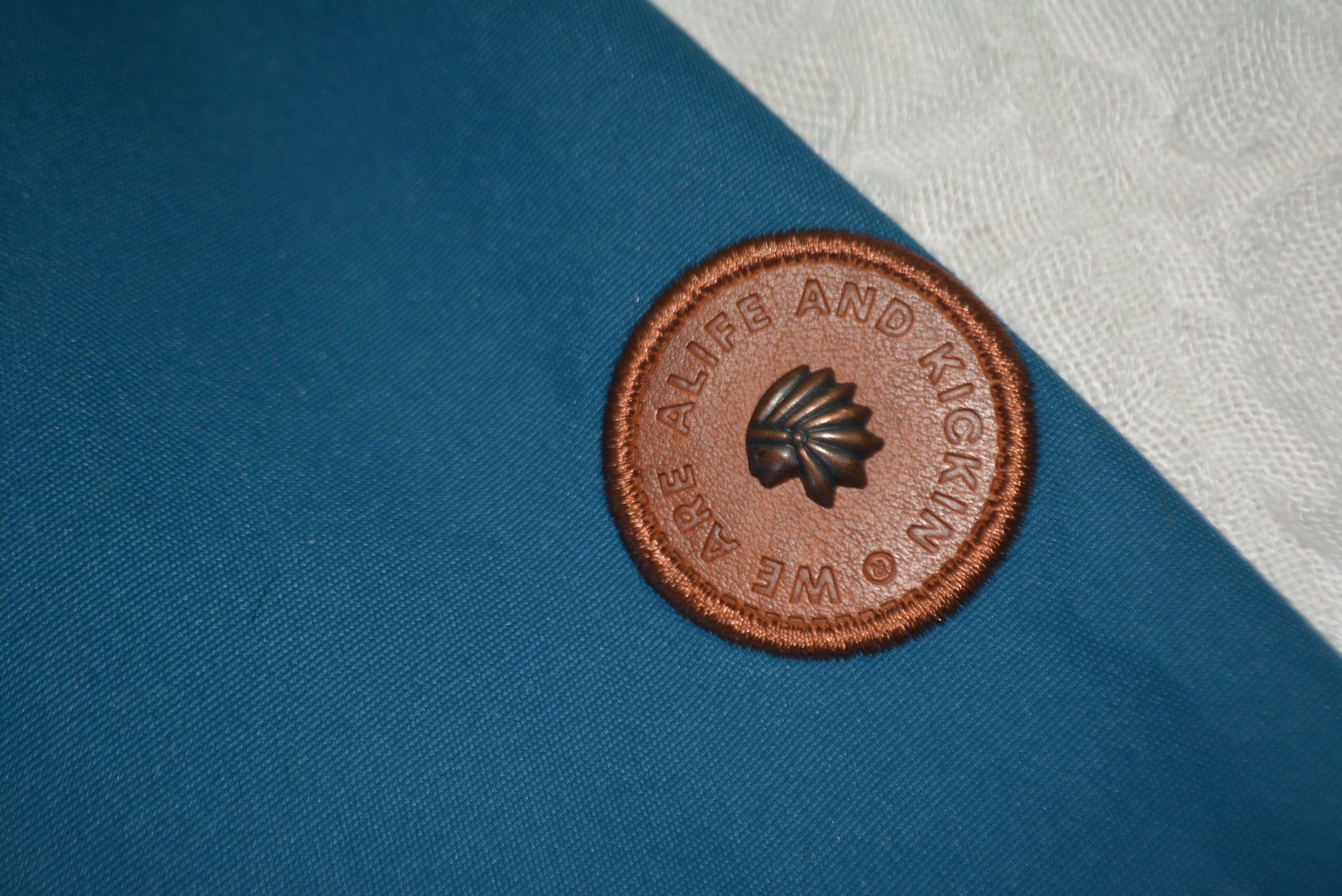 zapínanie na zips zakončený kontrastnou hnedou koženou úchytkou
