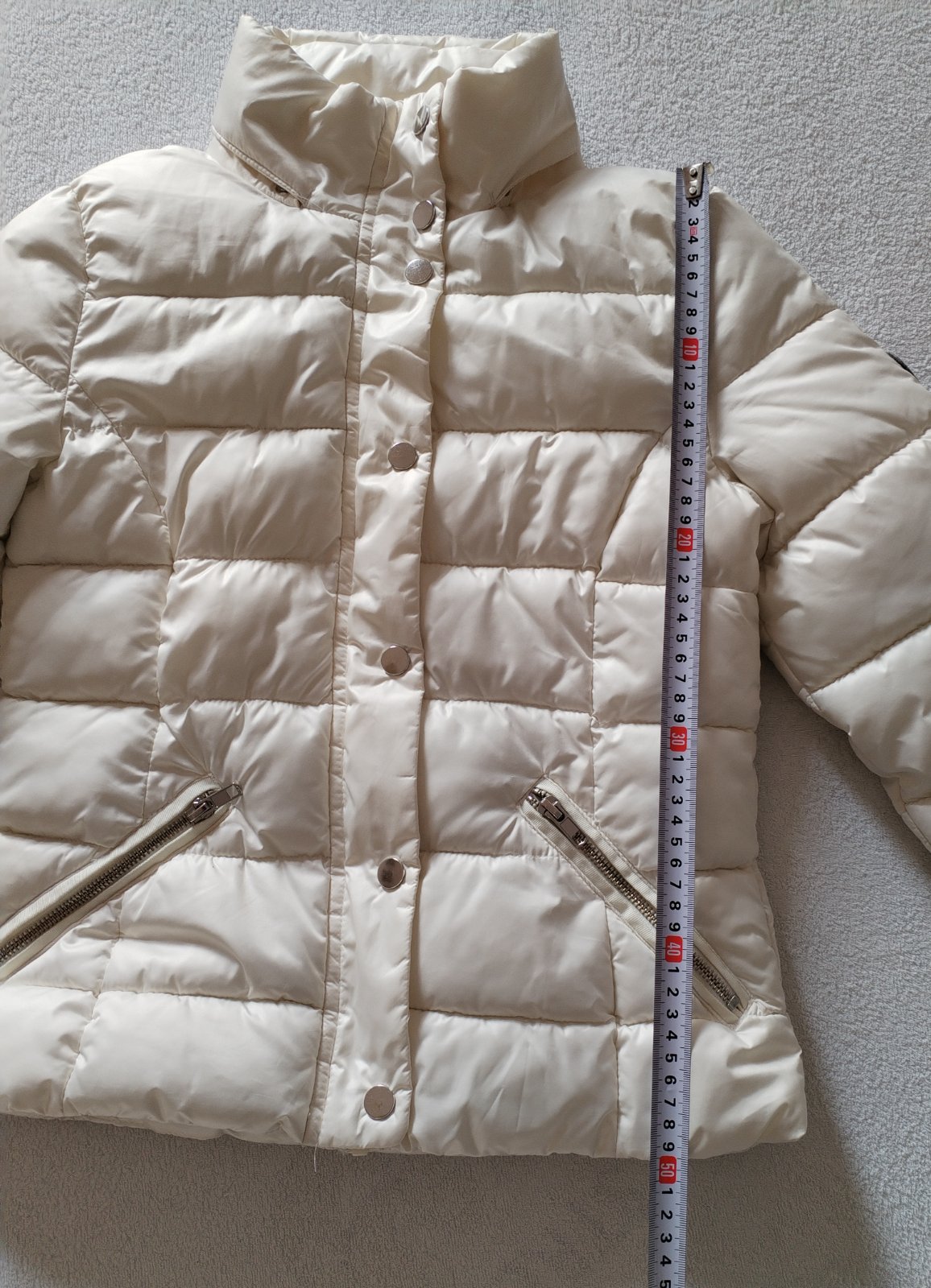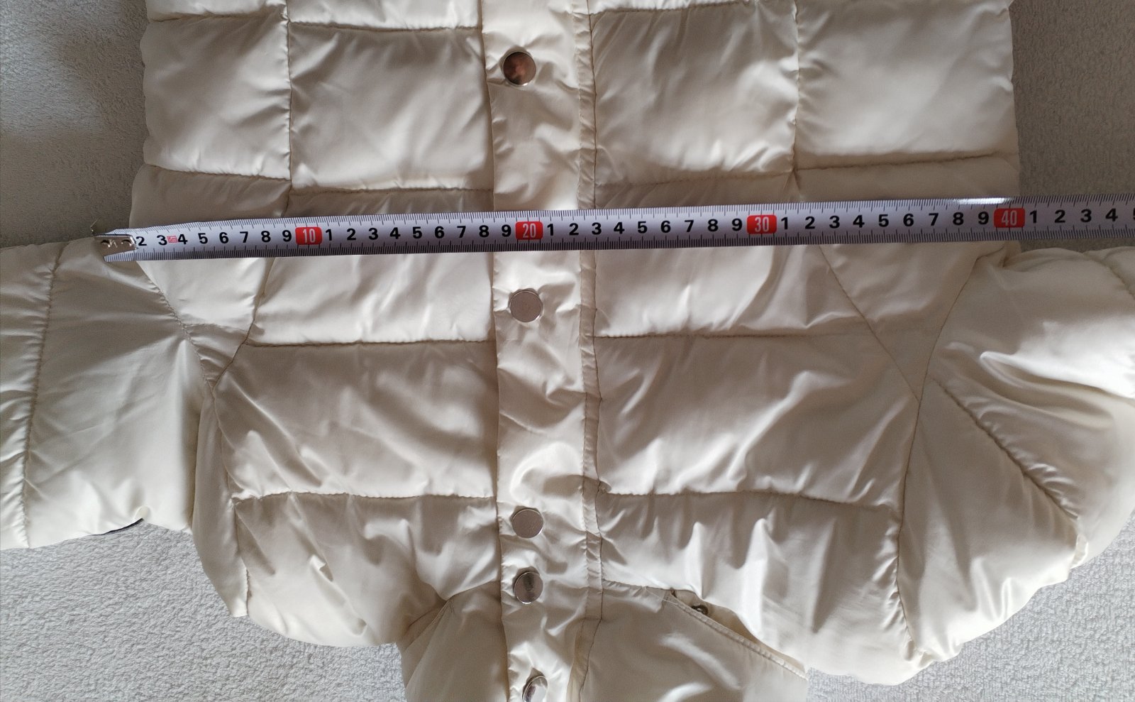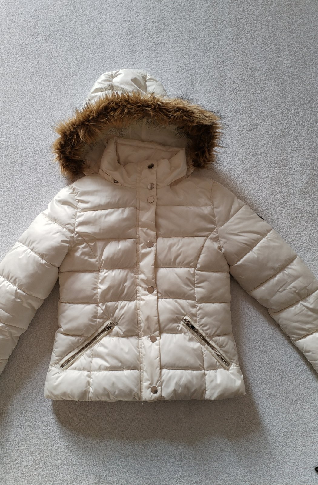 Pekná, prešívaná bundička. Vel. uvedená 158, ale da sa nosiť aj skôr. Odporúčam skôr na miernejšiu zim, alebo chladný prechod. Nosená, vo veľmi dobrom stave. Farba je skor šampanská, nie je čisto biela.