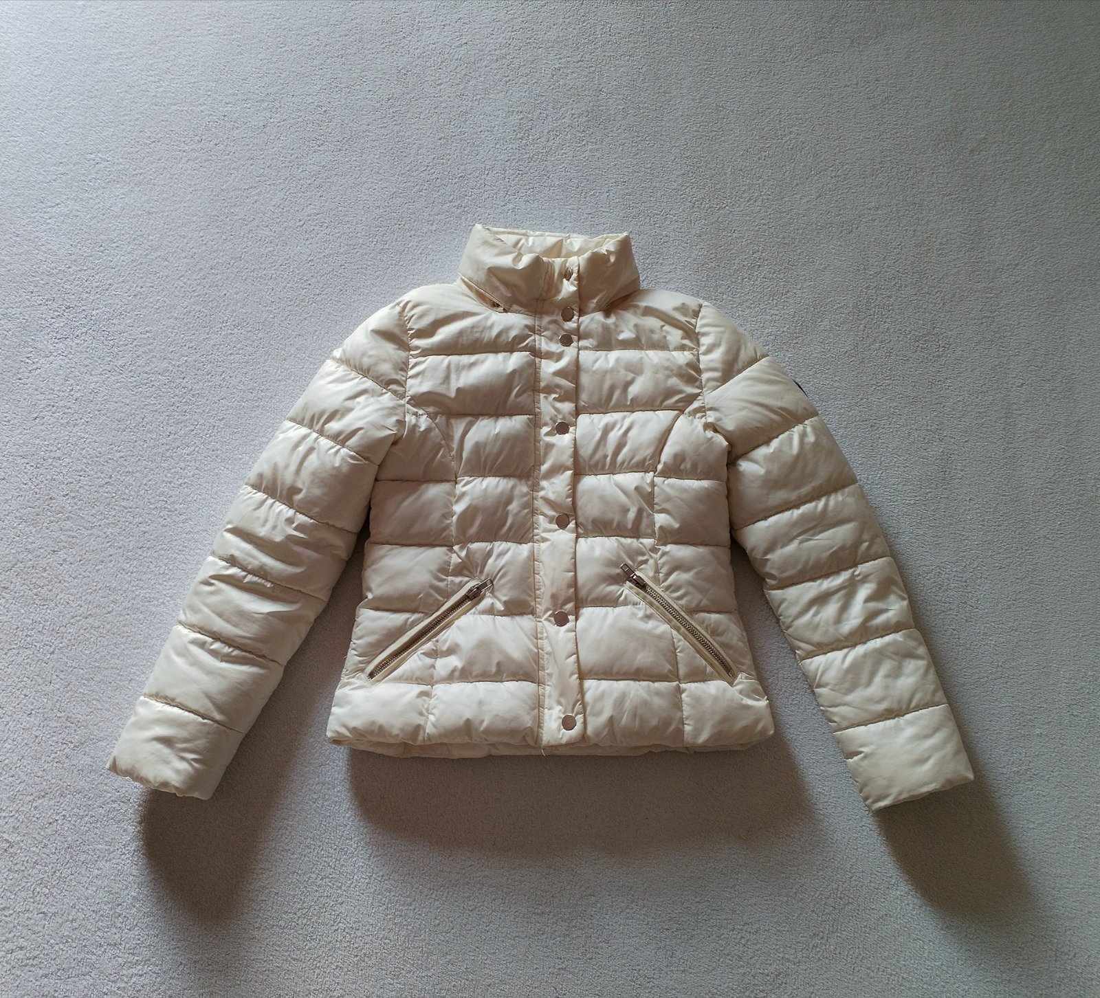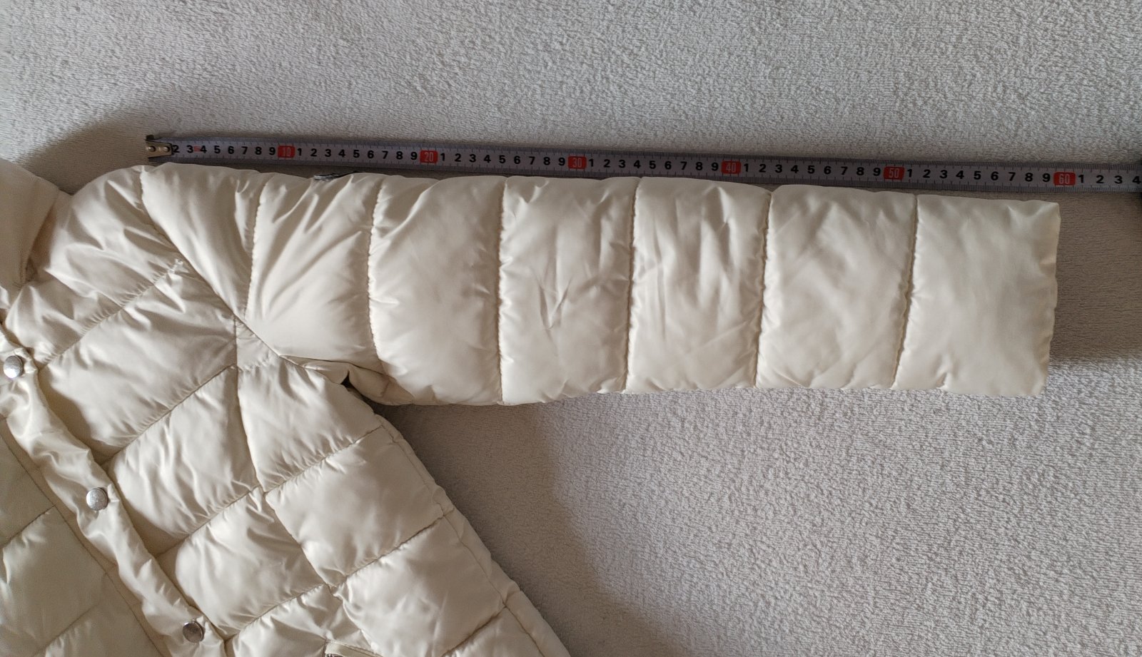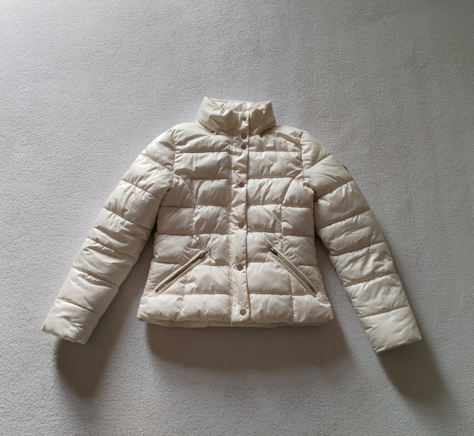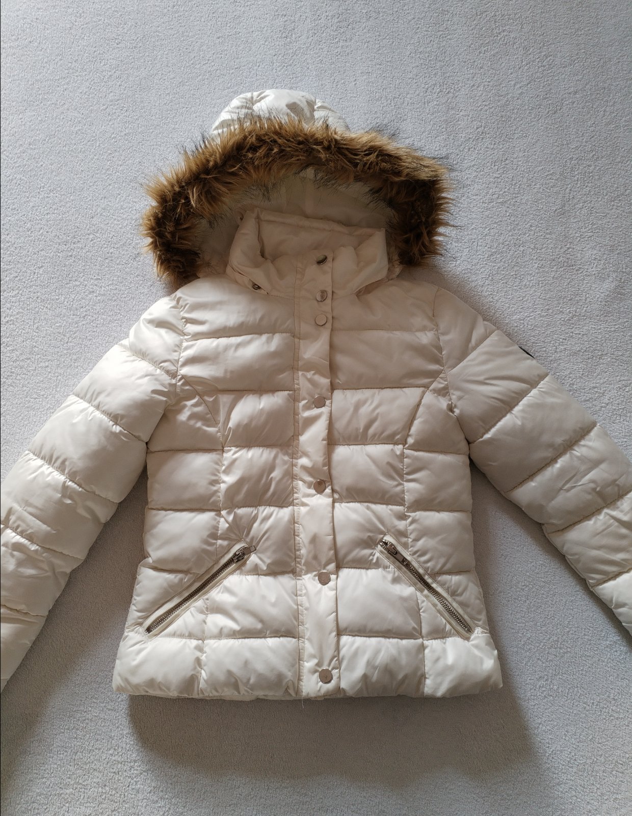 Pekná, prešívaná bundička. Vel. uvedená 158, ale da sa nosiť aj skôr. Odporúčam skôr na miernejšiu zim, alebo chladný prechod. Nosená, vo veľmi dobrom stave. Farba je skor šampanská, nie je čisto biela.