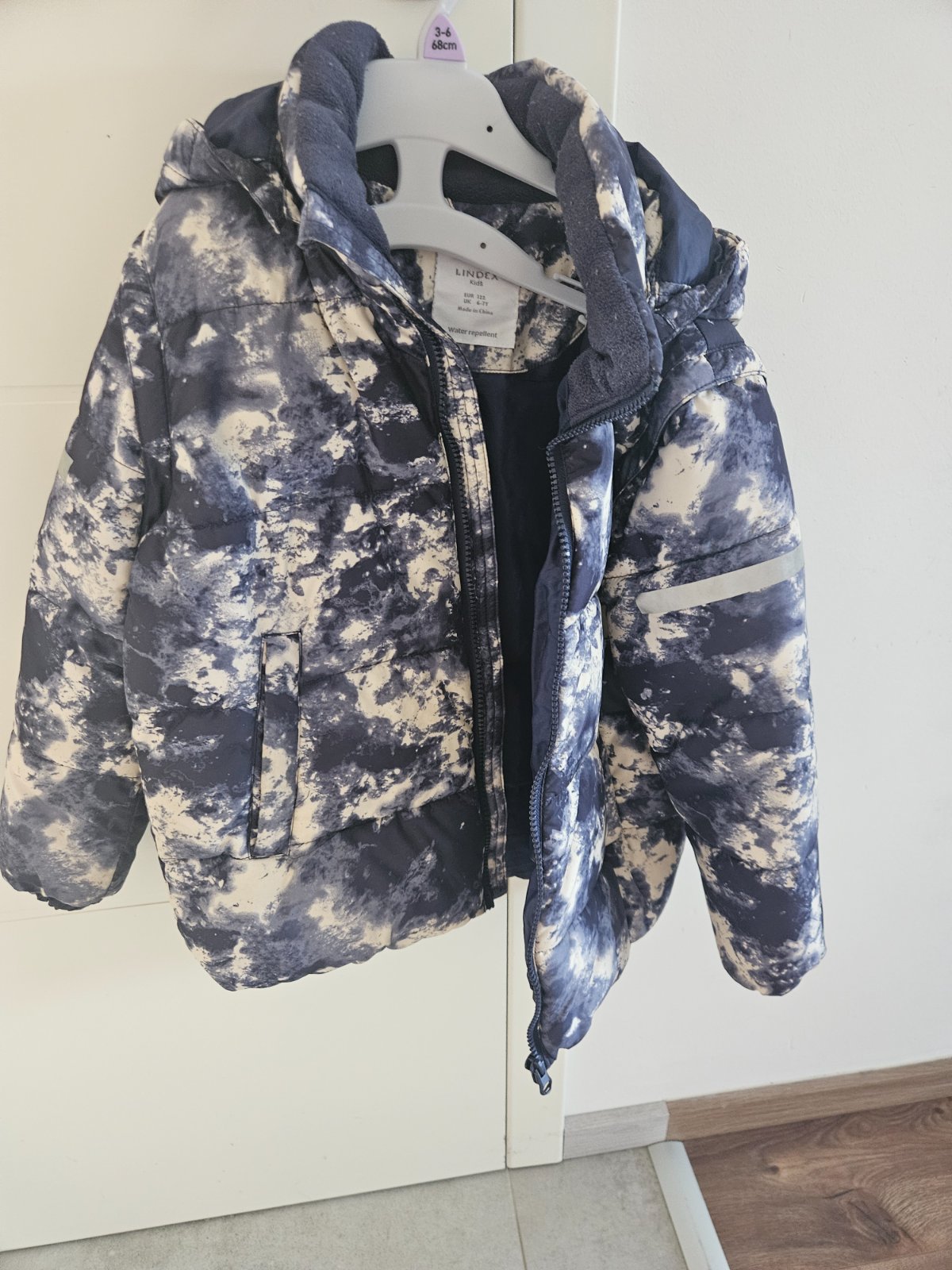 Krásna, malo nosená zimná bunda pripomína maskáčovú bundu, ale sú na nej autíčka., je teplá a má na rukávoch, vpredu a na kapucni reflexné prvky.