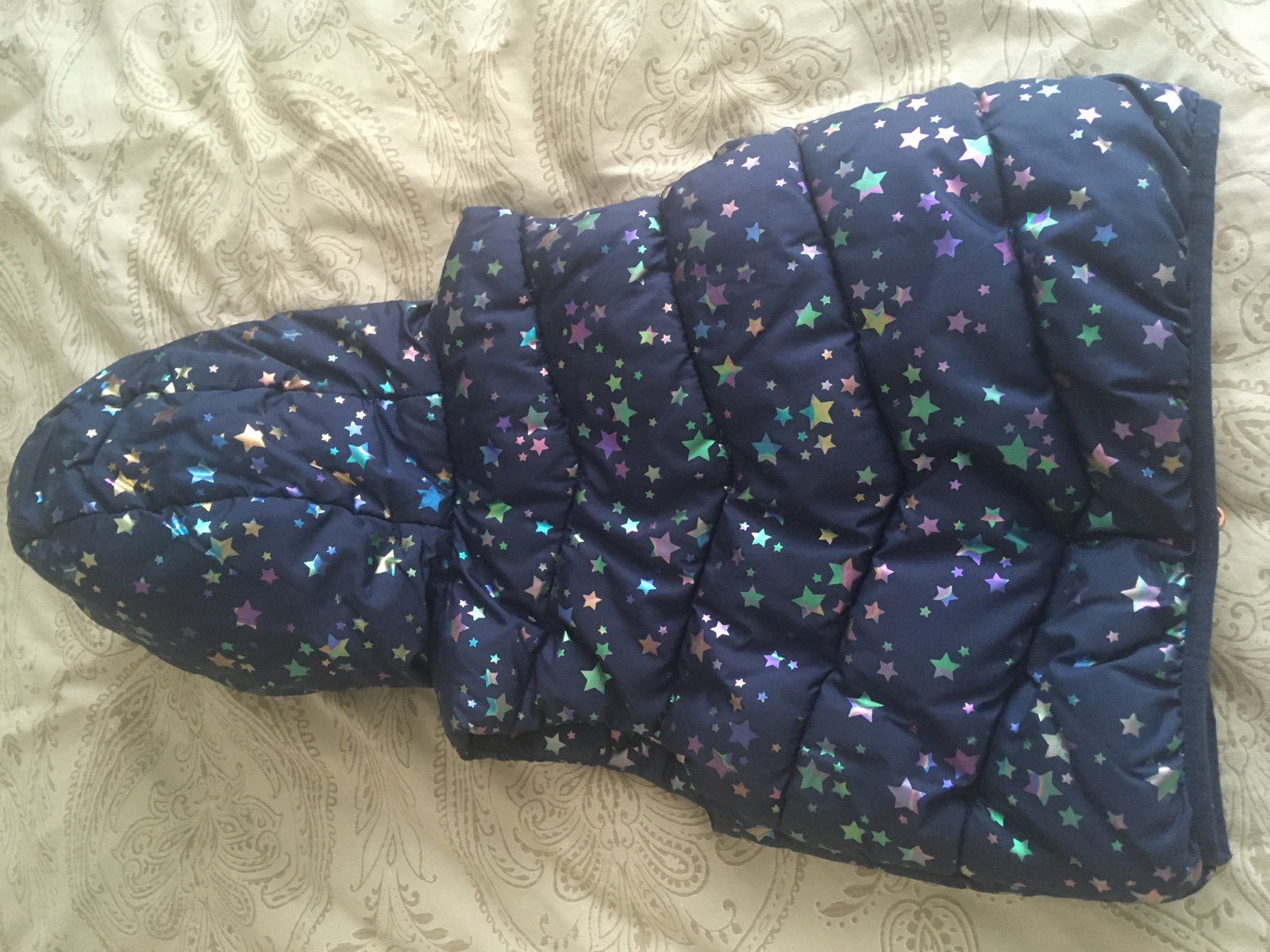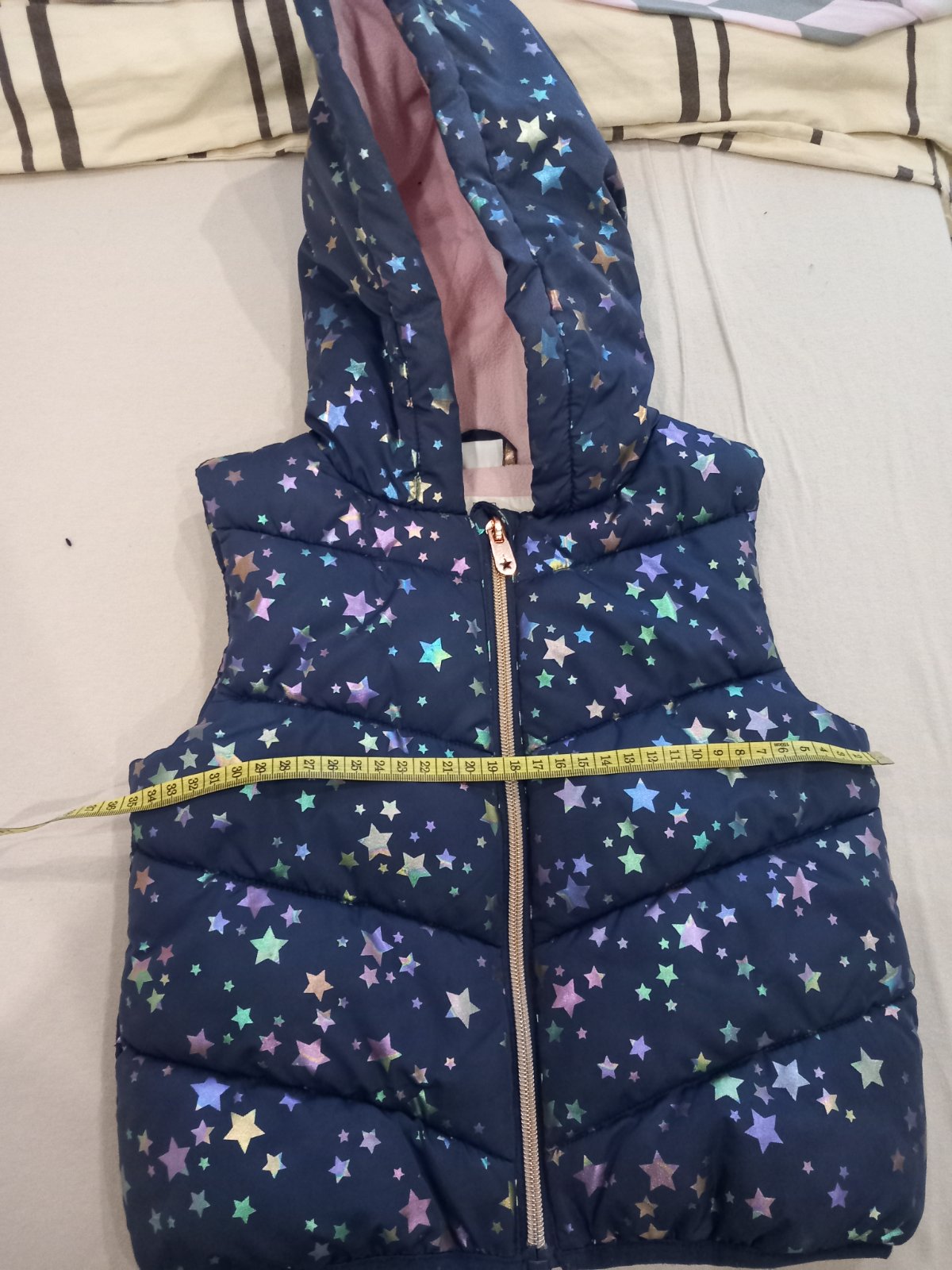 vesticka je vo velmi dobrom stave, bez poskodenia, kapuca je na pevno, dlzka 35cm, sirka 30cm, ale je taka natahovacia