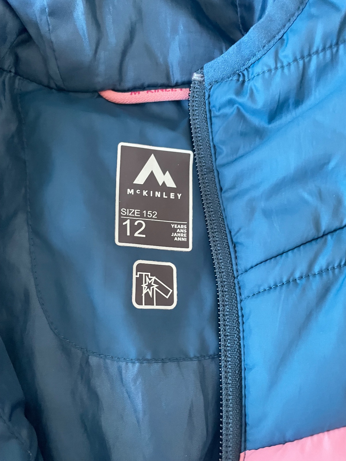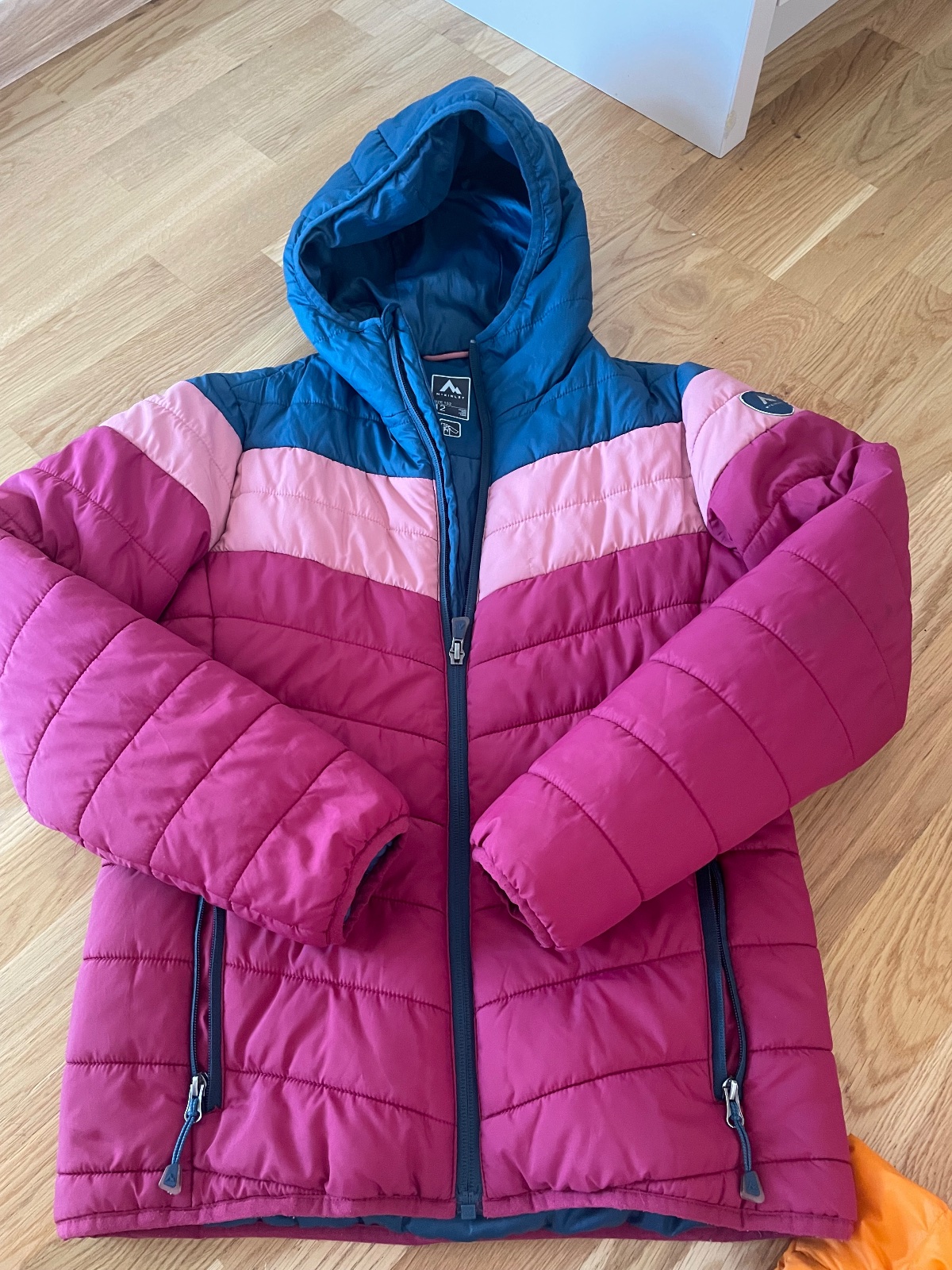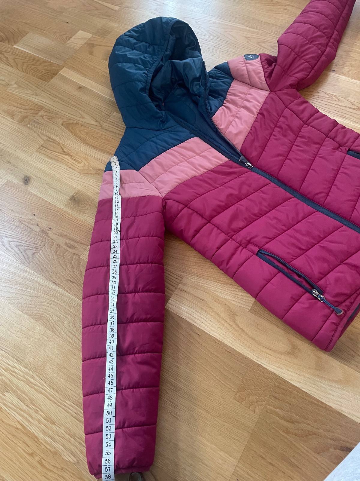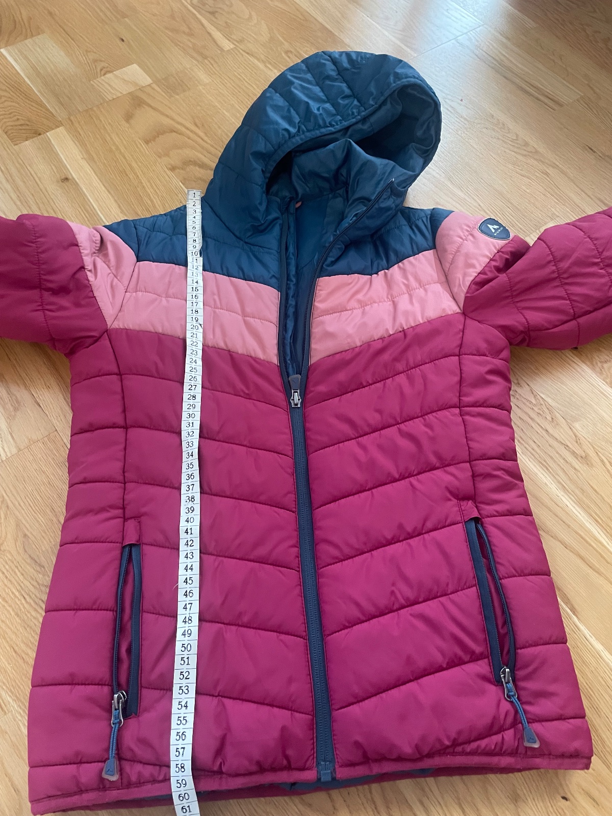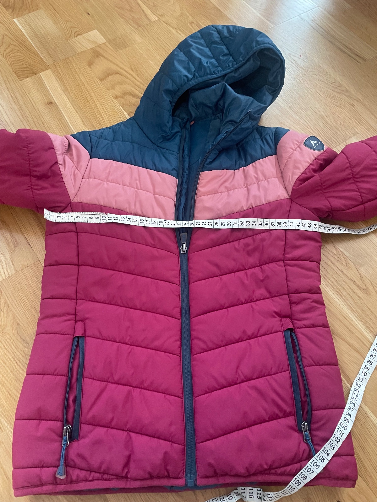 Mame z Kanady, prijemna funkcna bunda. Bezne znamky nosenia. Rukav od ramena 65cm, pod pazuchami 40cm, celkova dlzka 56cm. Na bunde je velkost 152, ale dcere bola pri vyske 152 uz mala, preto uvad...
