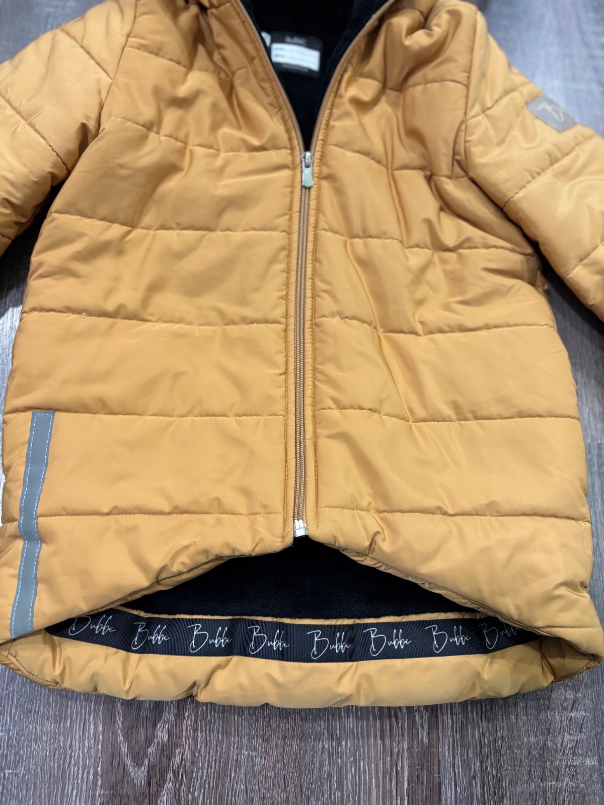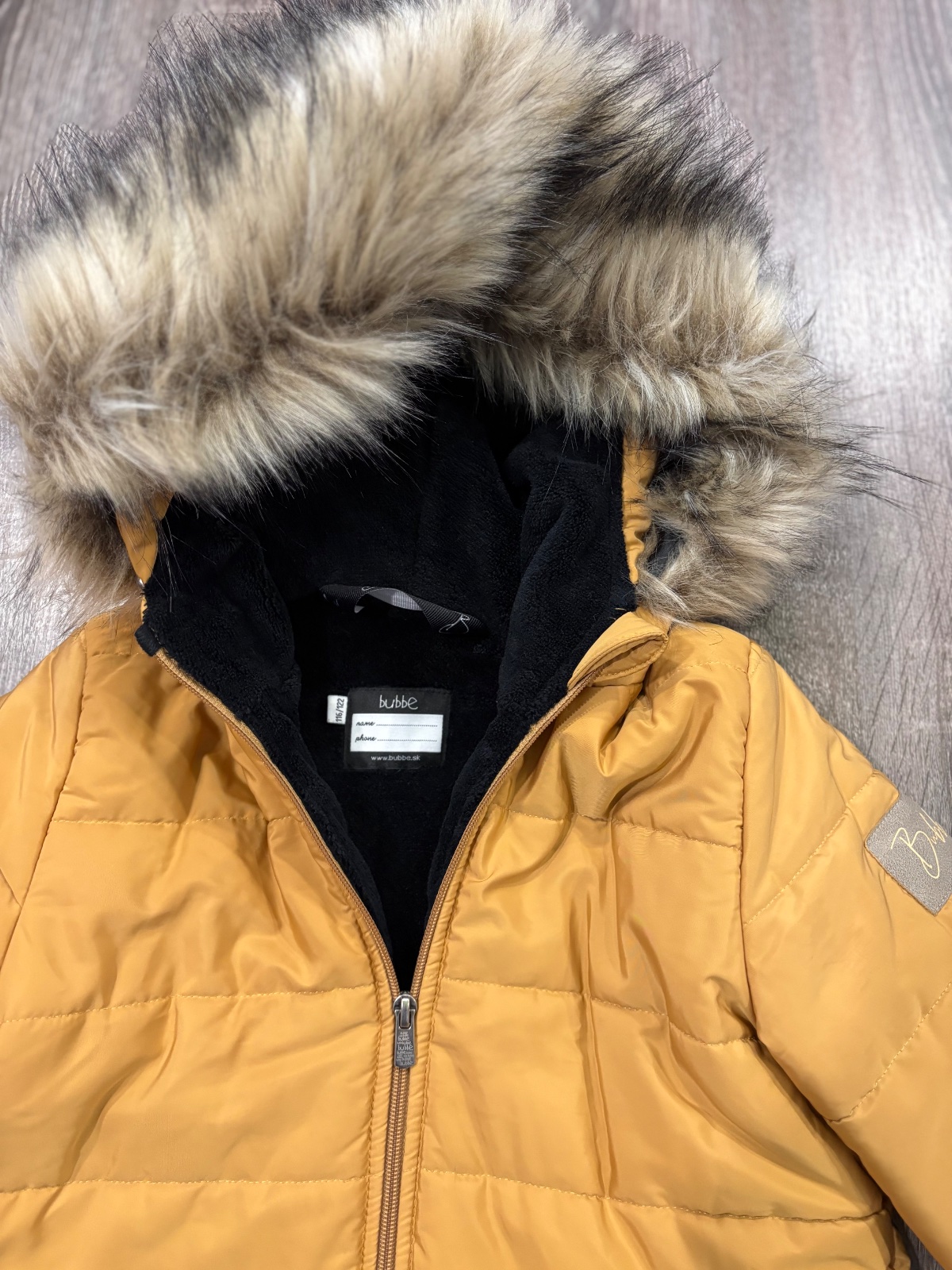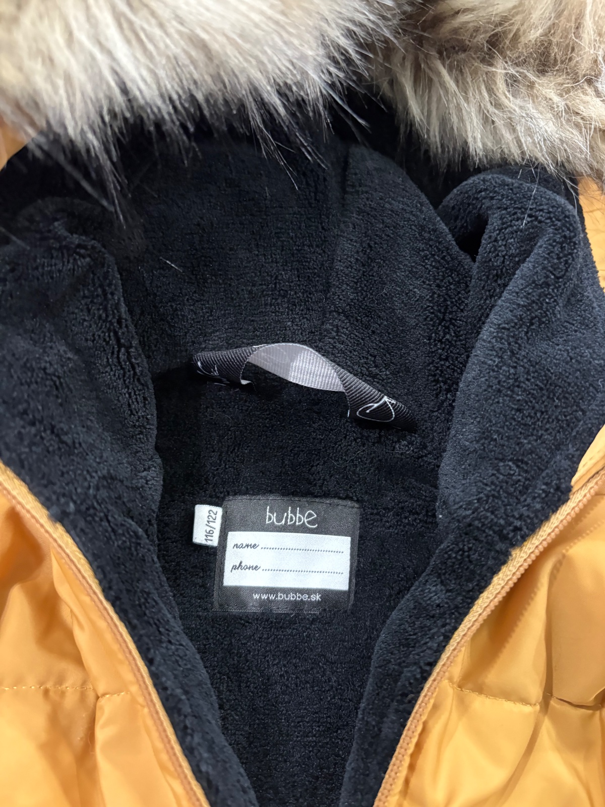 79.Bubbe zimna detska horcicova vetrovka s kozusinou na kapucni,ktora sa da odopnut,predlzeny strih,velkost 116/122.Super stav ako nová.Dlzka prednej casti je 54cm,zadnej je 63cm,dlzka rukava od krku je 54cm a sirka v podpazusi je 40x2cm