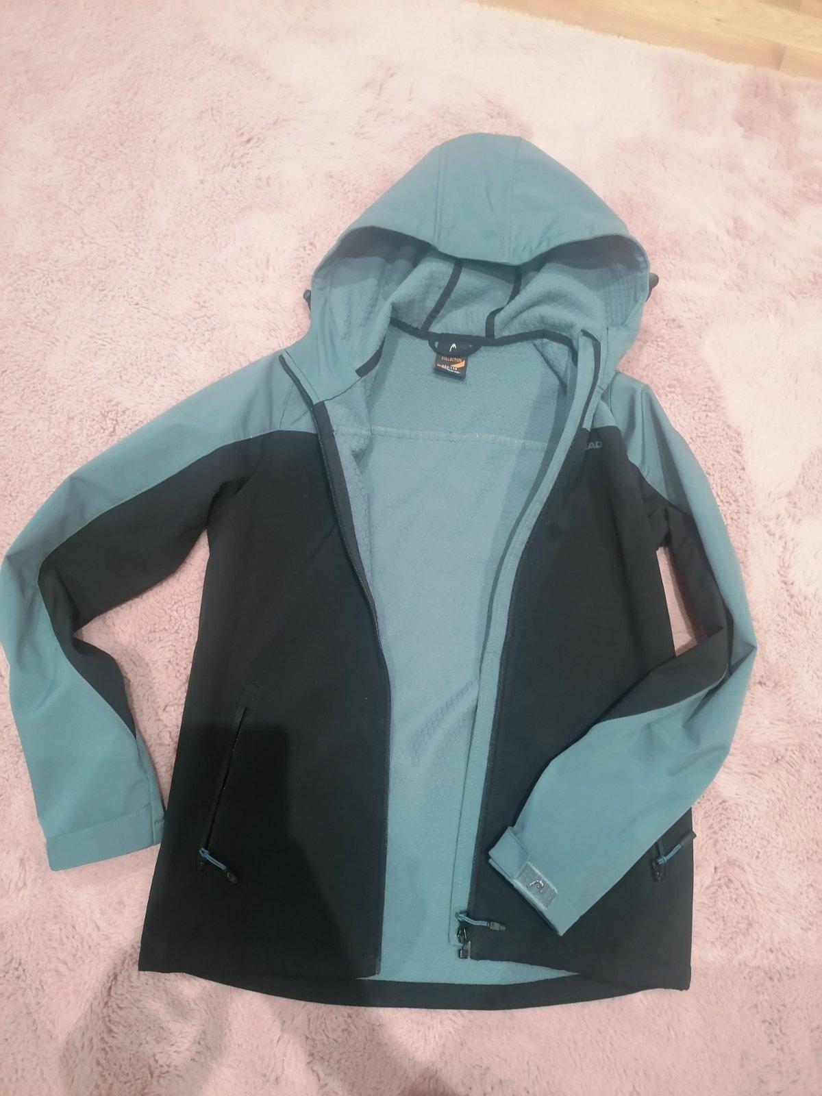 Minimálne nosena bunda, šedo tyrkisova farba v kombinácii s čiernou, kupovaná v sportisime, značka HEAD, veľkosť 152/158, užší strih
