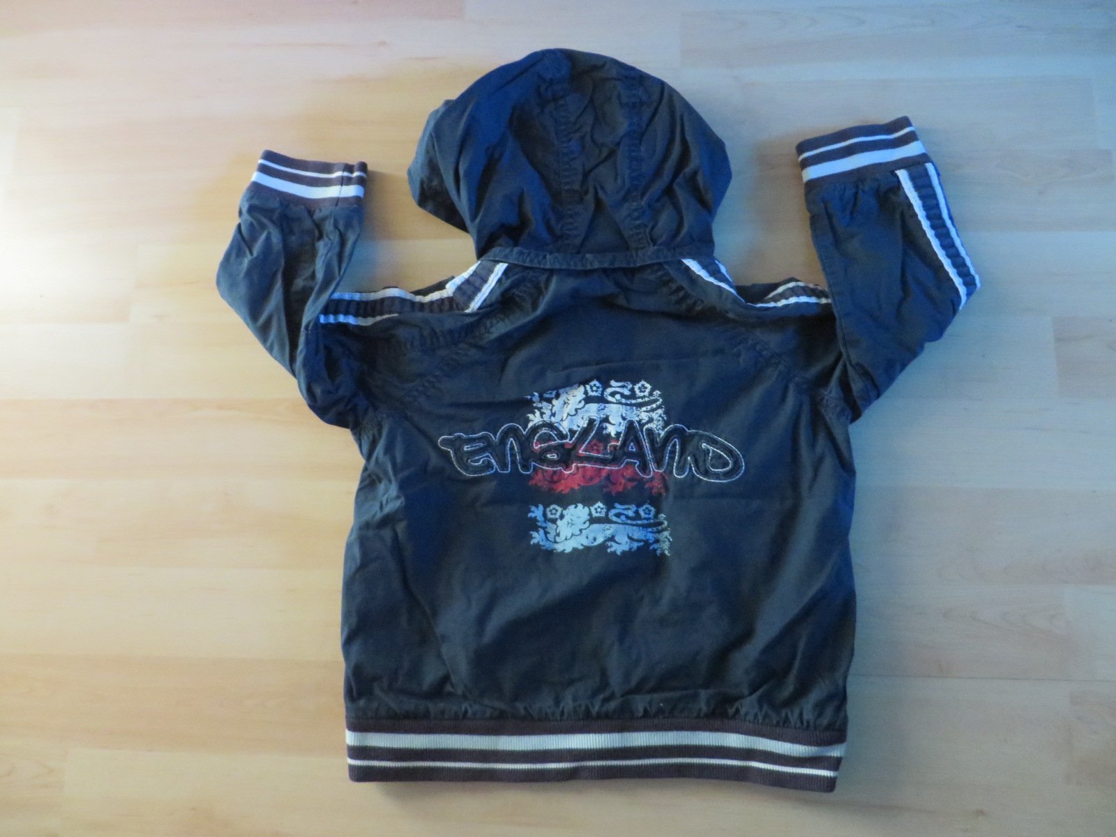 Predám nosenú chlapčenskú frajerskú bundičku, veľ. 86/92. Vnútro je bavlnená tričkovina. Farba sýtotmavomodrá, na chrbte s vyšitým nápisom ENGLAND.