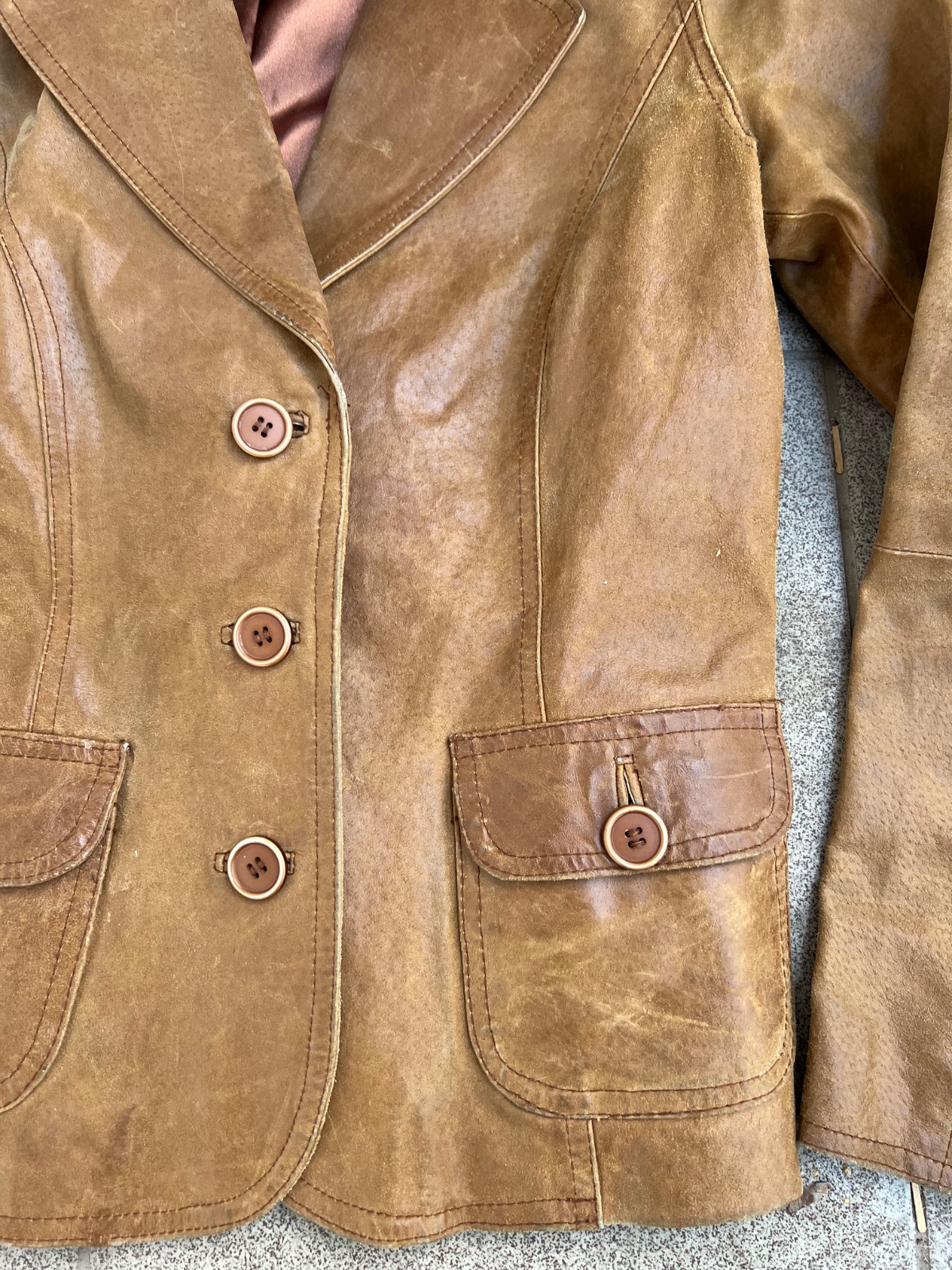 Kozene sako z pravej koze velk 36/S bezne znamky nosenia na kozi, male poskodenie rukav preto 19,50€