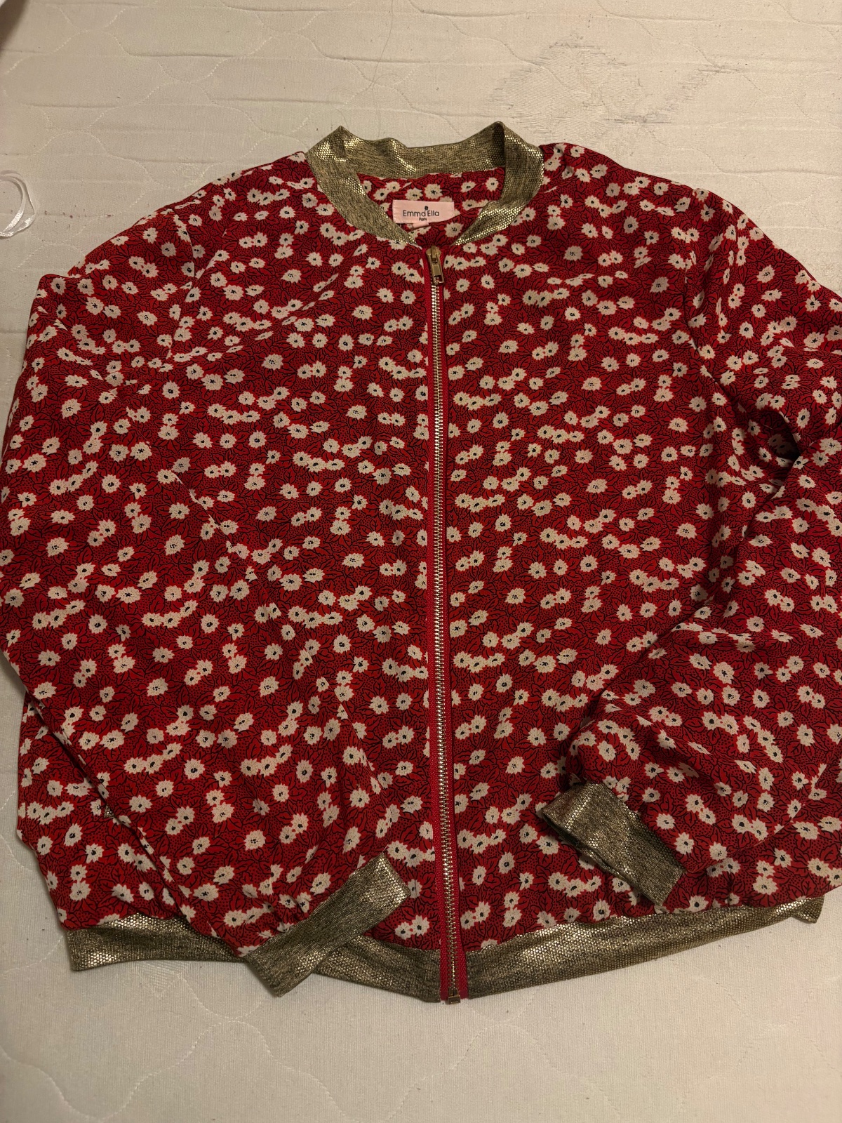 Dámsky kabátik červenej farby, zapínanie na 7 gombíkov, opasok, 2 náprsné vrecká, 2 bočné vrecká. Málo používané, top stav.