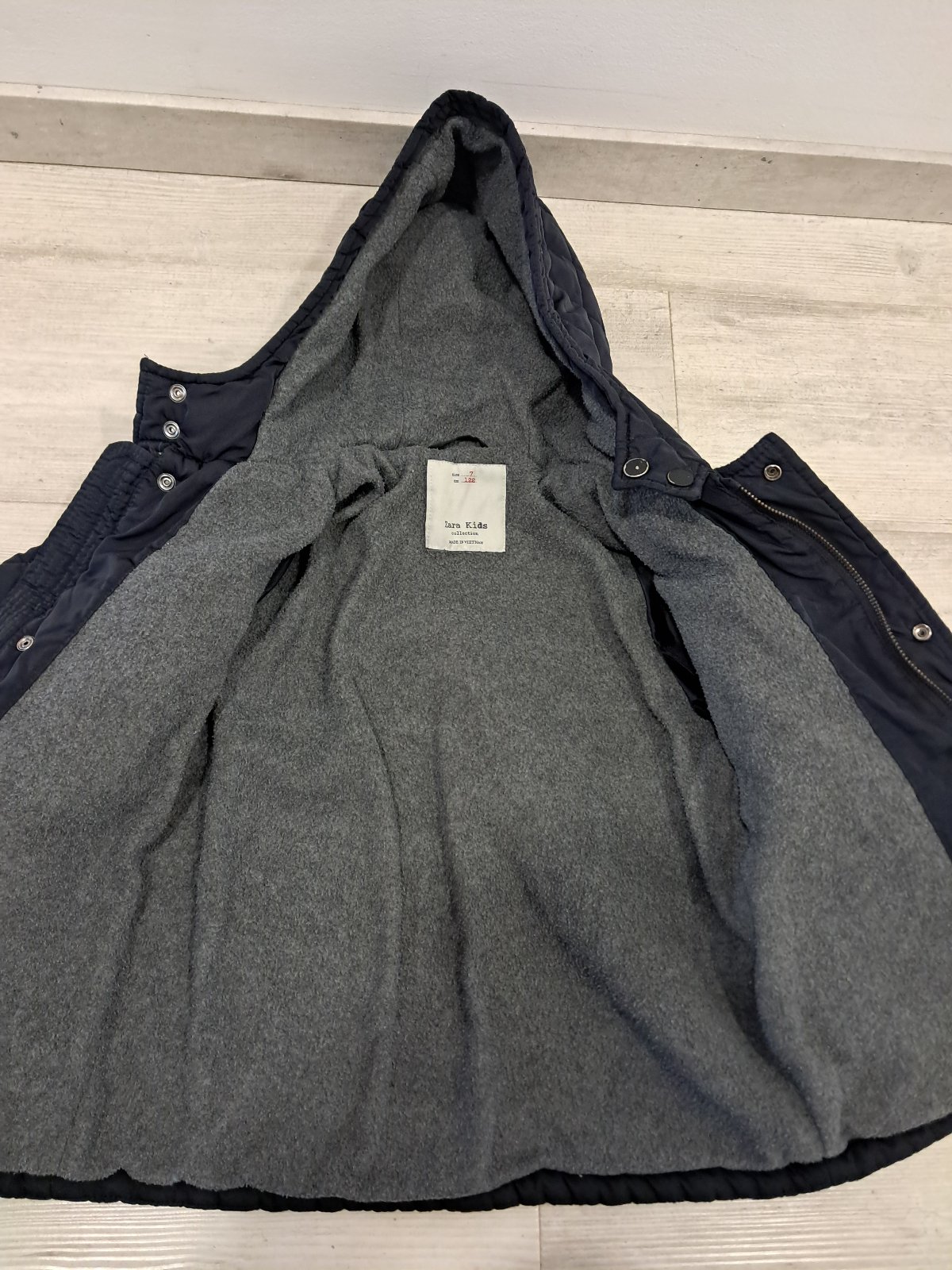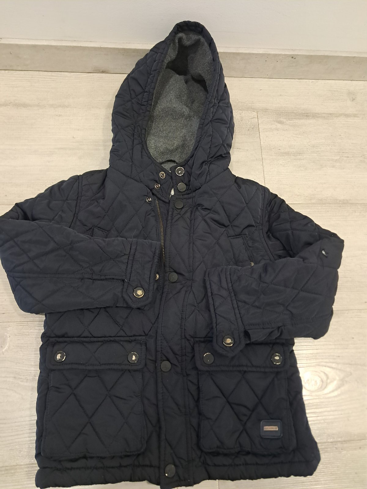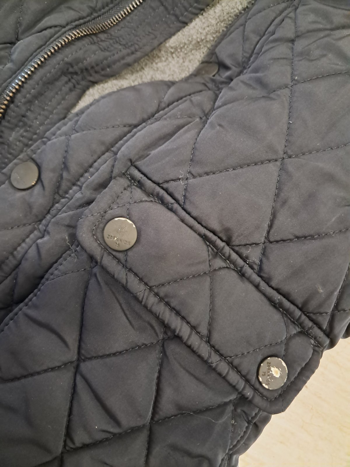 Predám tmavomodrú/čiernu zimnú bundu, veľ. 122, zn. ZARA, pre 6-7 rokov, s neodnímateľnou kapucou. Poškodenie: cvoky na zapínanie majú olúpanú farbu (viď foto), preto je bundička vhodná už len na donosenie okolo domu.