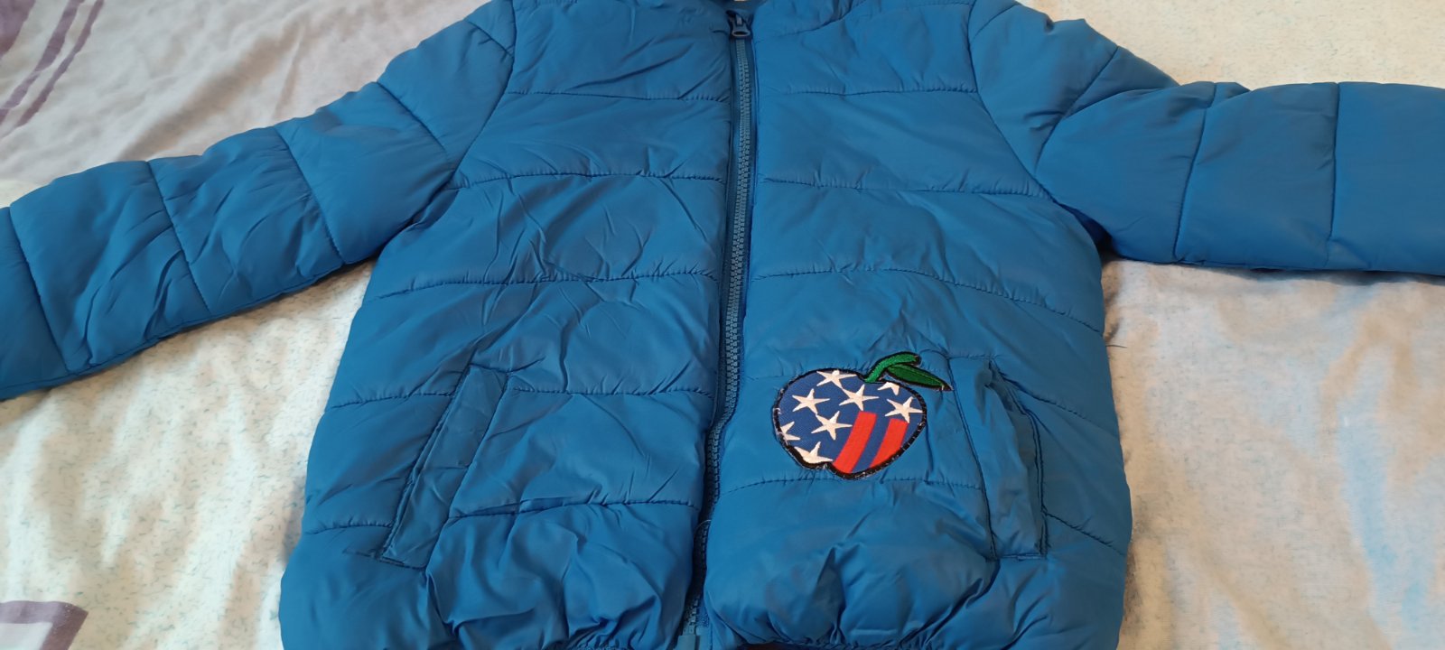 Zachovalá bunda, už s nazehlovackou, inak bez dier a fľakov. Veľkosť 110.