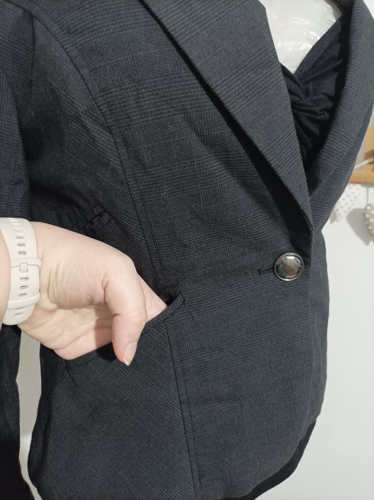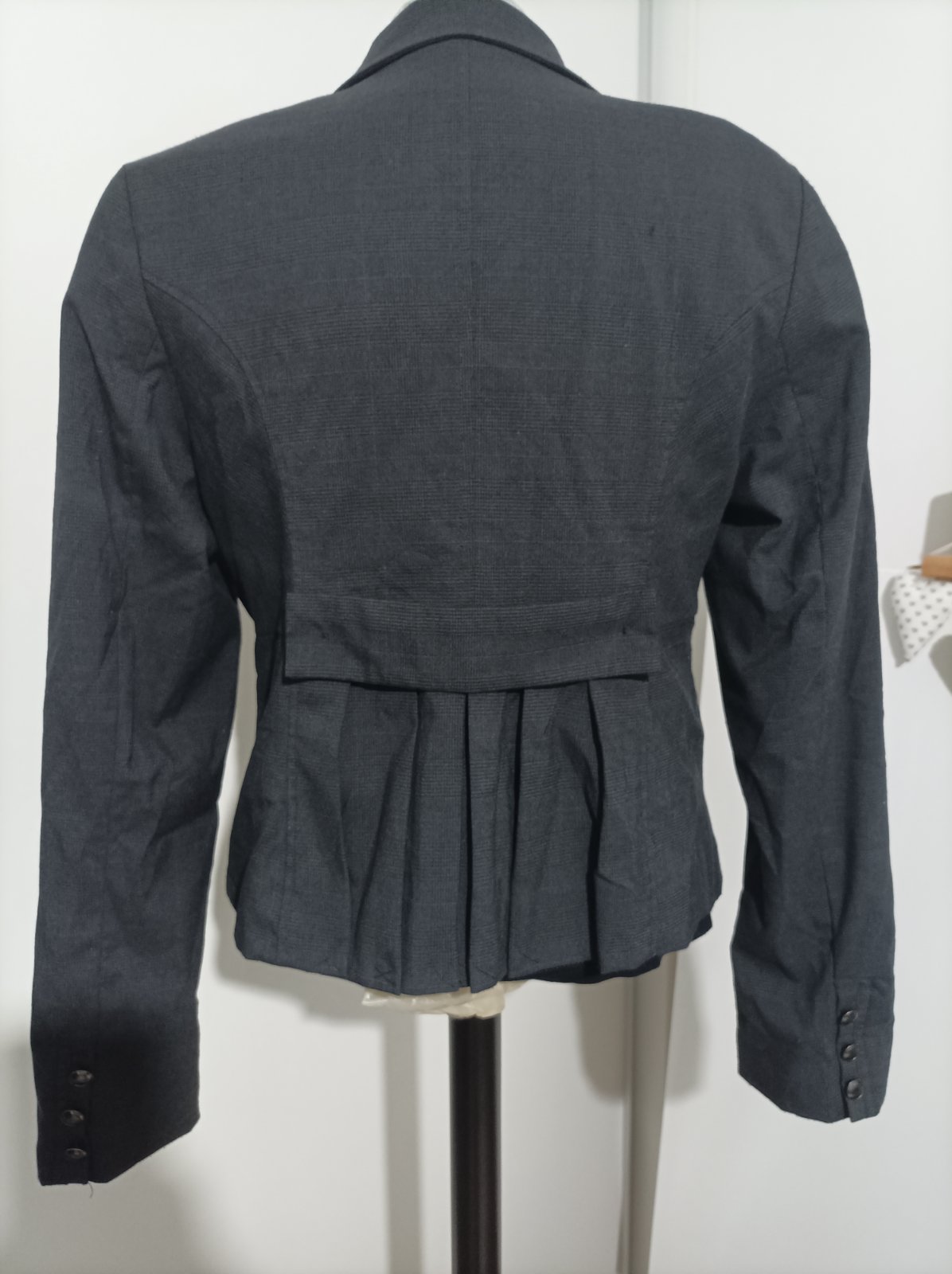 Tmavosede karovane sako, zapínanie na gombík, na rukávoch manžetové gombíky , vzadu preskladanie. Je to klasika, nosené máličko, super stav, treba trošku napariť alebo vyžehliť ( ja to budem robiť teraz zbytočne lebo je odložené vo vakuovom vreci z dôvodu nedostatku miesta )