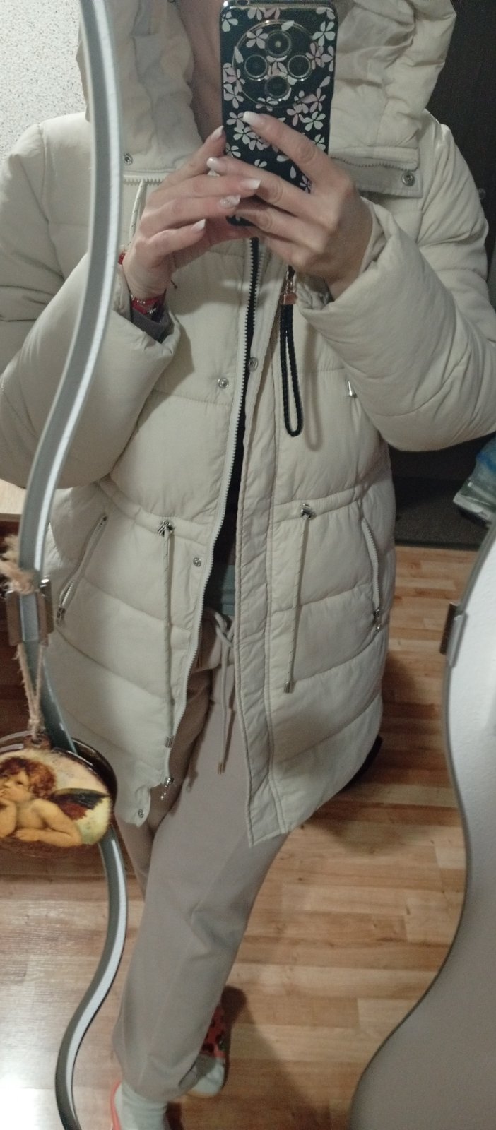 Oblečená raz, off white, krásna bunda s plastickým vzorom, zlaté kovy, stahovanie v páse šnúrkou, veľký golier, 50%plnená perím, veľkosť 44,skôr 42,šírka pod pazuchami 56 cm, dĺžka 65 cm