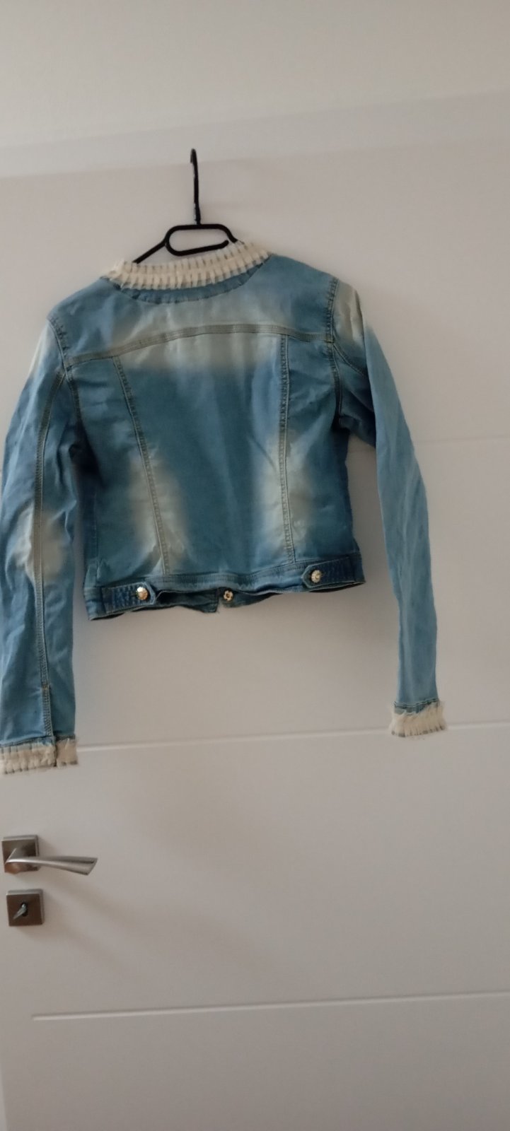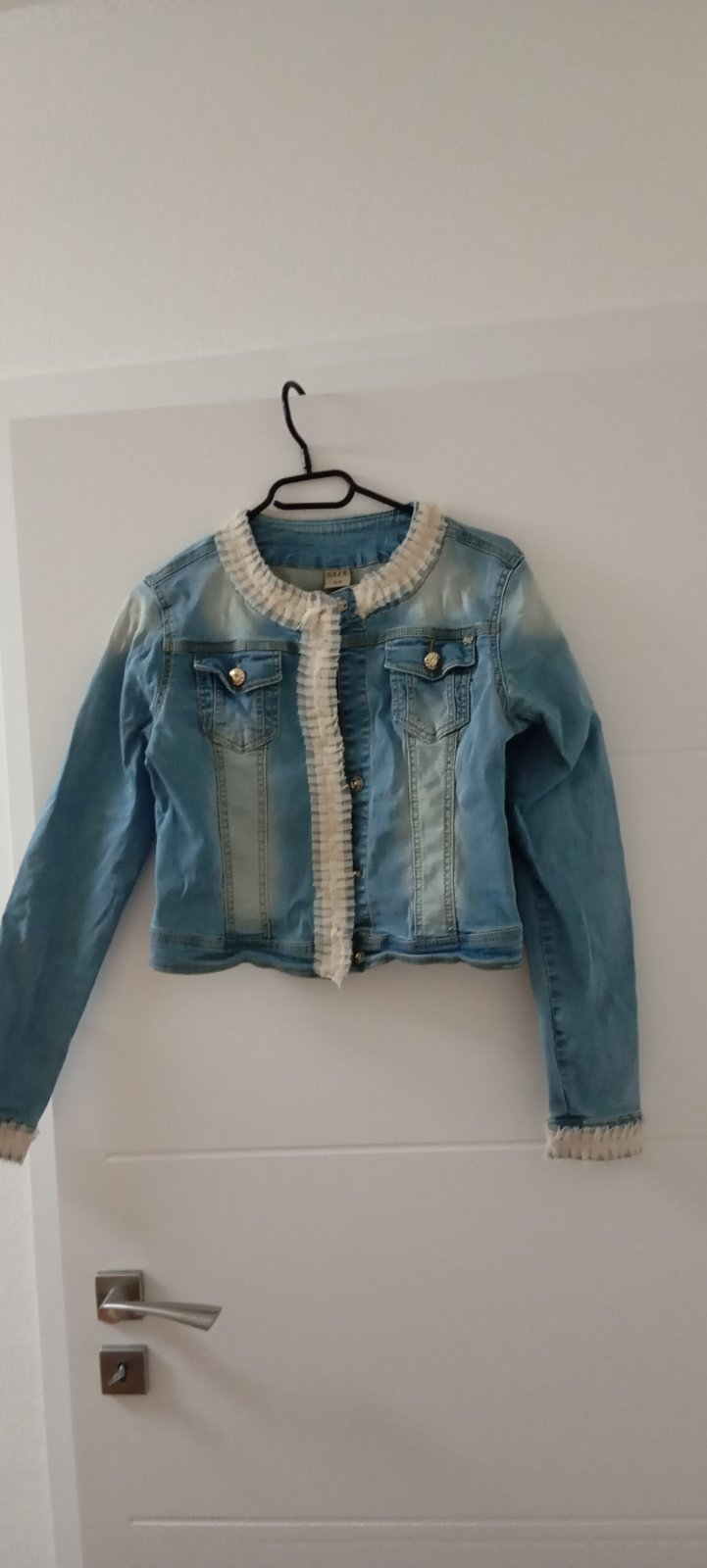 Predám riflovku vo výbornom stave . Zdobená tylovou béžovou výšivkou.Elastická šírka cez prsia 40 cm, Rukáv od ramena 60 cm,od krku 70 CM.