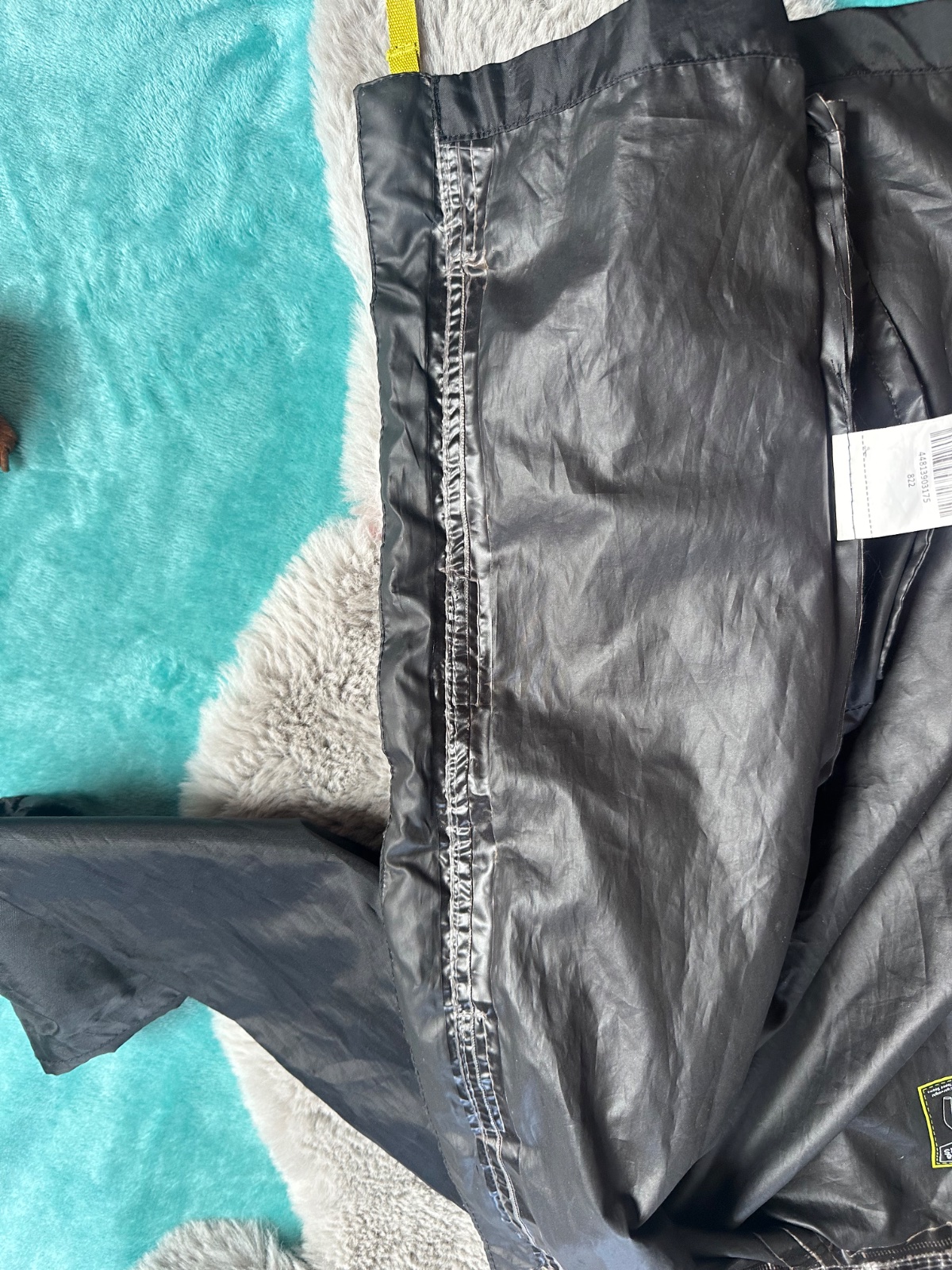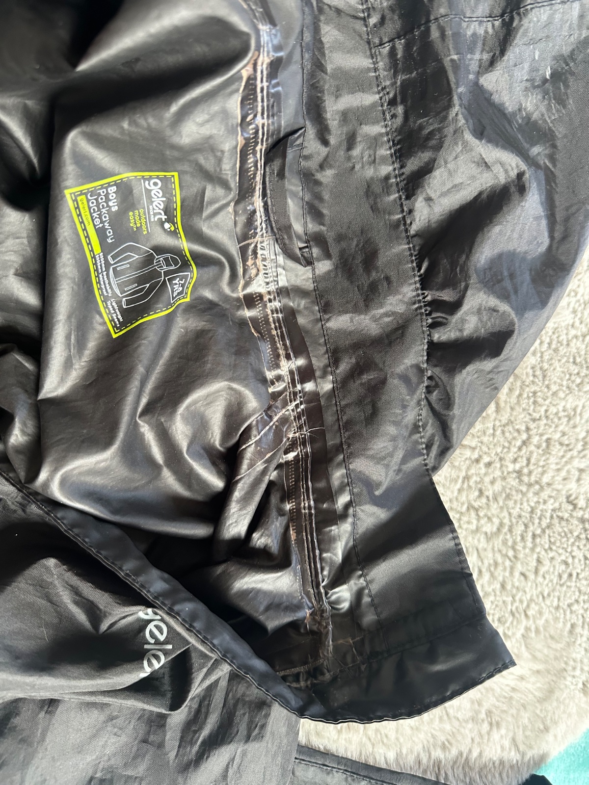 nosena, zvonka bez poskodeni, vo vnutri- nafotene vidno znamky nosenia, nie je to vsak poskodenie ani to na funkcnosti nic nemeni, len bundicka dlhsie stala a bola viac nosena.
