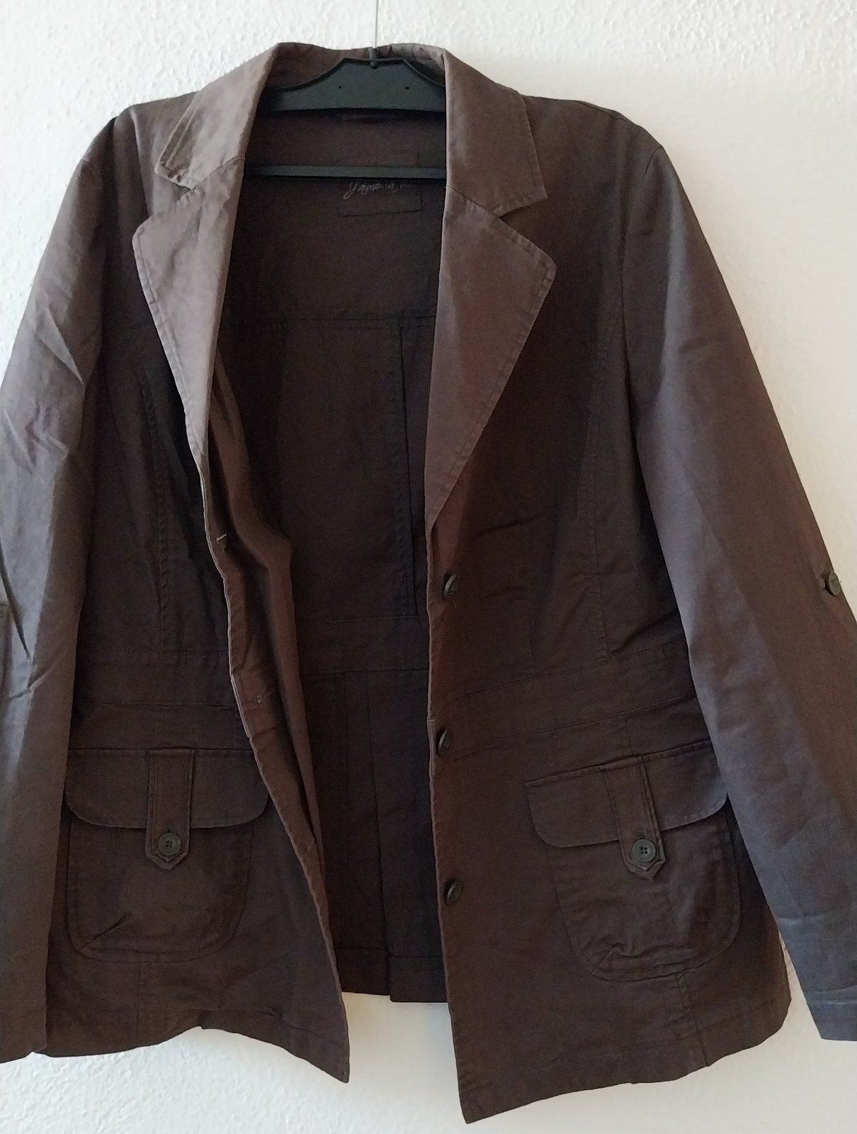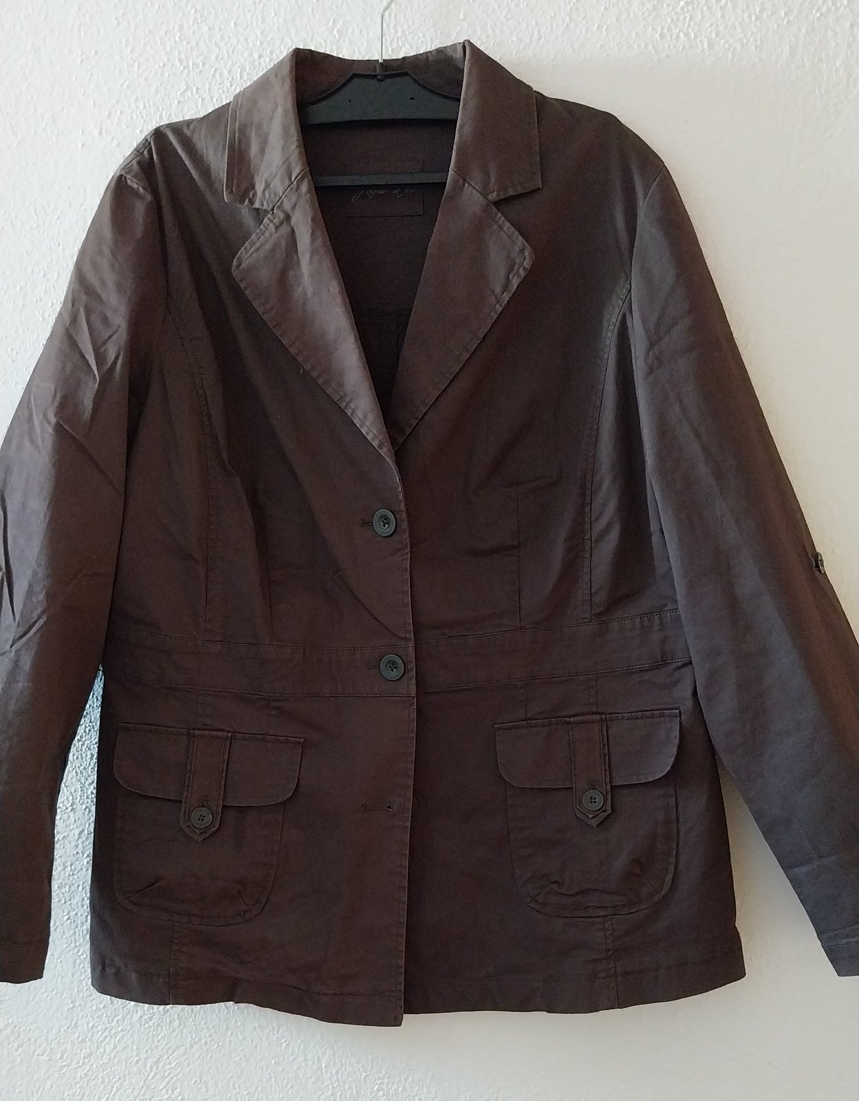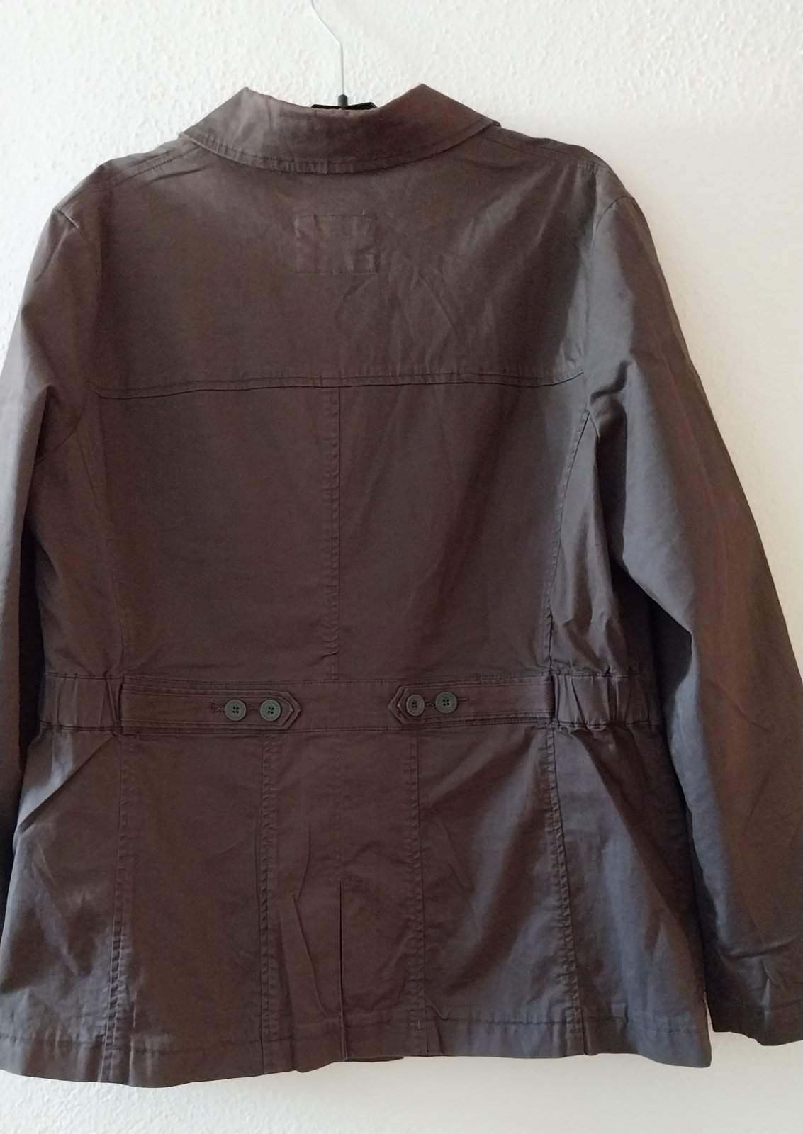 Hnedý jarný/jesenný kabátik, pekná hnedá farba. Rukávy sa dajú zrolovať. Vzadu sa dá stiahnuť - sú tam gombíky. Podšitý. Pevná bavlna.