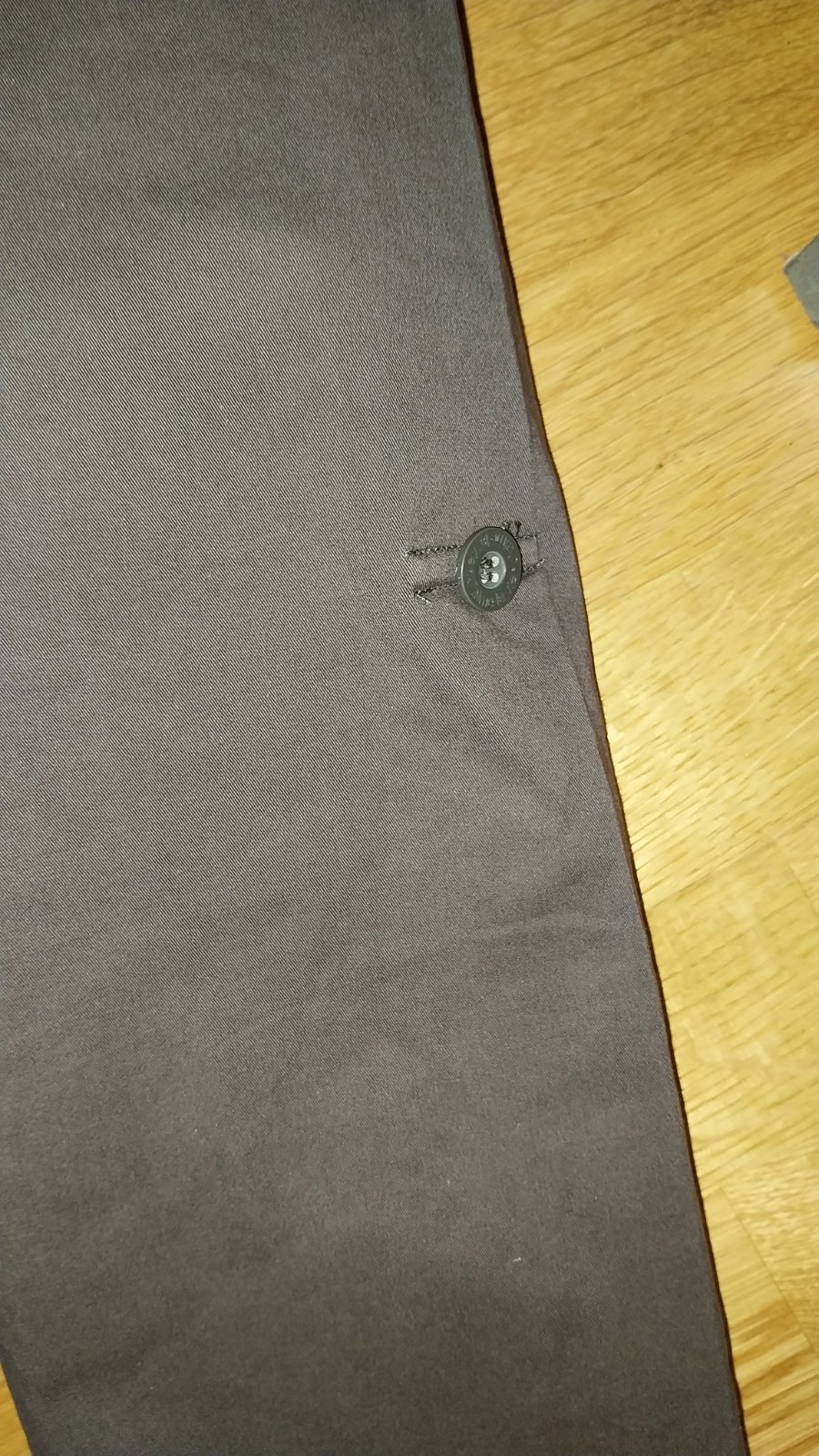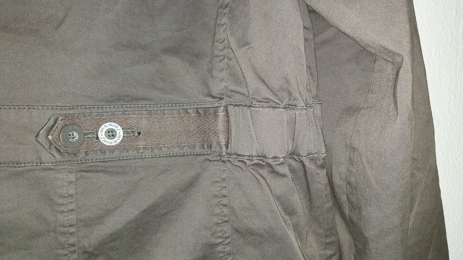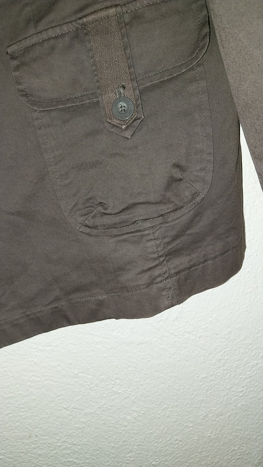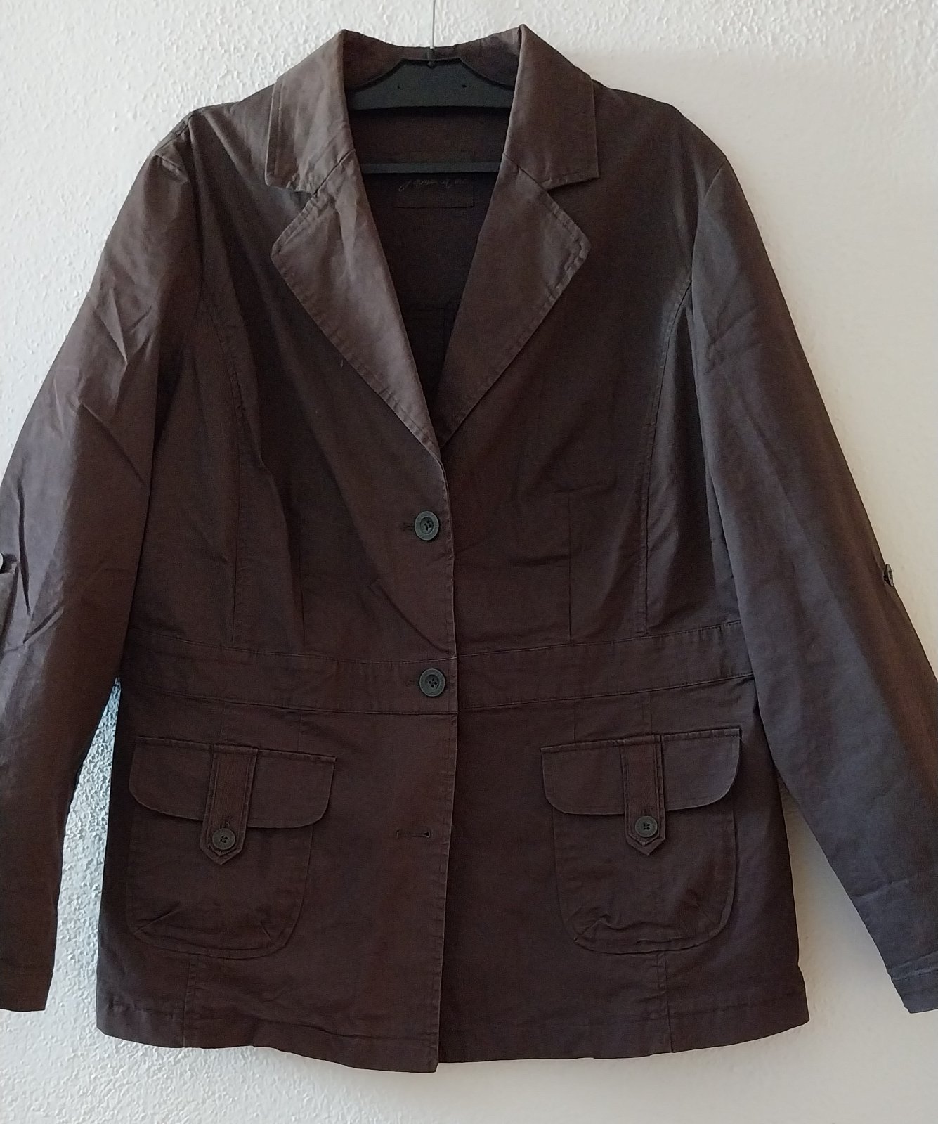 Hnedý jarný/jesenný kabátik, pekná hnedá farba. Rukávy sa dajú zrolovať. Vzadu sa dá stiahnuť - sú tam gombíky. Podšitý. Pevná bavlna.