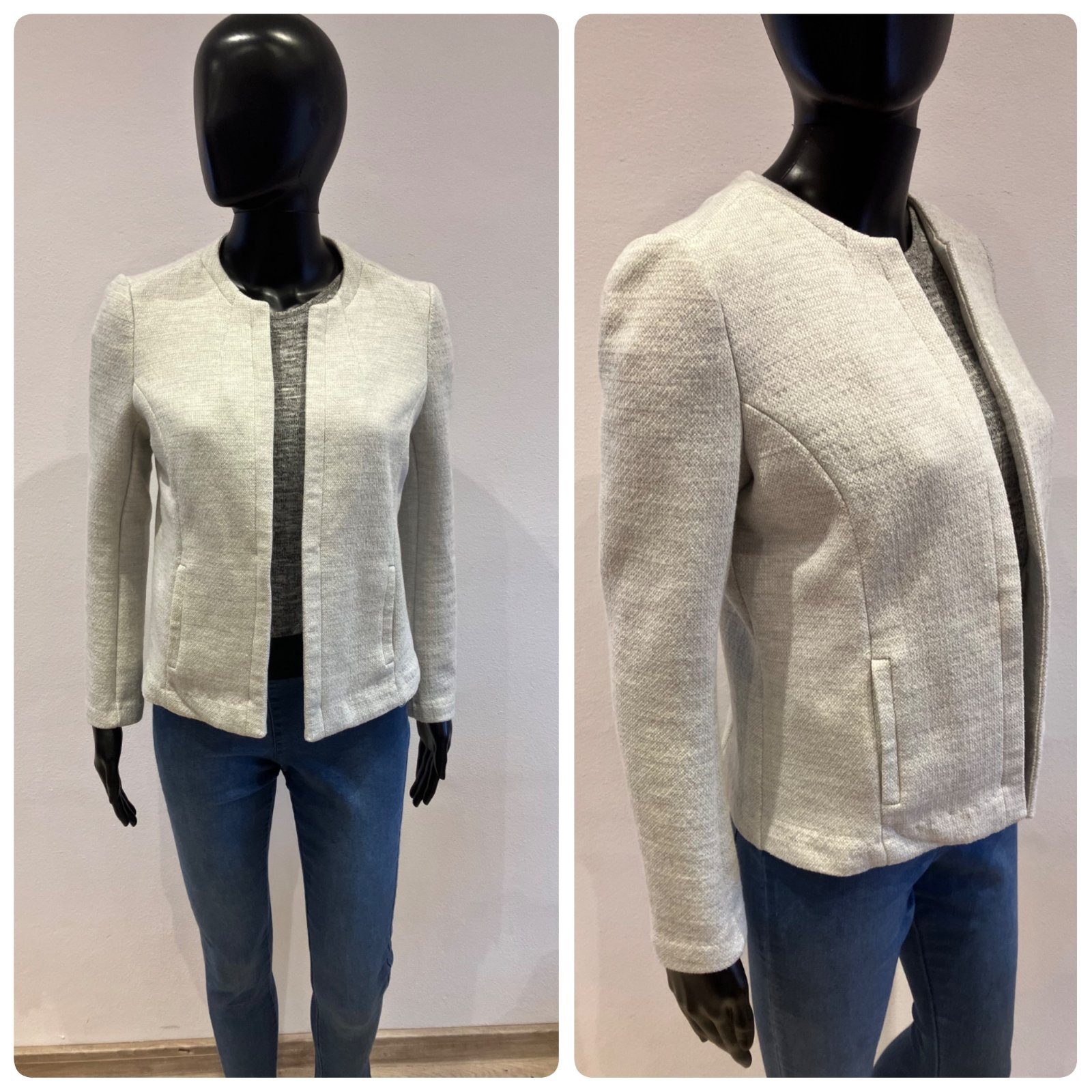 Dámske sako, sivo-biele, hrubšie, elastické, materiál 58%polyester 38%bavlna 4%elastan.
