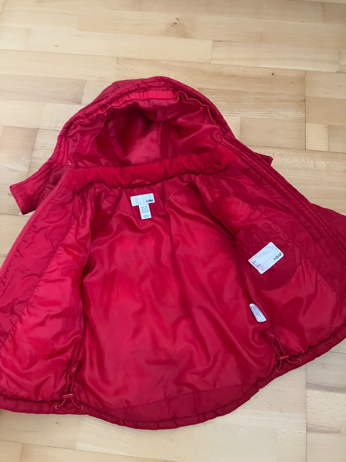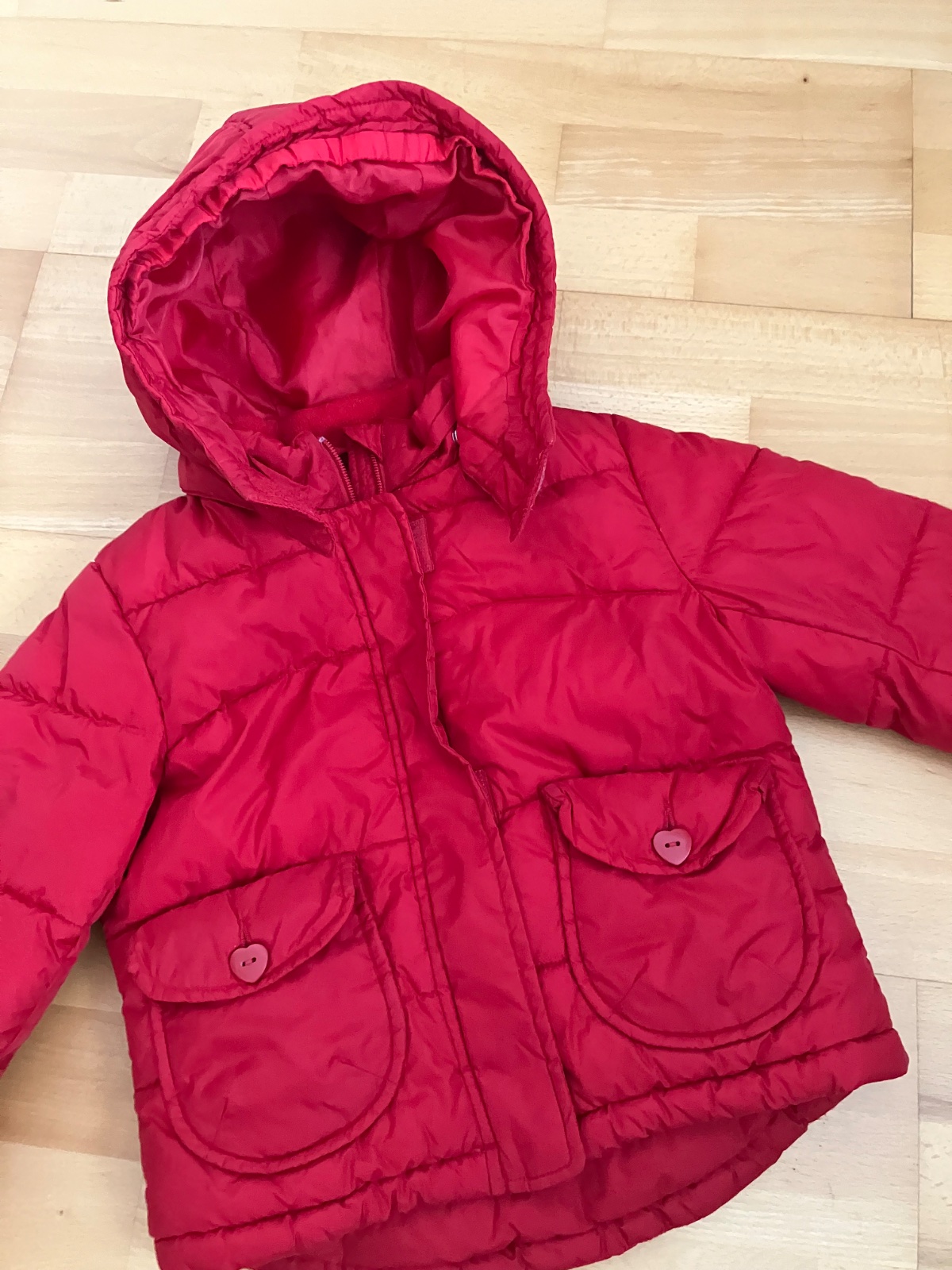 Kvalitná bundička v super stave, krásna sýta červeno-ružová farba, nejde zachytiť. Predĺžený strih. Písaná veľkosť 104, ale kľudne sedí 110, je väčšia.