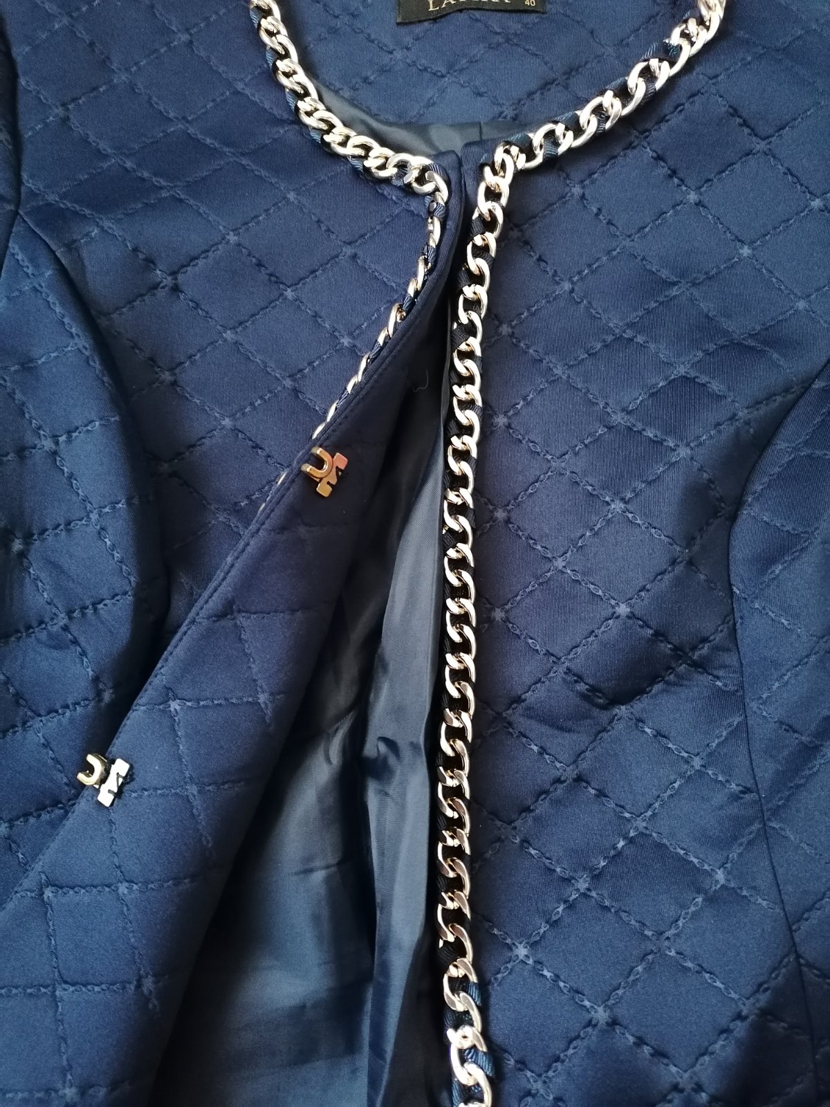 Nádherné tmavomodré sako, spredu zdobené zlatou retiazkou, zapína sa na cvoky (na foto). Velkost písaná 40,ale sedí pekne aj na 38. Dĺžka 56 cm, šírka 41 cm. Malo nosene, príležitostne, bez chyb.