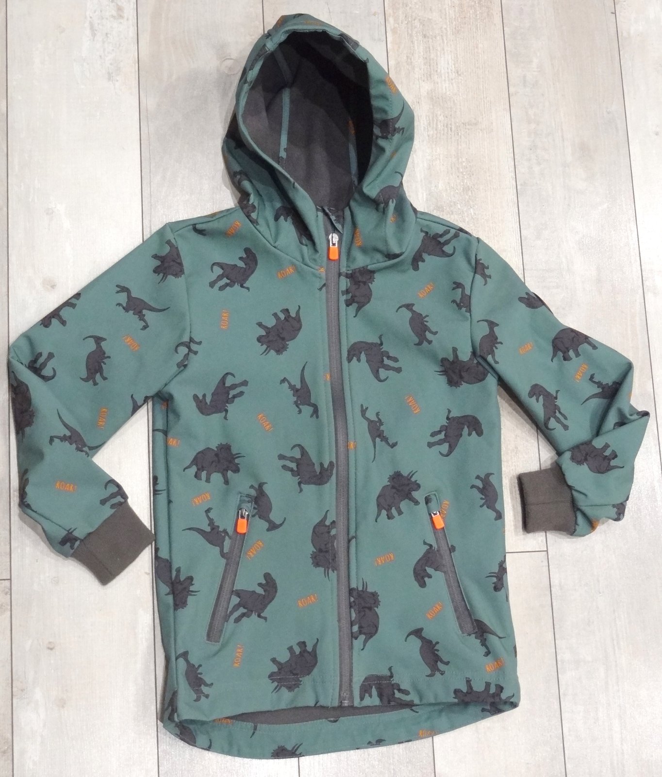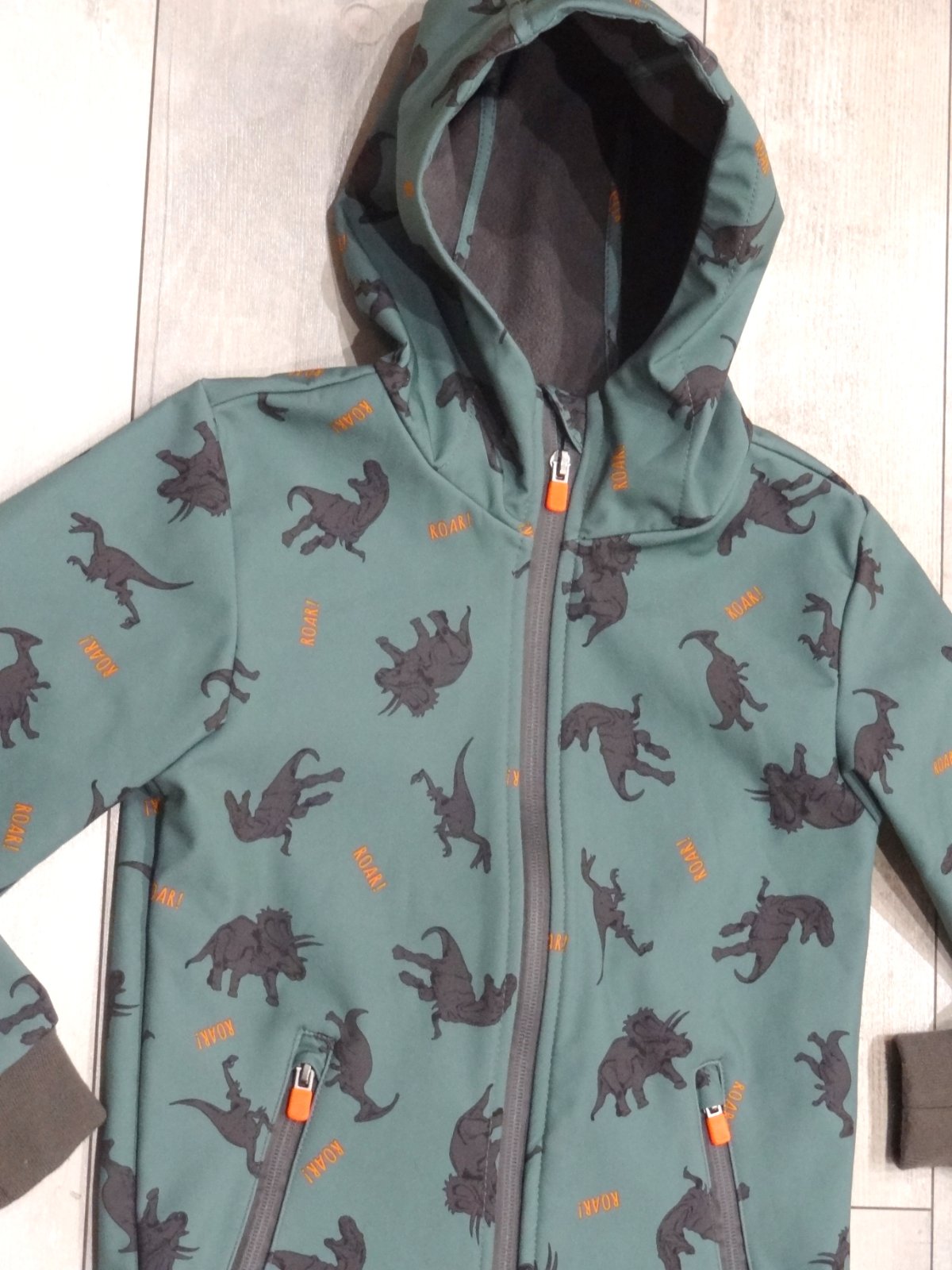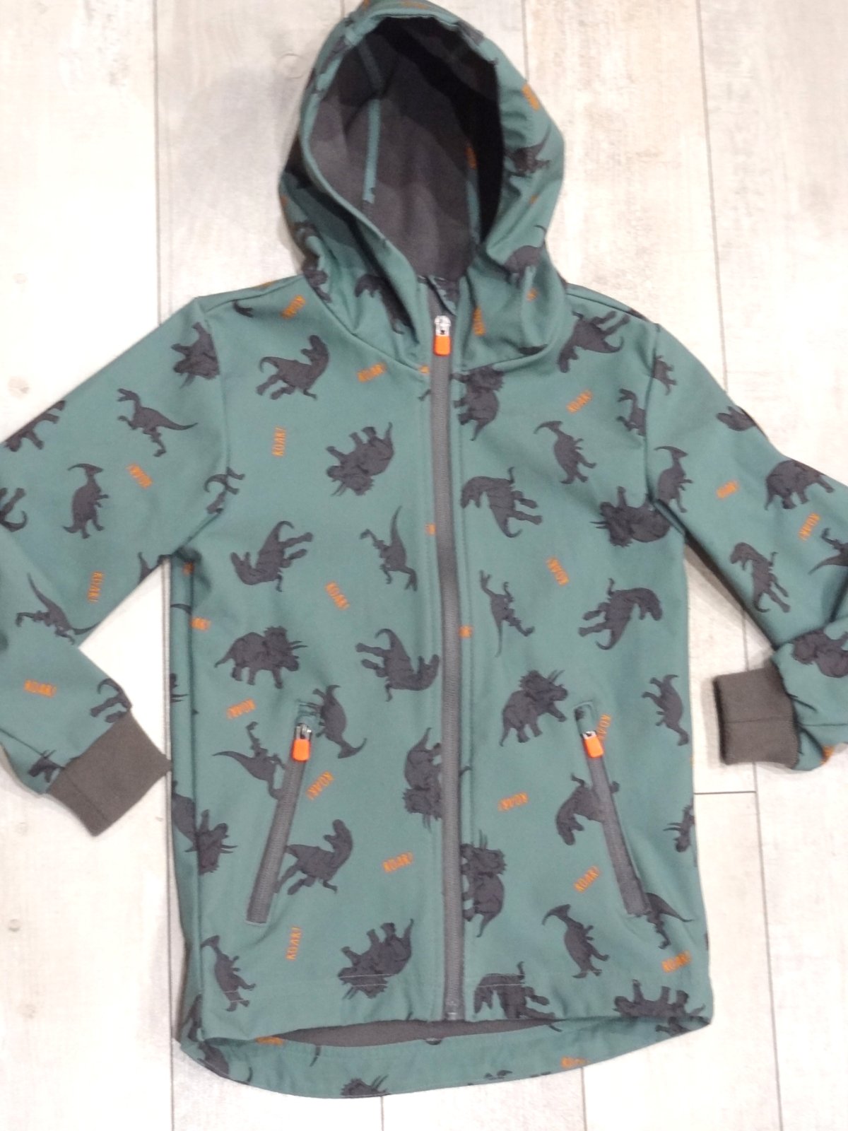 Softshellová vetrovka bunda s dinosaurami *** zapínanie na zips *** s vreckami a kapucou *** výborný stav *** značka: DOPODOPO *** veľ. 128 (7-8 rokov), predná dlžka 50 cm, zadná dlžka 55 cm, šírka pod pazuchami 36 cm