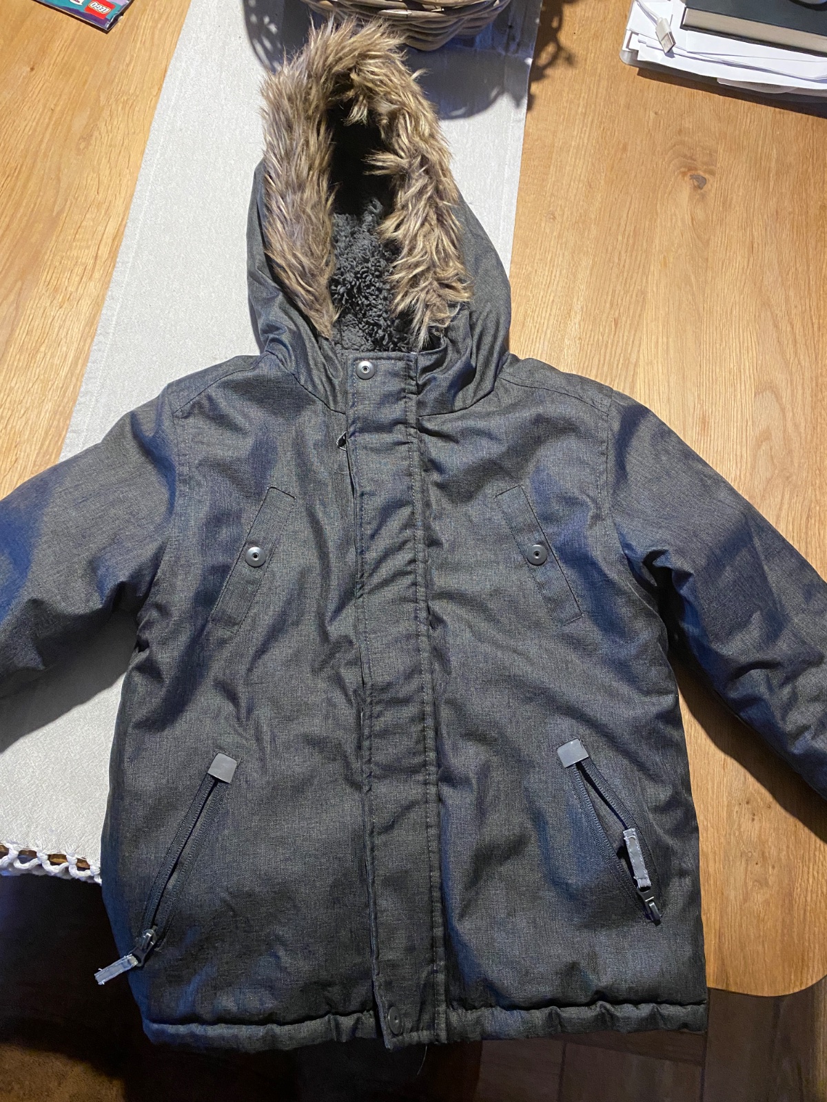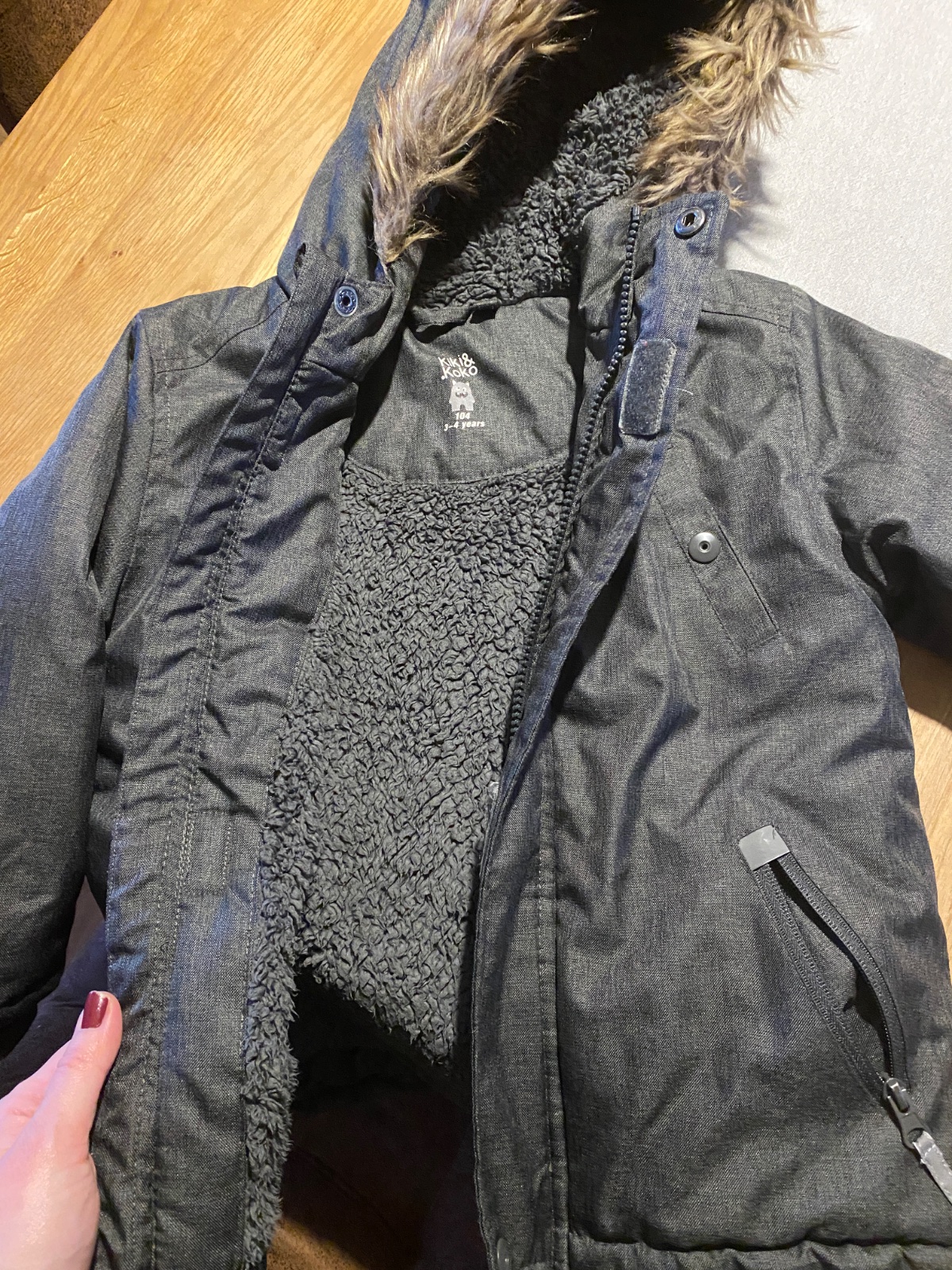 Zimná bunda / parka s kožušinkou, kiki&koko, 104, nosená, ale v peknom stave, jediné chybičky sú, že chýba horný cvok, už sme tak kúpili, nevšimla som si to a vôbec to neprekáža, viď foto a škraban...