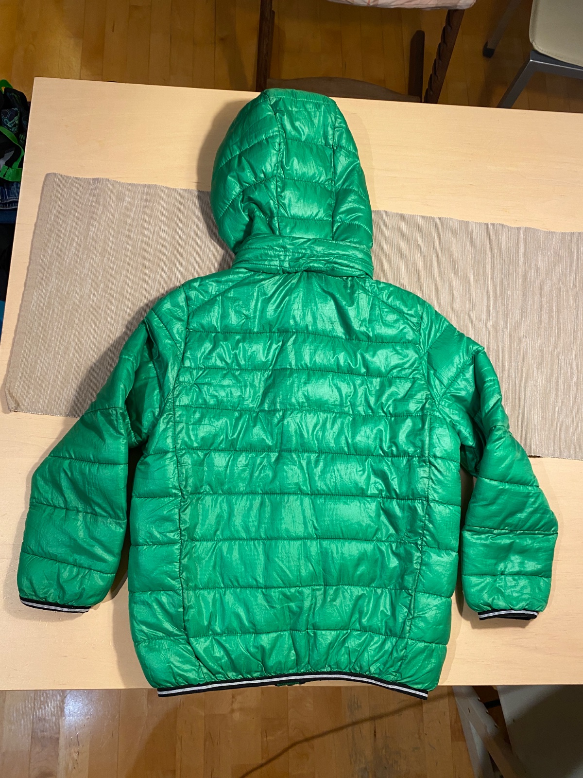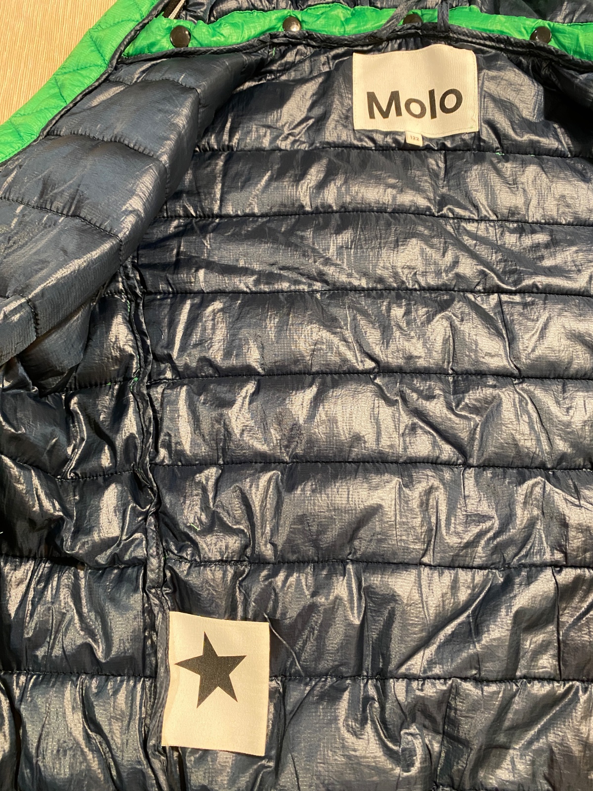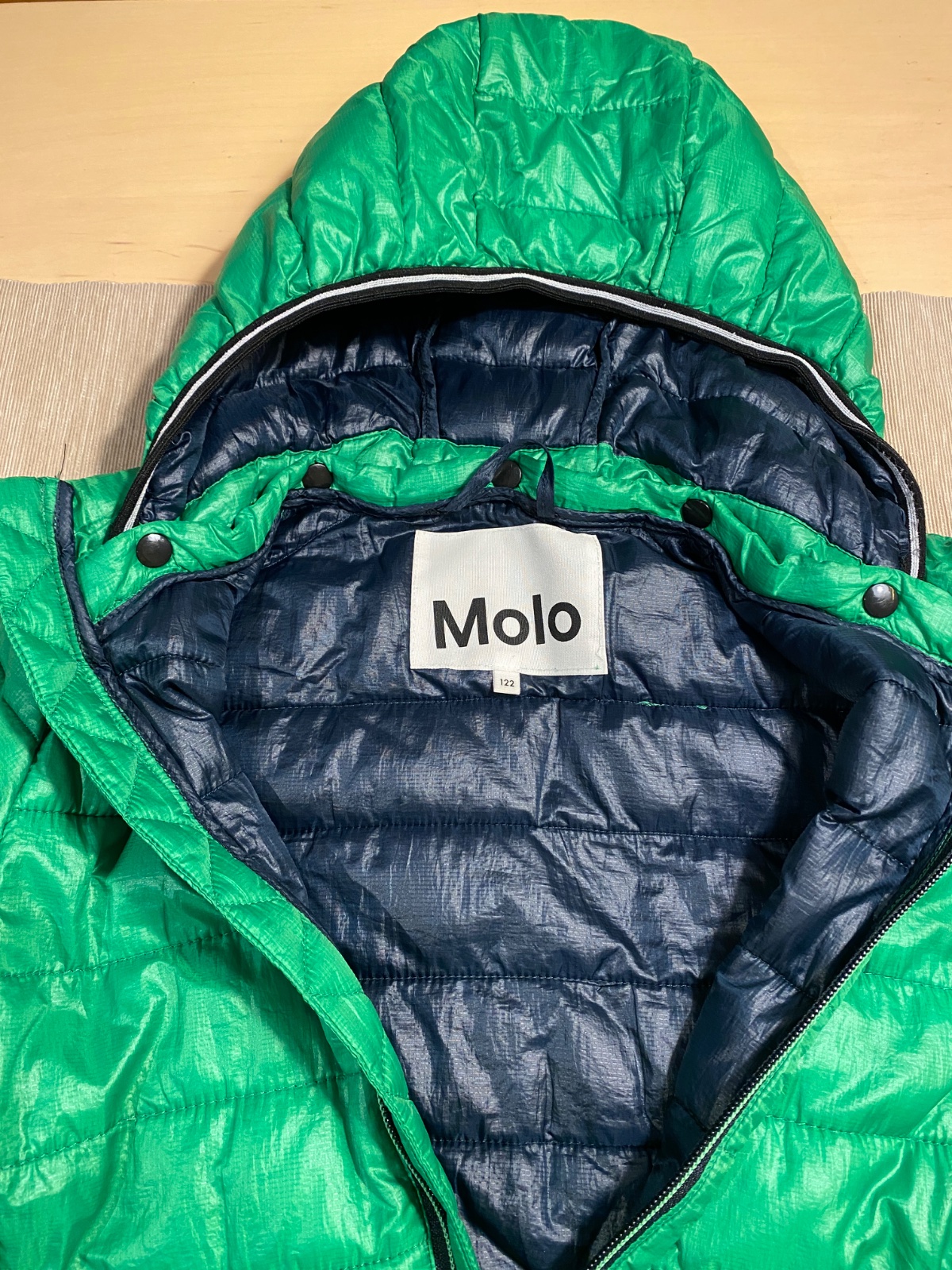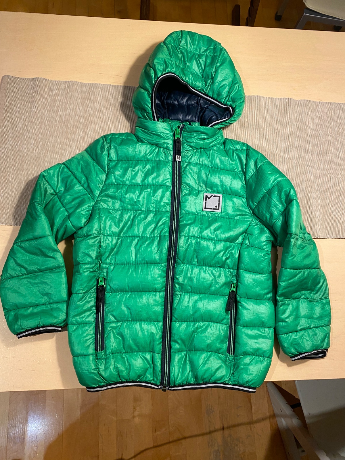 Krásna prechodná bunda jasnej zelenej farby, Dánskej značky Molo. Kvalitný materiál, veľmi príjemný na dotyk. Odnímateľná kapucňa, 2 vačky na zips (funkčné). Malé poškodenie na chrbte, je to zašité, ale nie je to pri nosení vidieť voľným okom (pozri foto). Stále je bunda v top stave aj napriek nerušivého poškodenia. Pôvodná cena 40€
