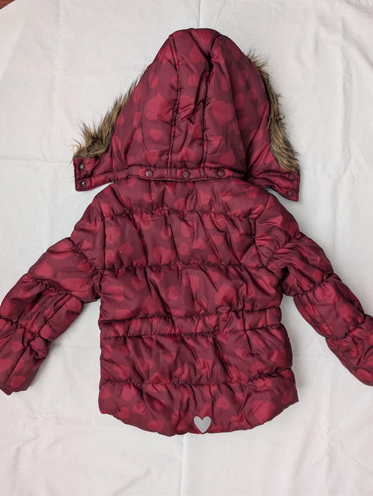 Bunda so srdiečkami, podšitá, top stav, bez poškodenia, veľkosť 5-6rokov. Kapucňa sa dá odopnúť.V
