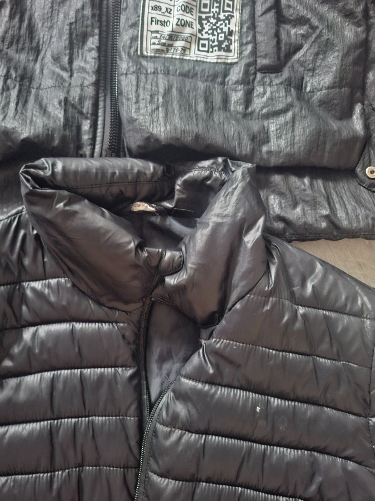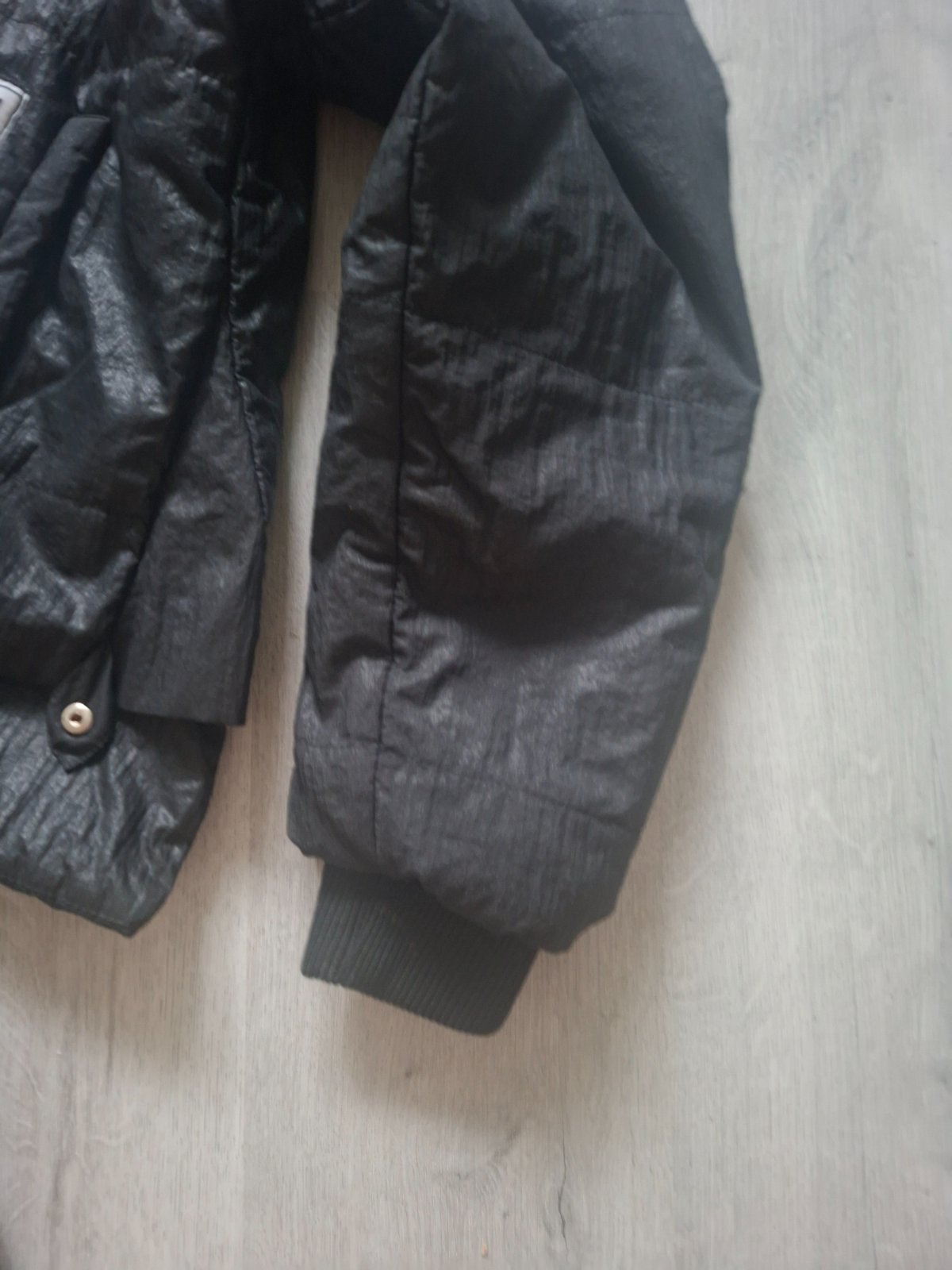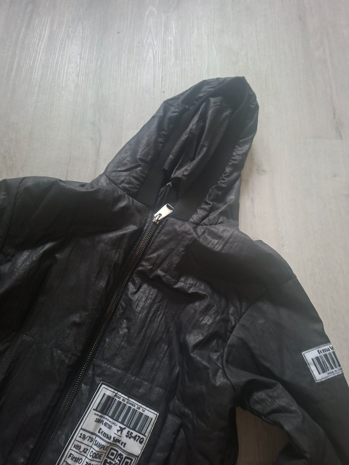 Čierny tenký kabátik s odnímateľnou kapucou, veľ. L, podšitý; zapínanie na zips aj gombíky, odnímateľný opasok s prackou, 2 vonkajšie vrecká. Málo nesený, veľmi dobrý stav.