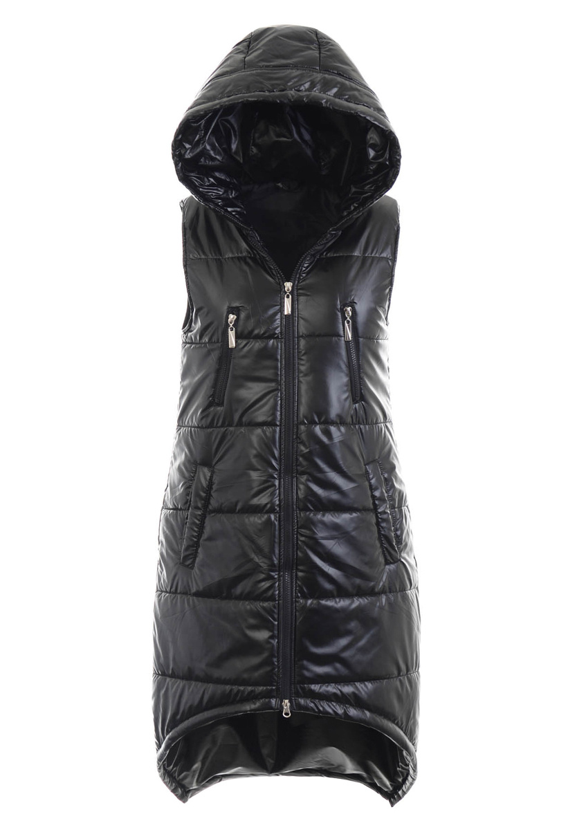 Dámska dlhá vesta, jeden z najmódnejších štýlov tejto sezóny. Má veľmi praktický dvojitý zips, ktorý neobmedzuje v pohybe napríklad pri jazde autom (zospodu je možné zips posunúť). Vesta má na bokoch dve odopínateľné vrecká. Doplnkovou ozdobou vesty sú dve falošné vrecká so zipsom na hrudi. Jednoznačnou výhodou tohto modelu je neodnímateľná kapucňa, ktorá poskytuje dodatočnú ochranu pred vetrom a dažďom. Vďaka módnemu strihu sa tielko skvele hodí k mnohým jarným a jesenným štýlom. Vesta je mierne zateplená. Zadná časť vesty je o cca 16 cm dlhšia.