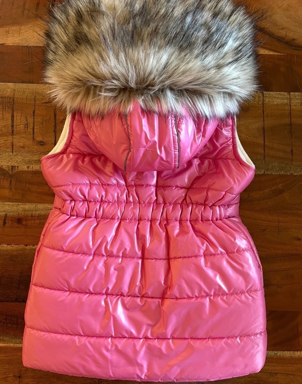 Nosena ruzova vesta, vel.128 (7-8r). Dlzka 50cm, sirka 37cm. Trocha osuchany zips a milimeter latky pod zipsom, vid foto. Inak dobry noseny stav. Vaha cca 250g