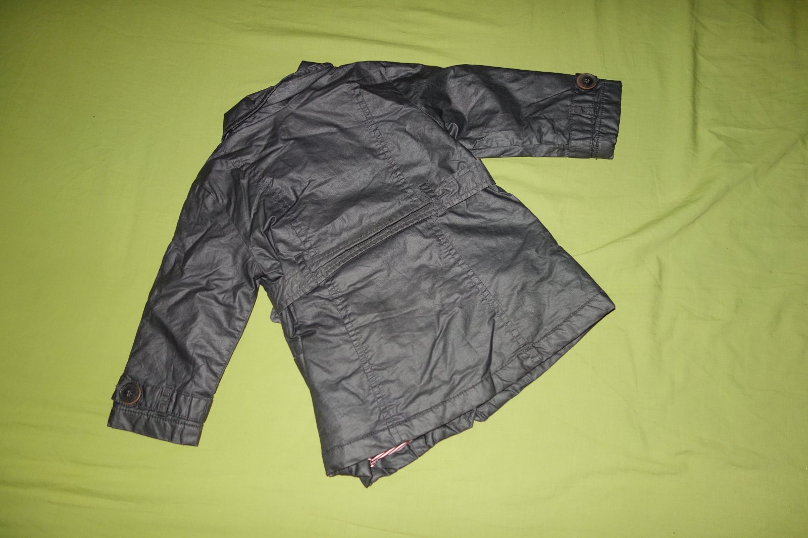 Krasny kabatik vo velmi dobrom stave. Je tenky, len mierne futrovany, maximalne tak na prechod. Je nepremokavy, moze byt aj do dazda.
