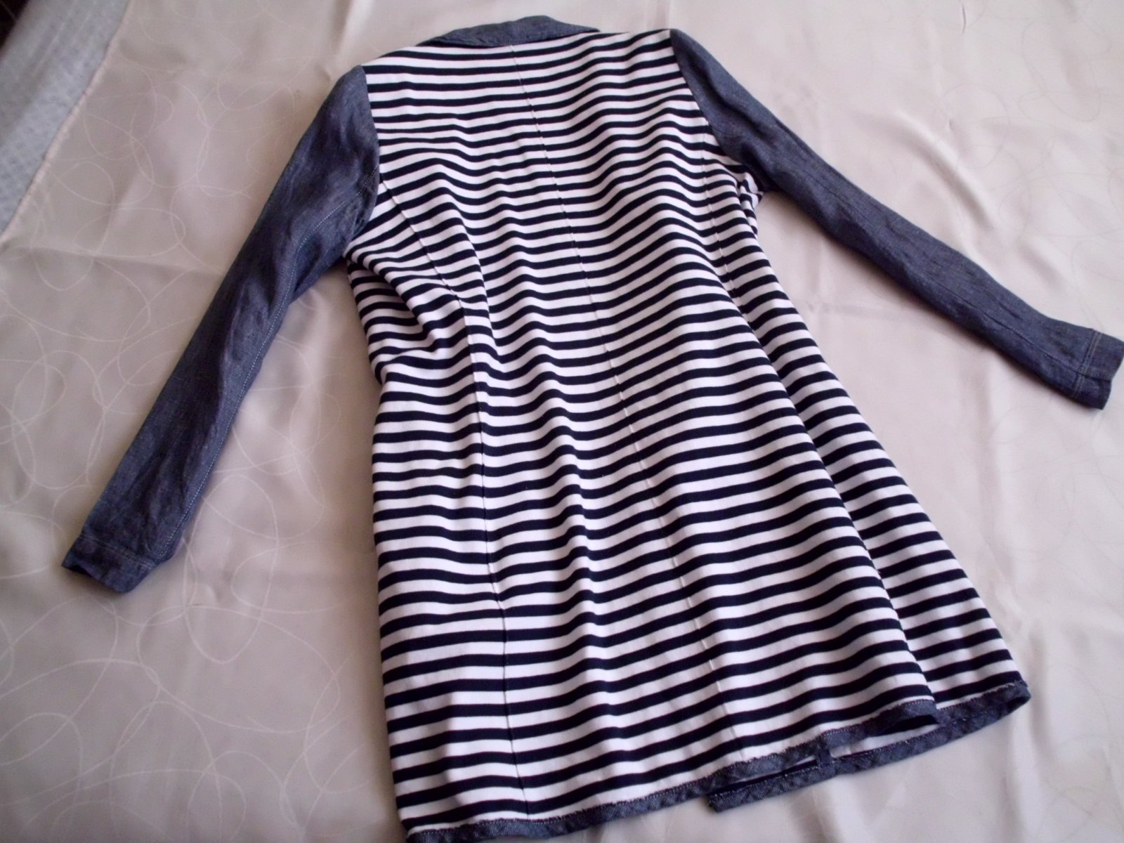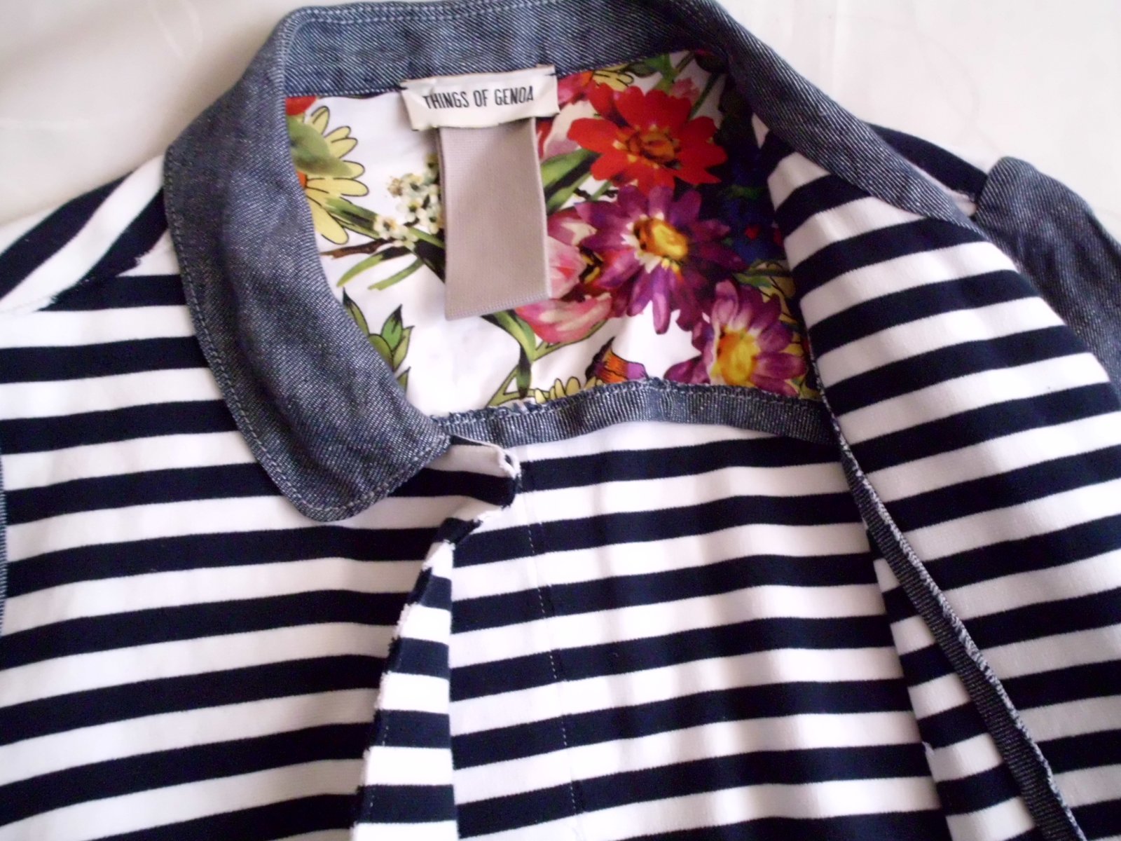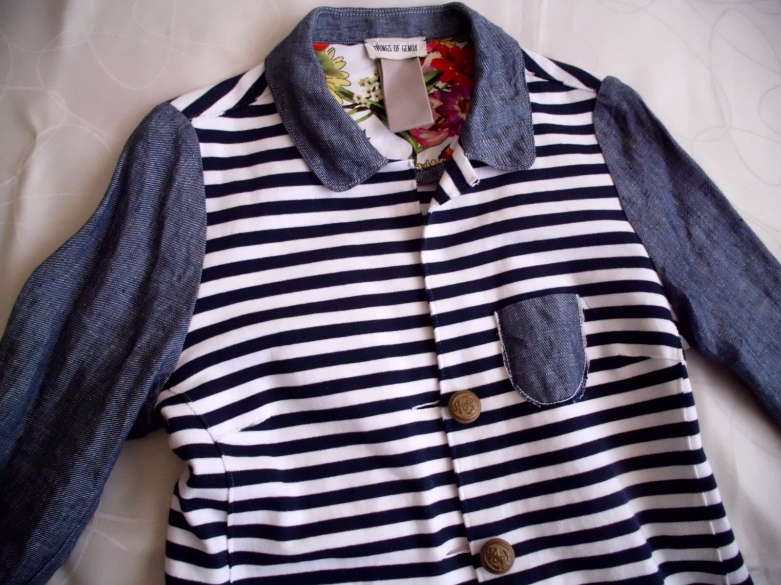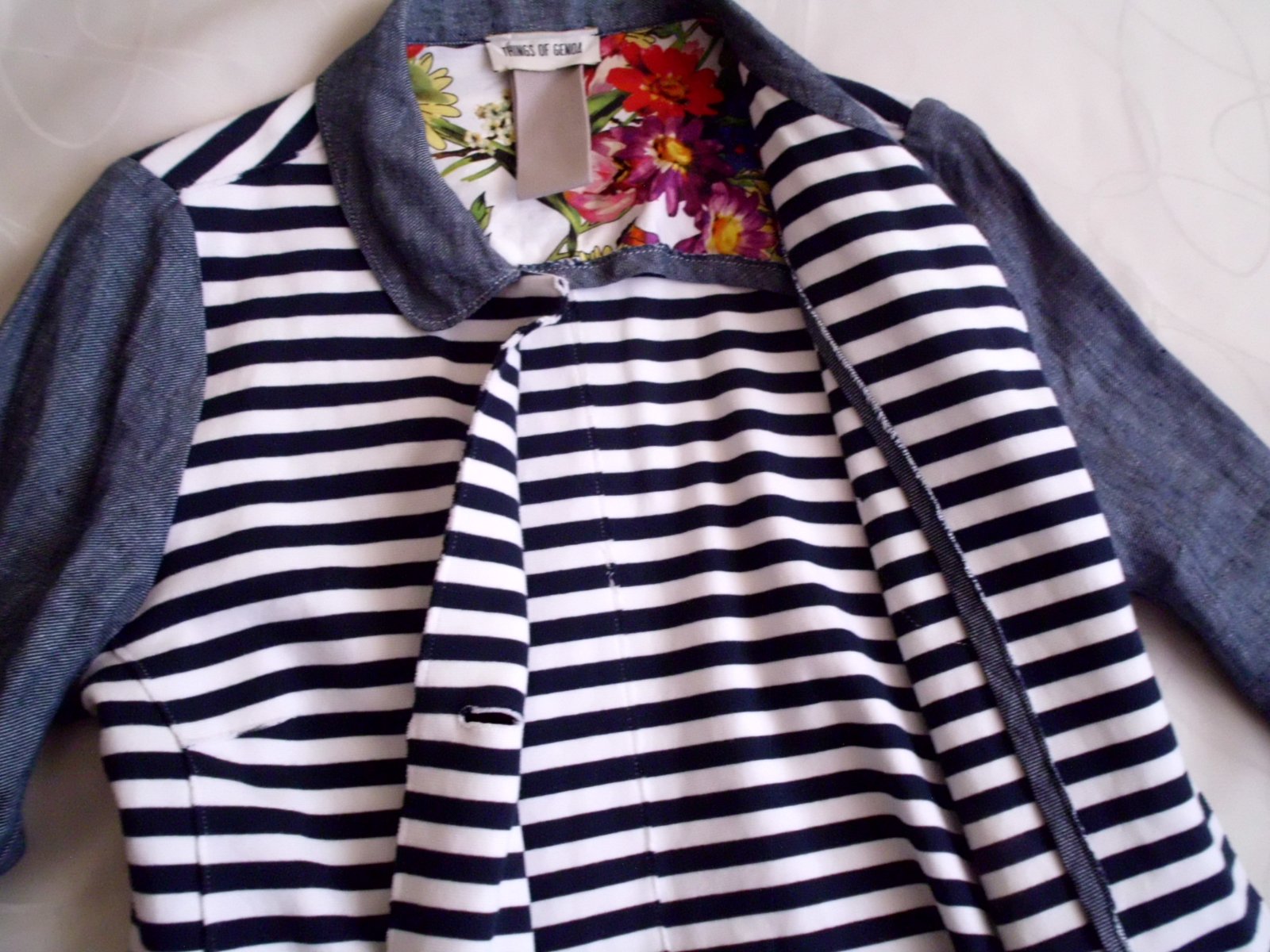 Predám dámsky sakový kabátik Italy Things of Genoa vel.M, dĺžka 88 cm, šírka 48 cm, rukáv 61 cm, bez podšívky , 3 vrecká, kvalitný prispôsobivý príjemný pružný nie úplne tenký materiál , rukávy látka , farba bielo tmavomodrý pásik + modrá riflová farba , top stav ...