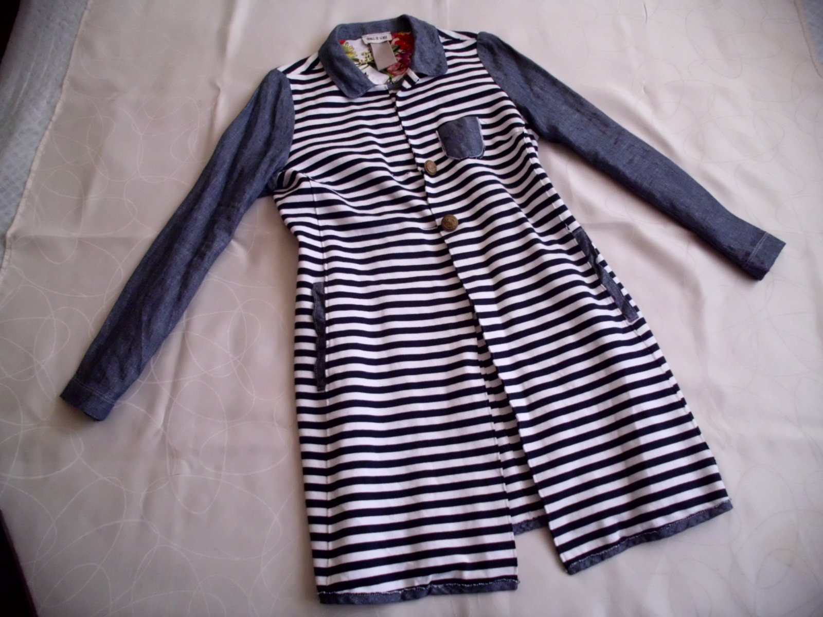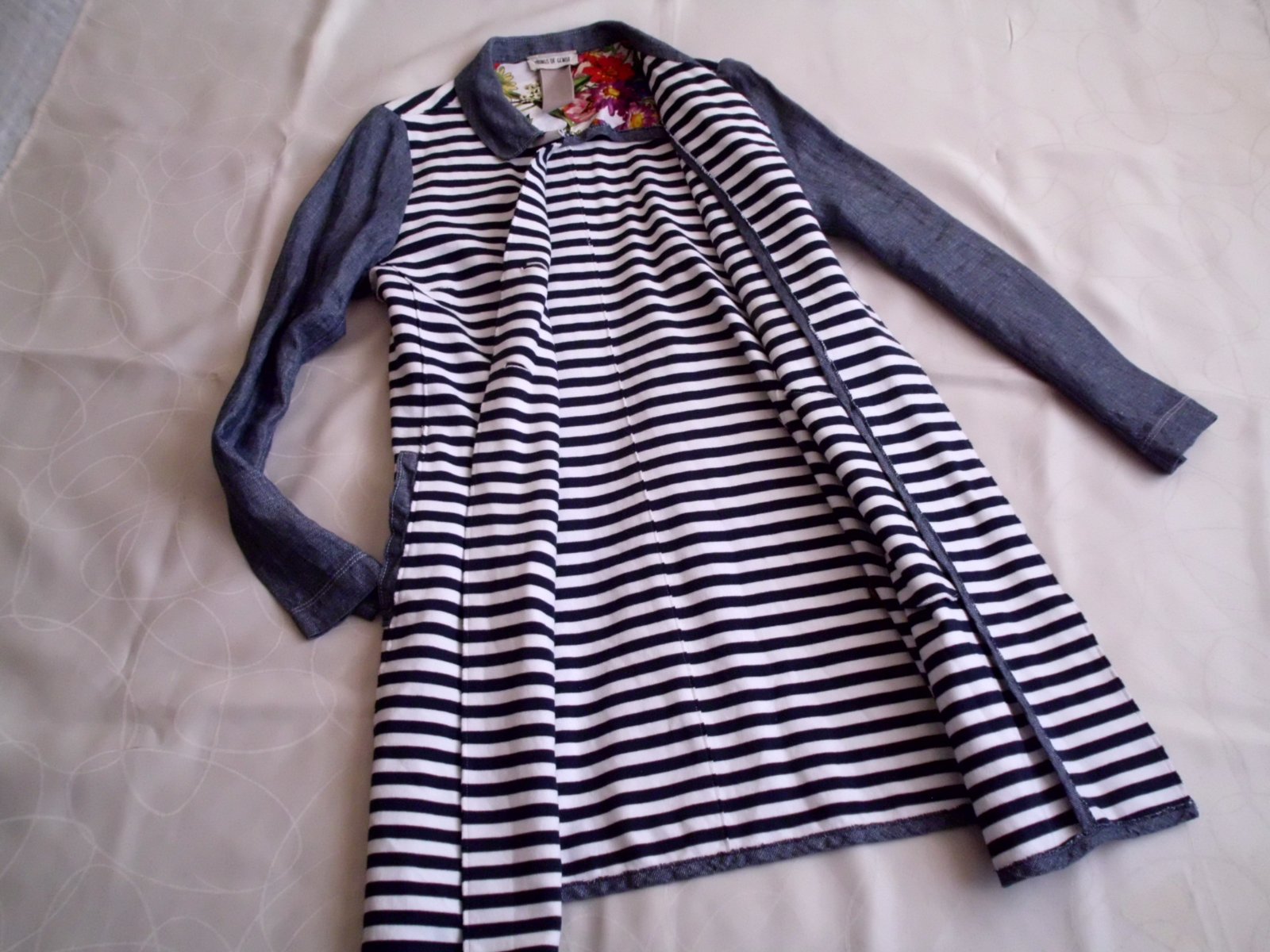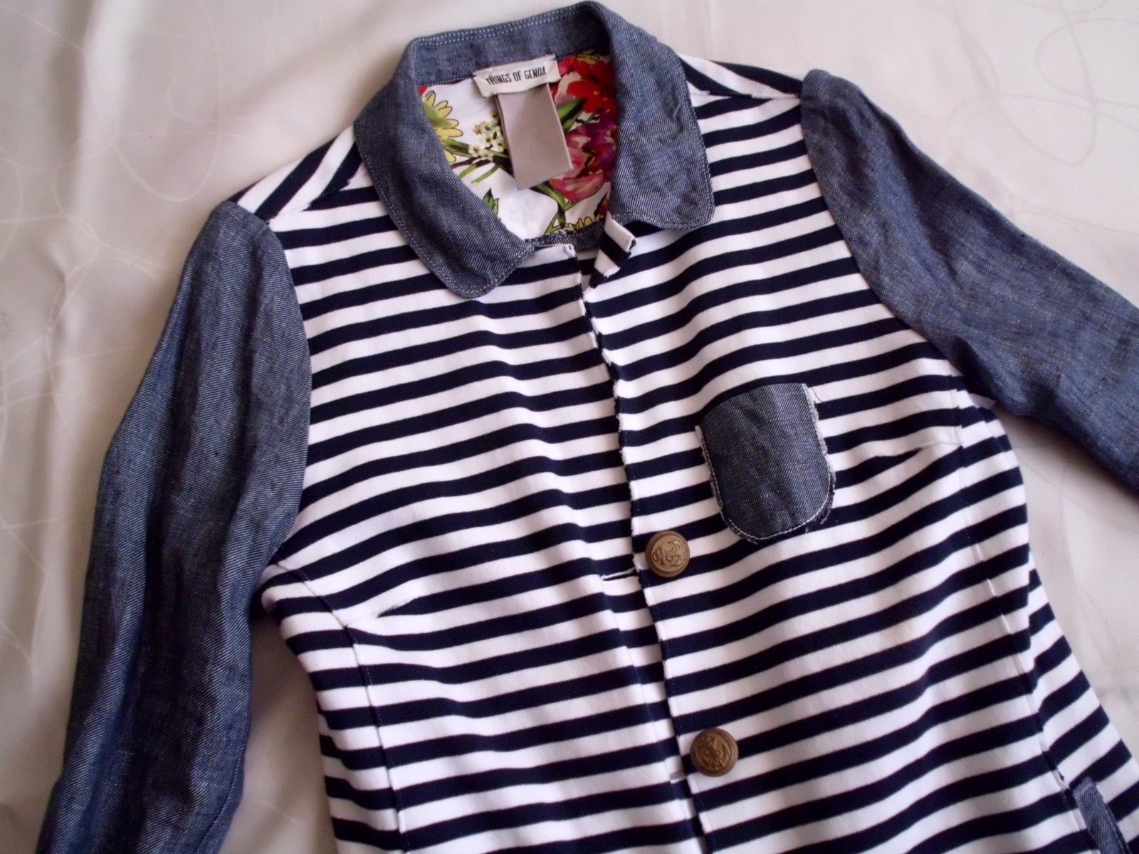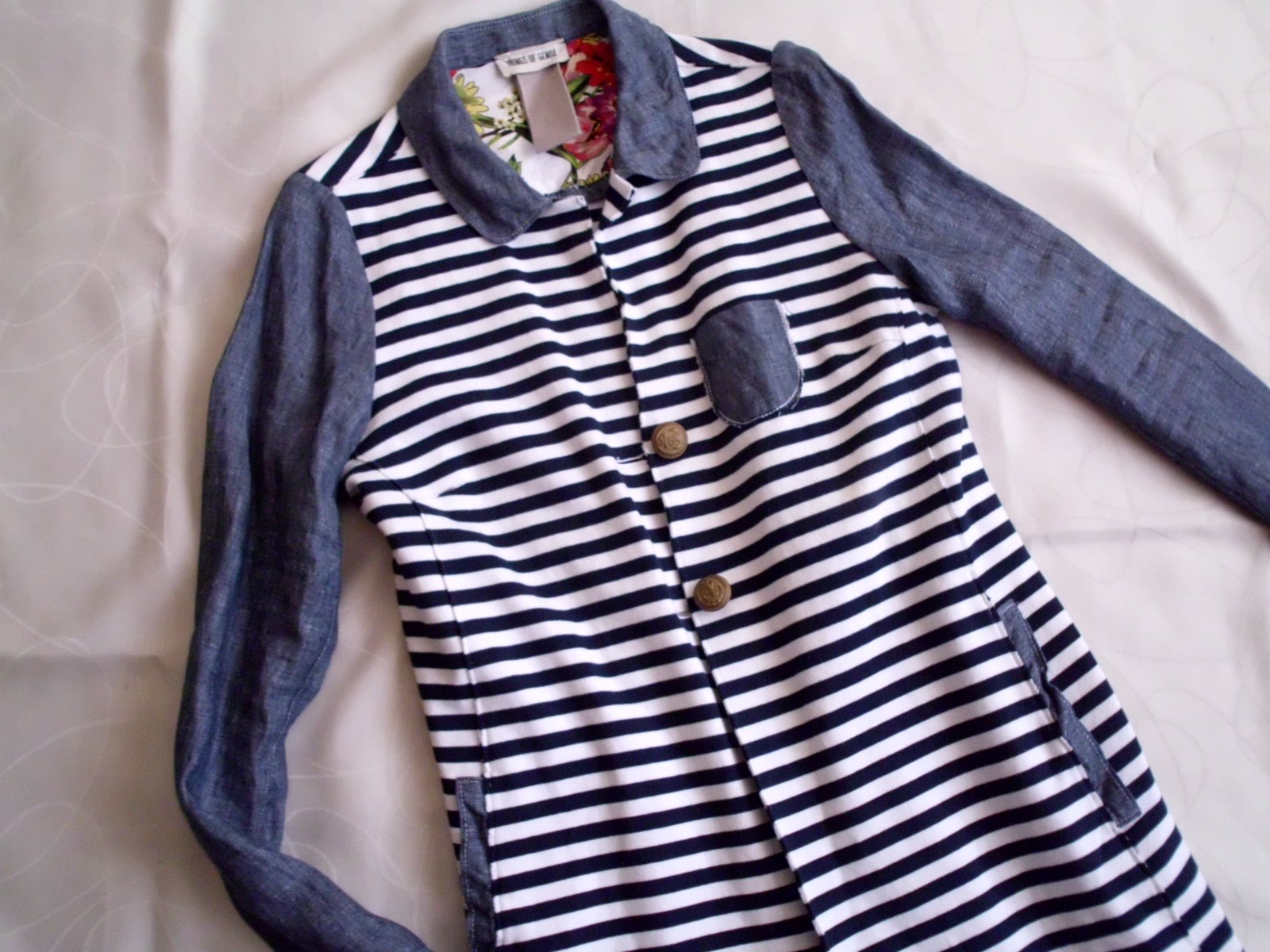 Predám dámsky sakový kabátik Italy Things of Genoa vel.M, dĺžka 88 cm, šírka 48 cm, rukáv 61 cm, bez podšívky , 3 vrecká, kvalitný prispôsobivý príjemný pružný nie úplne tenký materiál , rukávy látka , farba bielo tmavomodrý pásik + modrá riflová farba , top stav ...