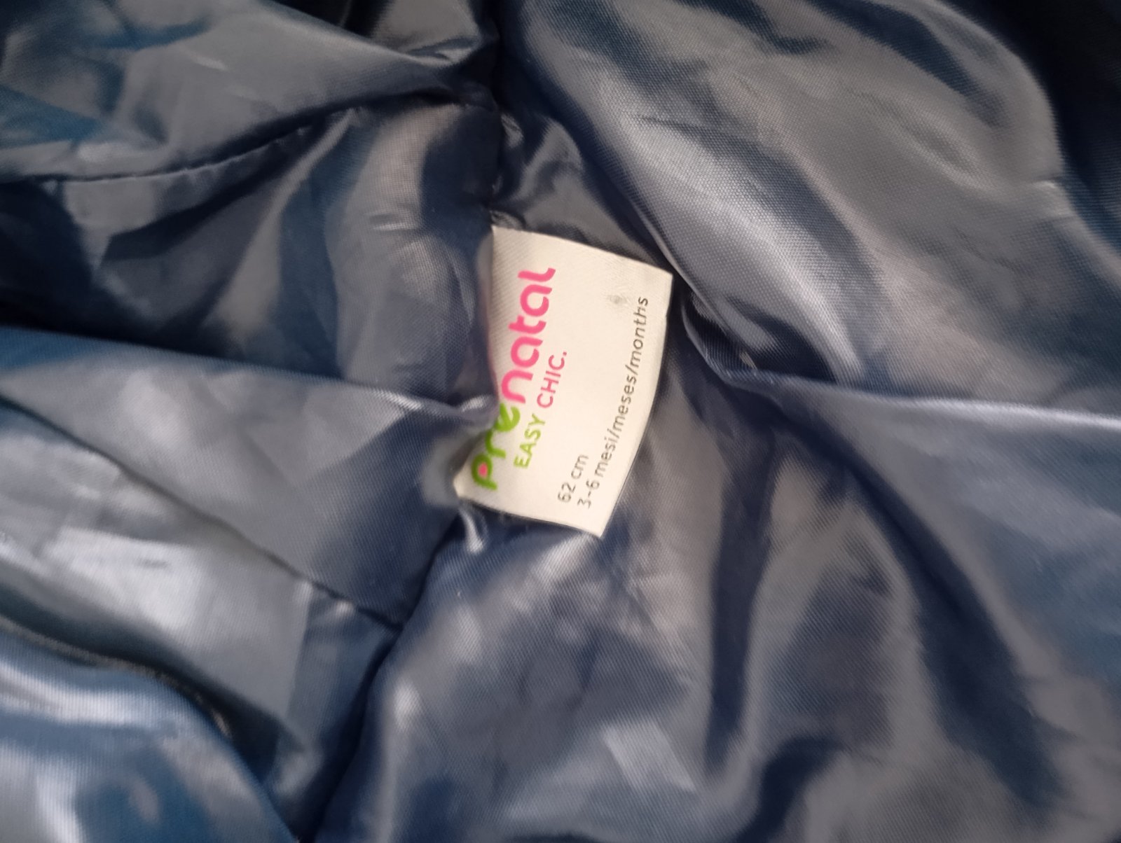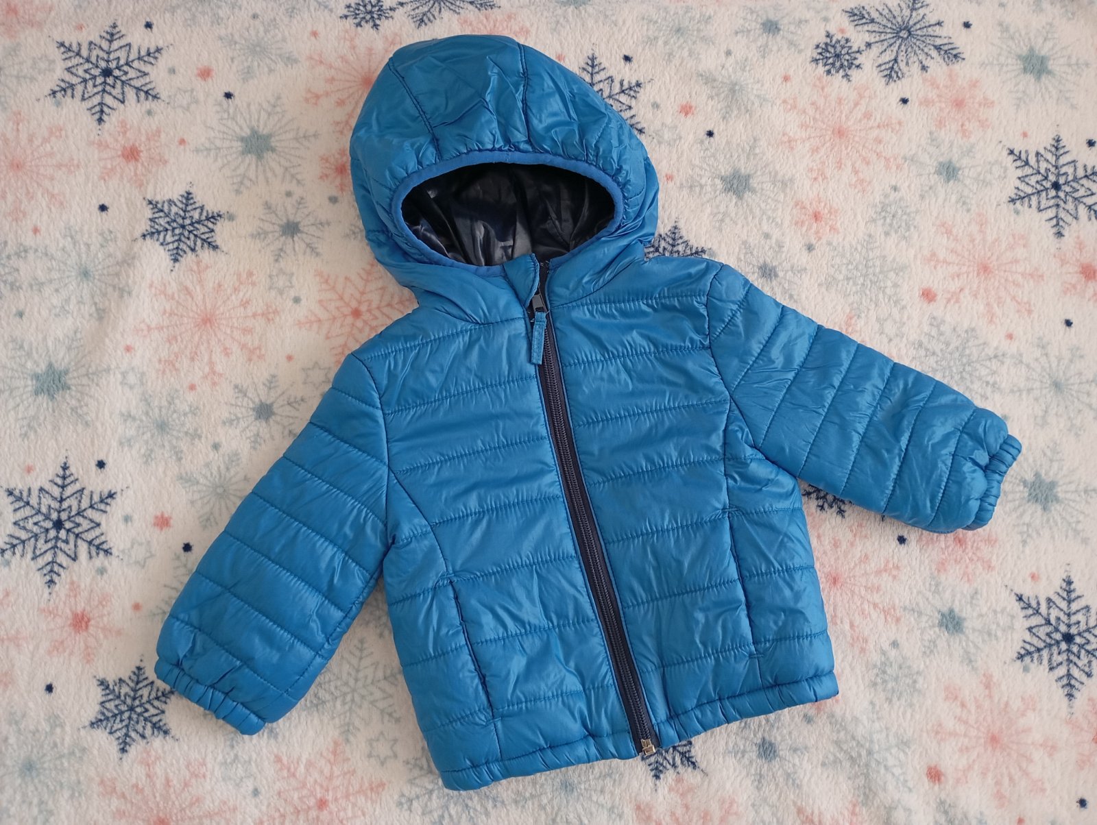 Bundicka je nosena v dobrom stave, nema žiadne poškodenia, iba minižmolky od prania. Je obojstranná, t z jednej strany bledomodra, z druhej strany pasík zeleno, bielo, modra s kapucnou. Zapínanie n...