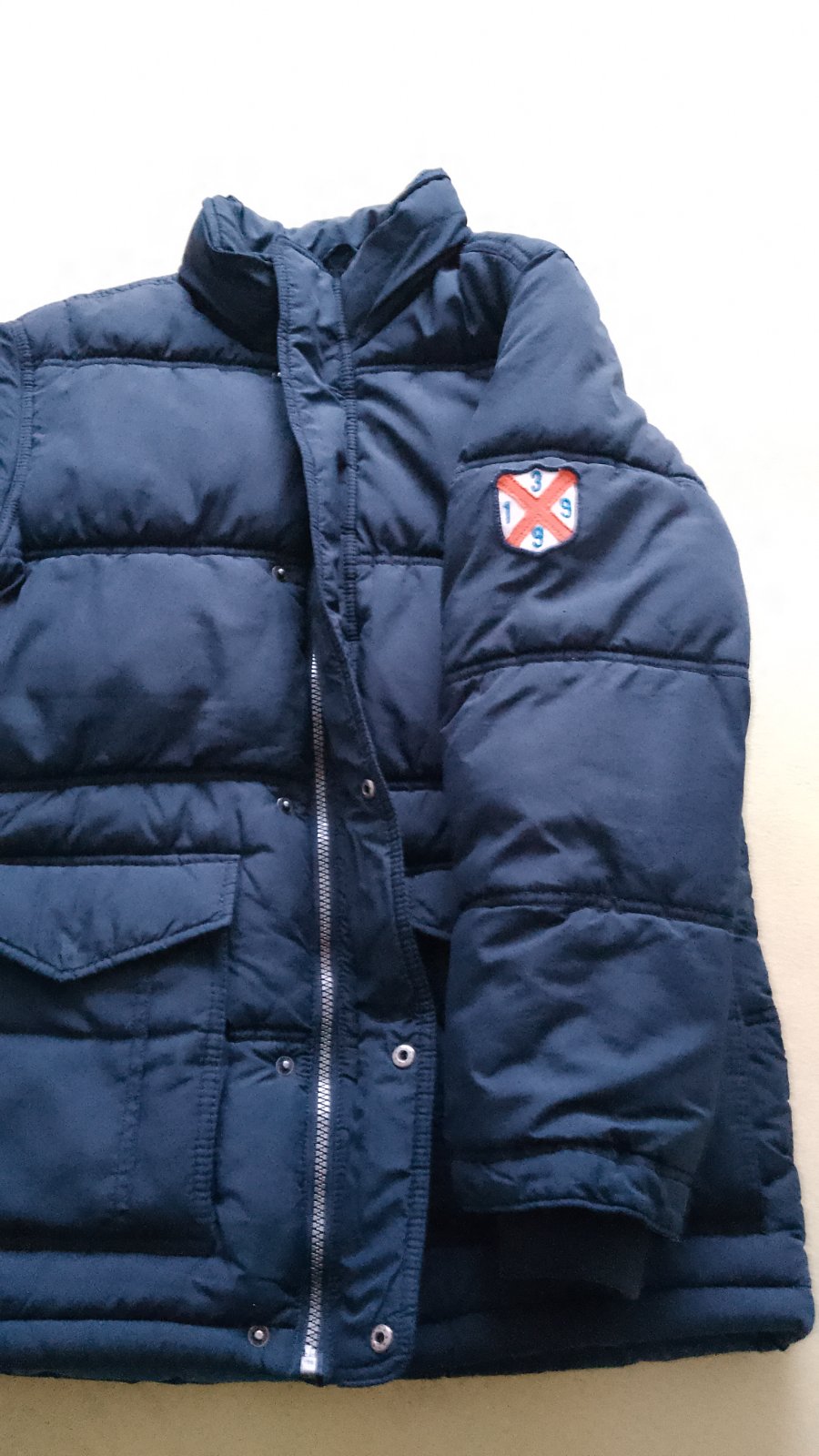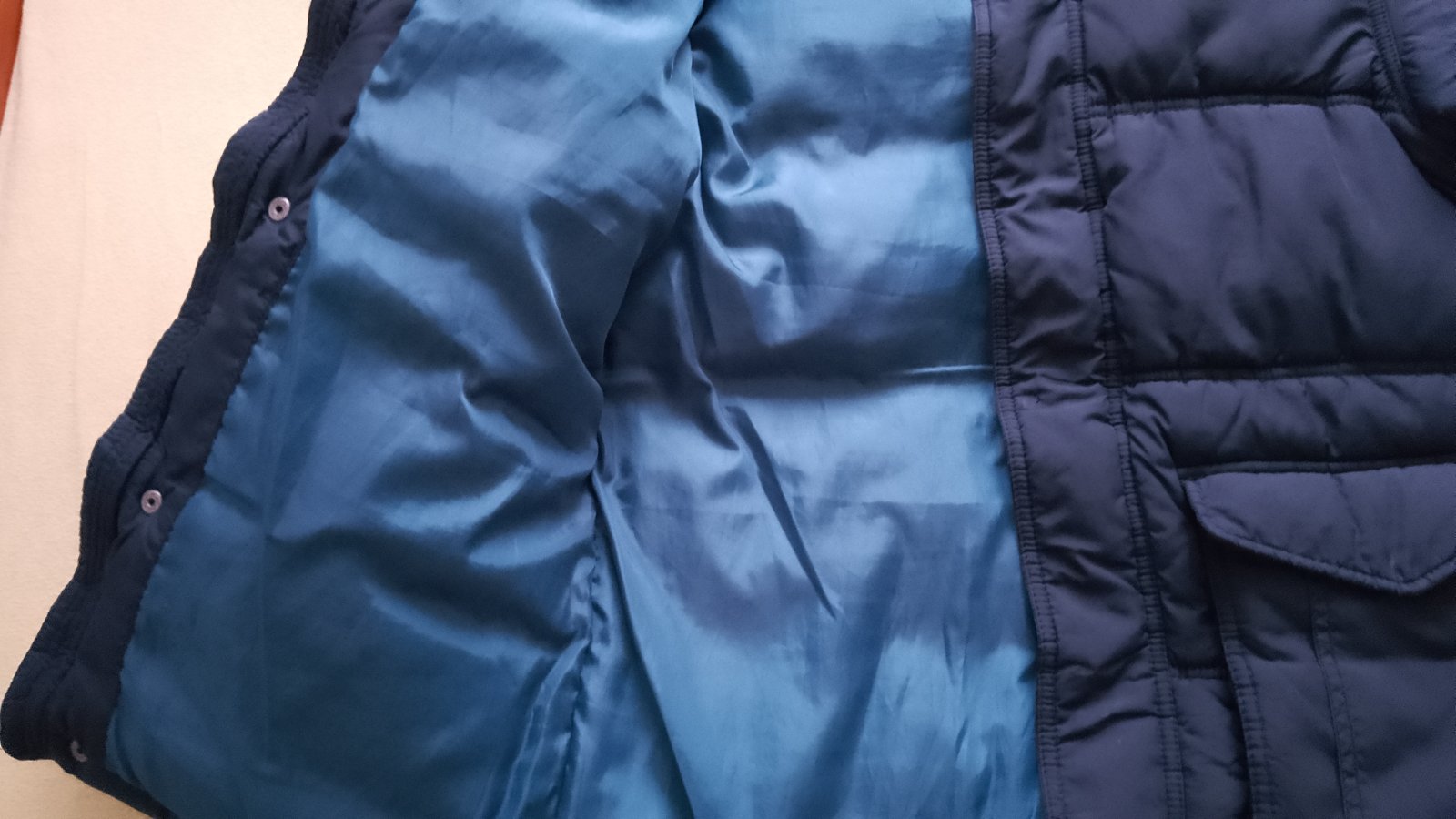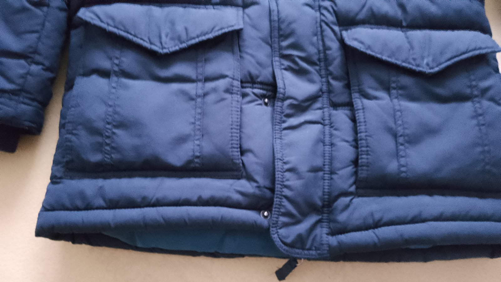 V zachovalom stave, bez poškodení, bez kapucne , vzadu pod golierom je slabo posunutá výplň, nosenie to neovplyvňuje.