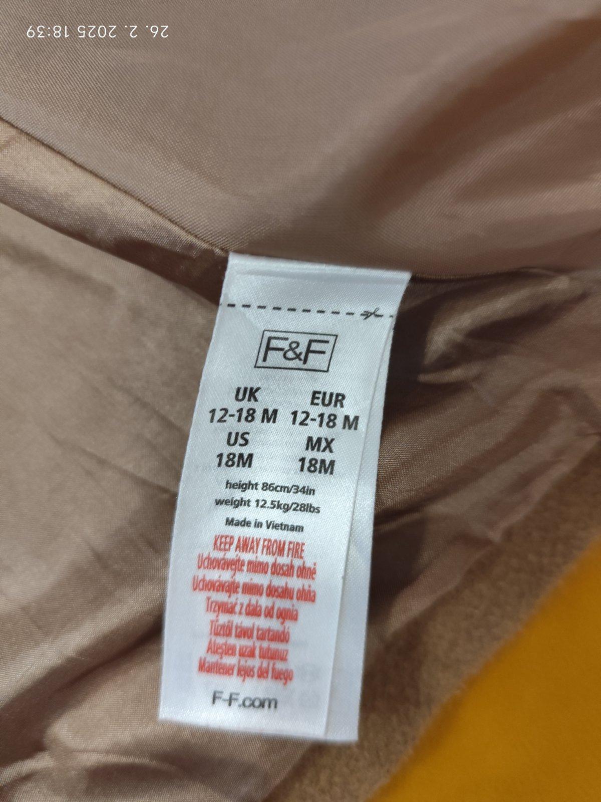 Predam prekrasny tigrovany jemnucky kabatik zn.F&F,obleceny velmi prilezitostne,cize asi 3x.stav noveho.velkost pisana 12-18 mes.,ale da sa nosit aj ako 92.