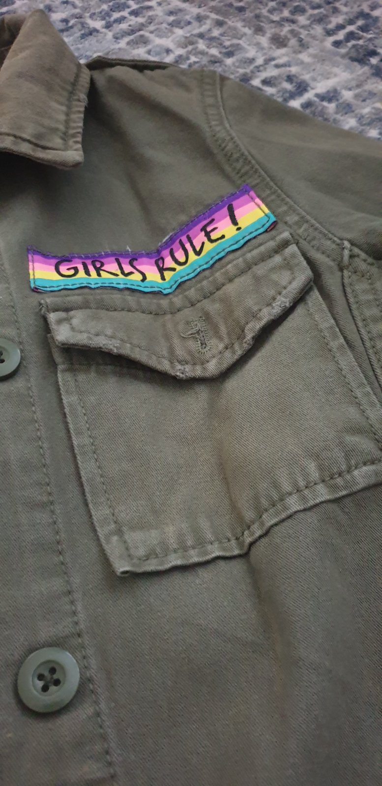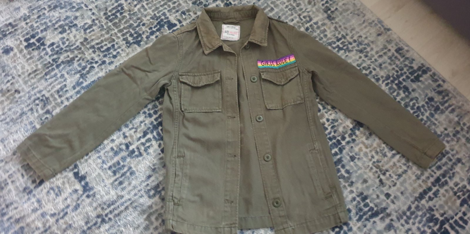 zelená bomberka s nášivkami, veľkosť 146/152, tak 10-12 rokov, dĺžka 51cm, šírka 45cm, rukáv od krku 69cm, dobrý nosený stav