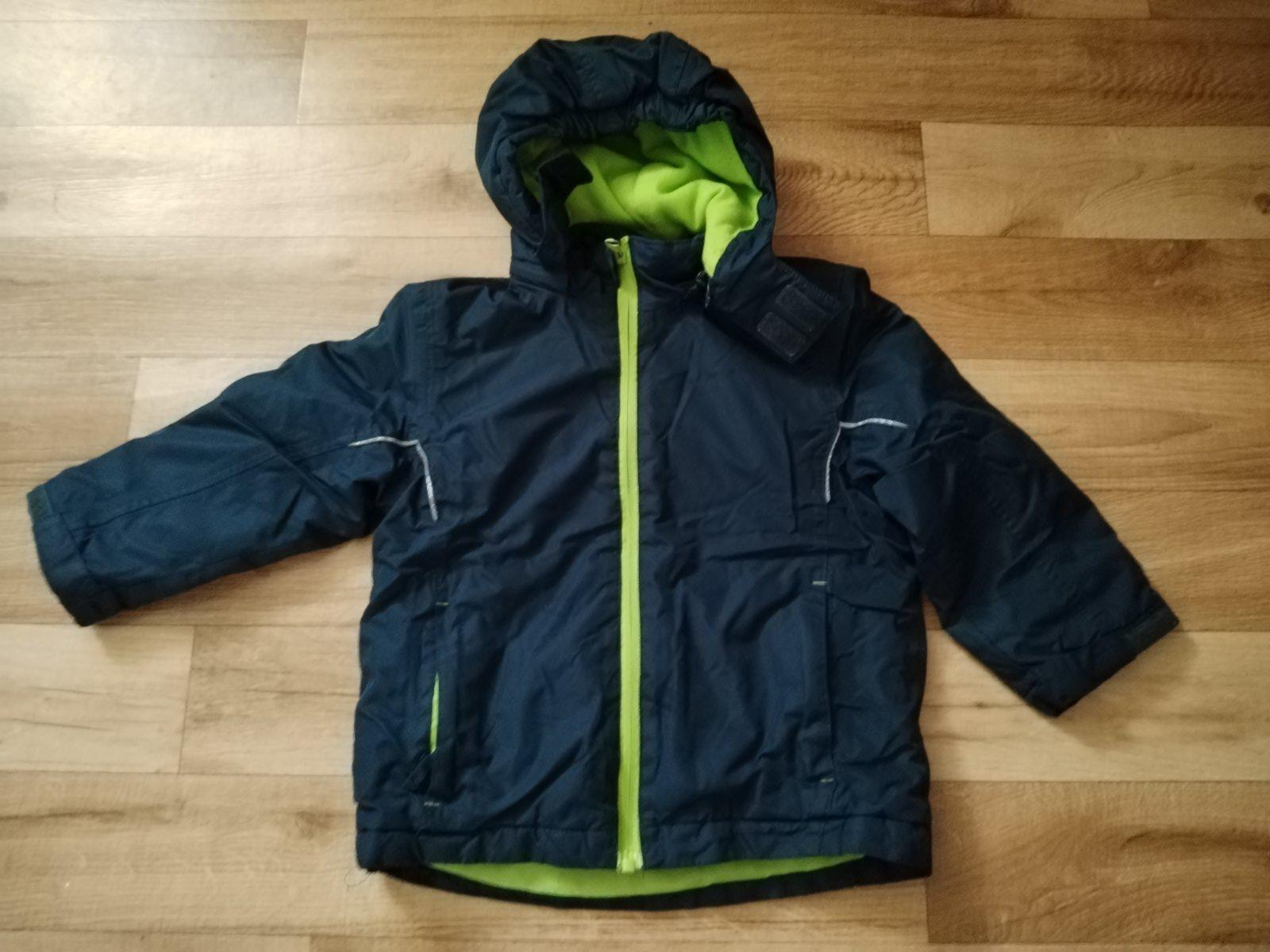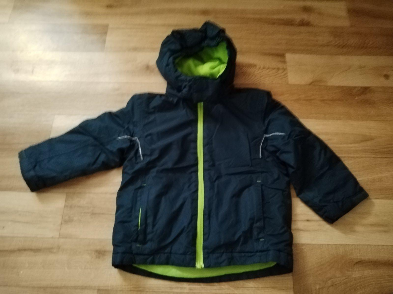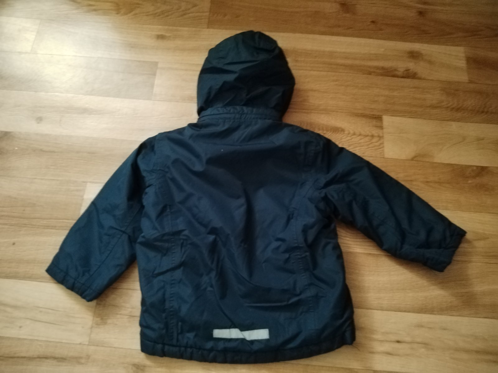 Dobry stav az velmi dobry, bezne znamky nosenia, oskrete gombiky, osuchnuty reflexny pasok na chrbte, inak bez dier, flakoc, farba pekna tmavomodra s dinosaurami, vnutri cela podsita flisom, aj rukavy