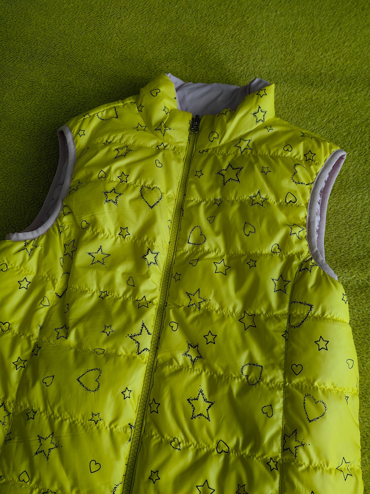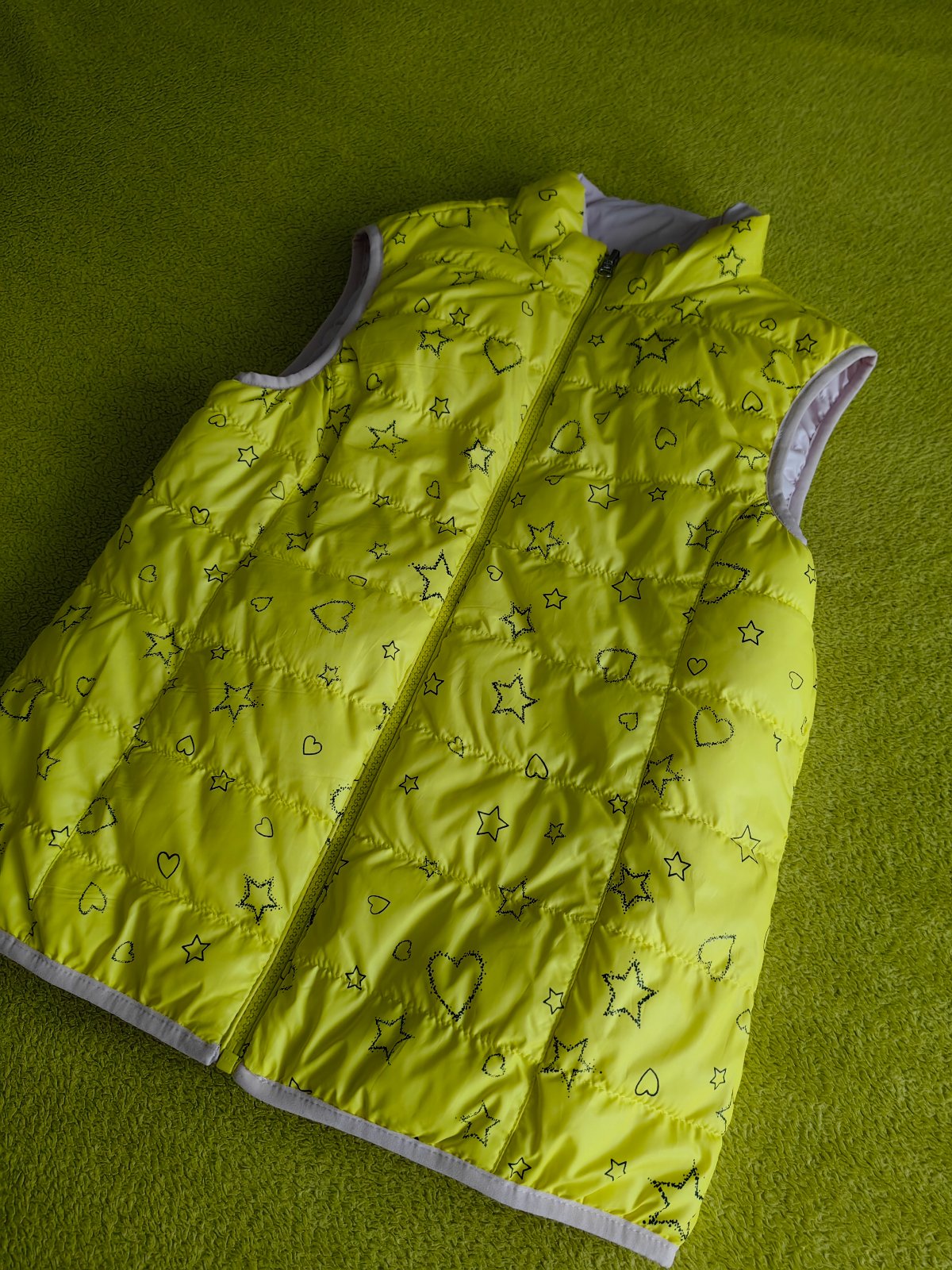 Minimálne nosená obojstranná vesta značky Benetton, v top stave. Písaná veľkosť 2XL - naša 158. Jedna strana krásne žltá, druhá svetlo ružová. S bočnými vreckami, zapínanie na zips. Osobný odber v Bratislave, alebo poštou, poštovné nie je zahrnuté v cene.