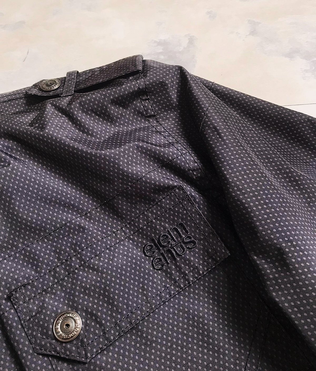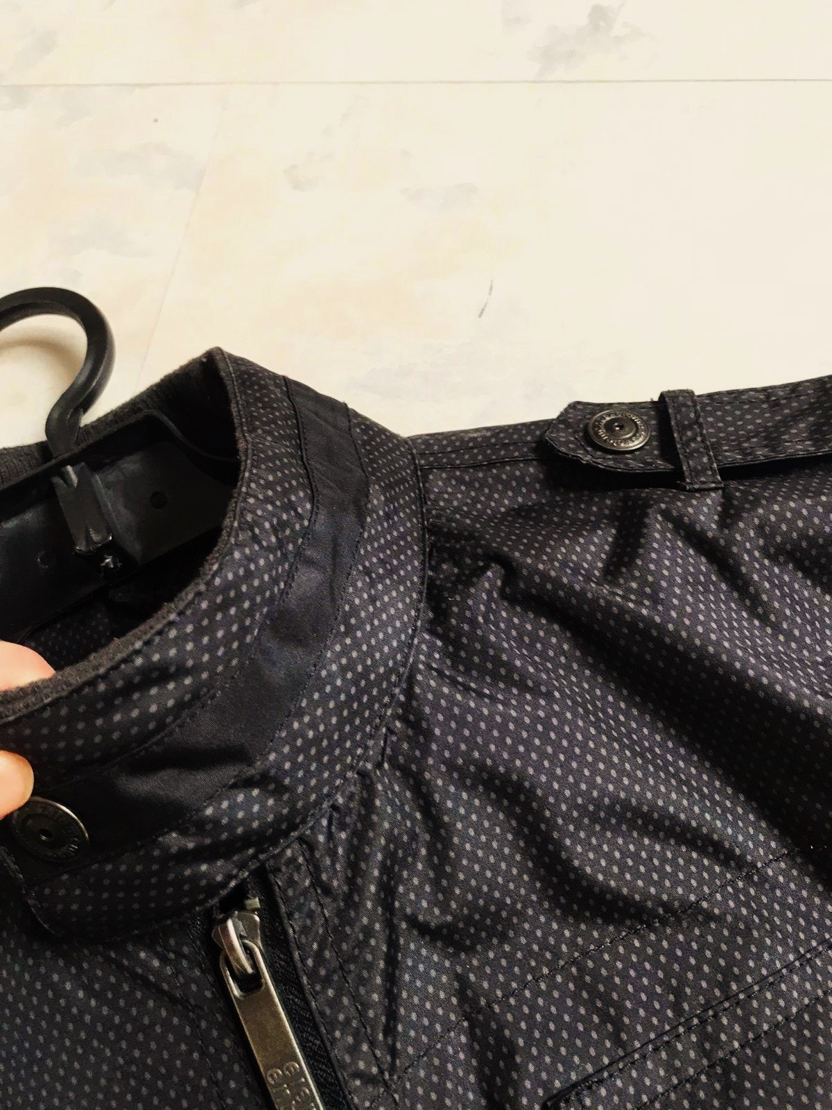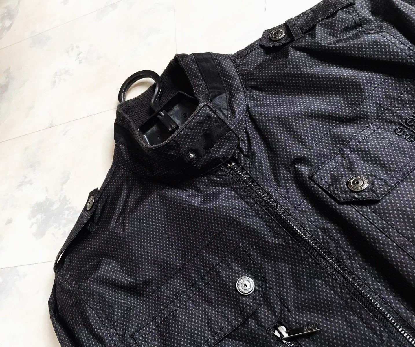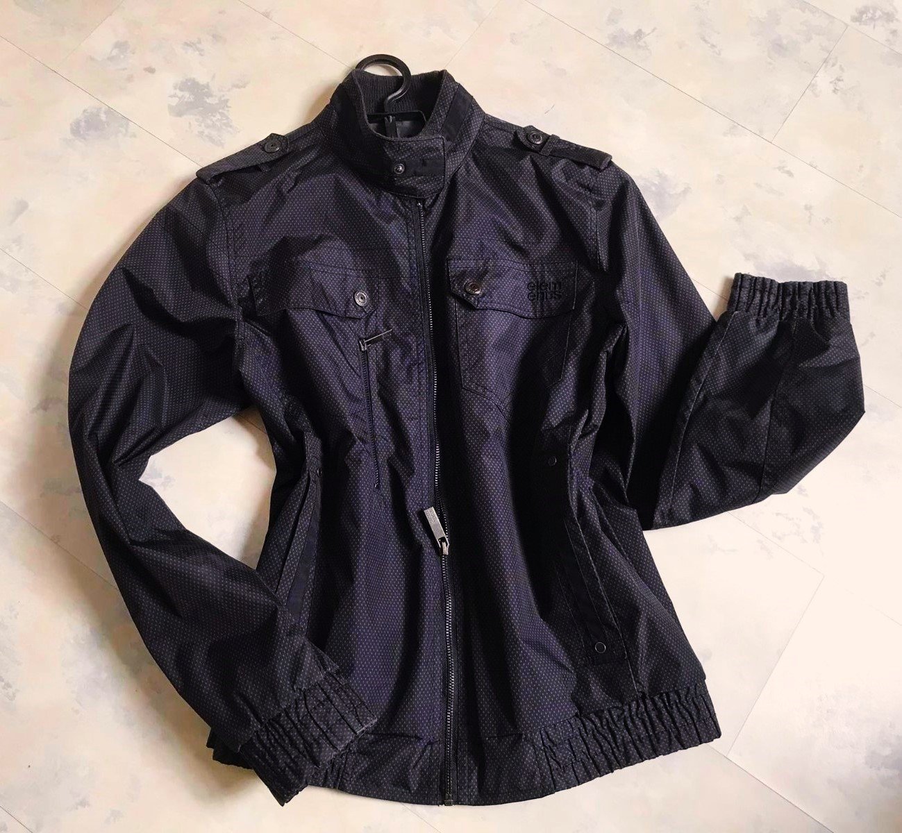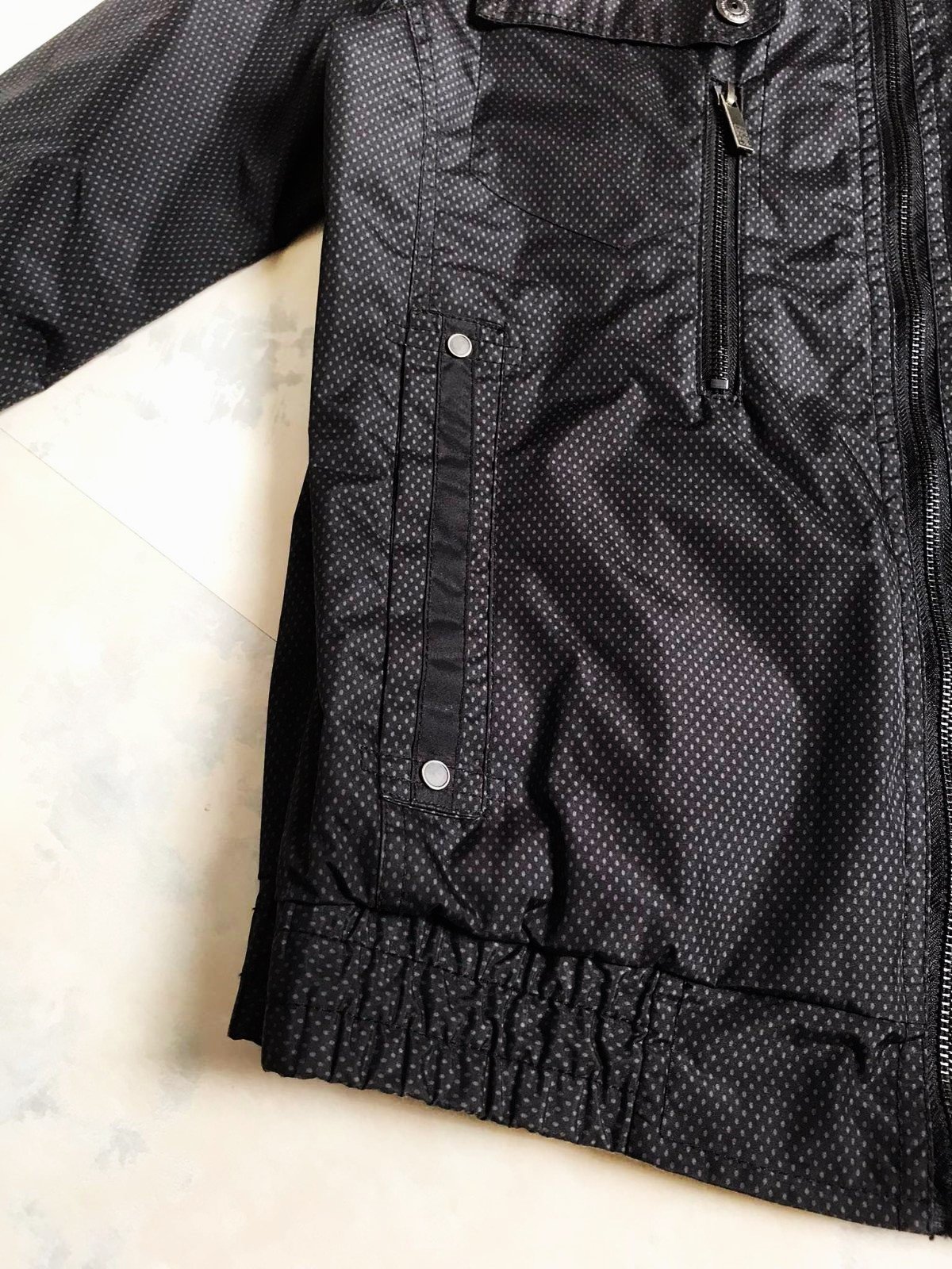 min.nosená podšitá perfektná sýtočierna vetrovka s peknými detailami,do pása,perfektný materiál...kvôli štruktúre materiálu nafotené svetlé fotky,dobre impregnovaná,podšitá