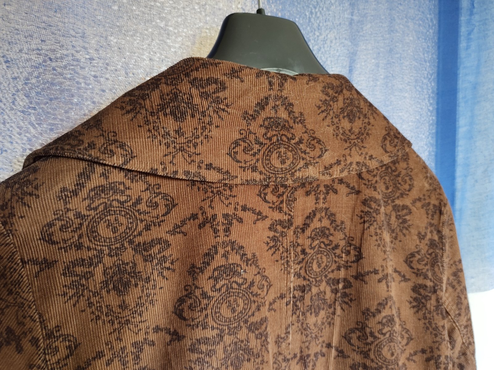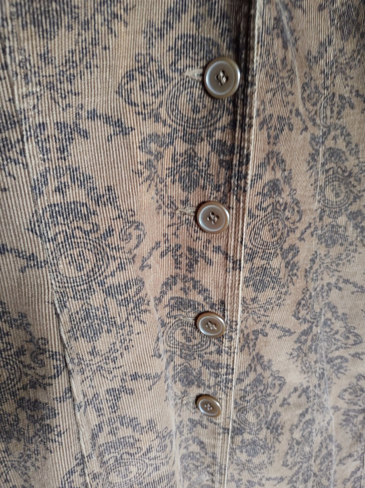 Hnedo-zlaté tenké bolerko na veľký gombík a 2 cvoky. Š - prsia 52 x 2 cm, dole 56 x 2 cm, d - 58 cm, r - 61 cm, plece 12 cm.