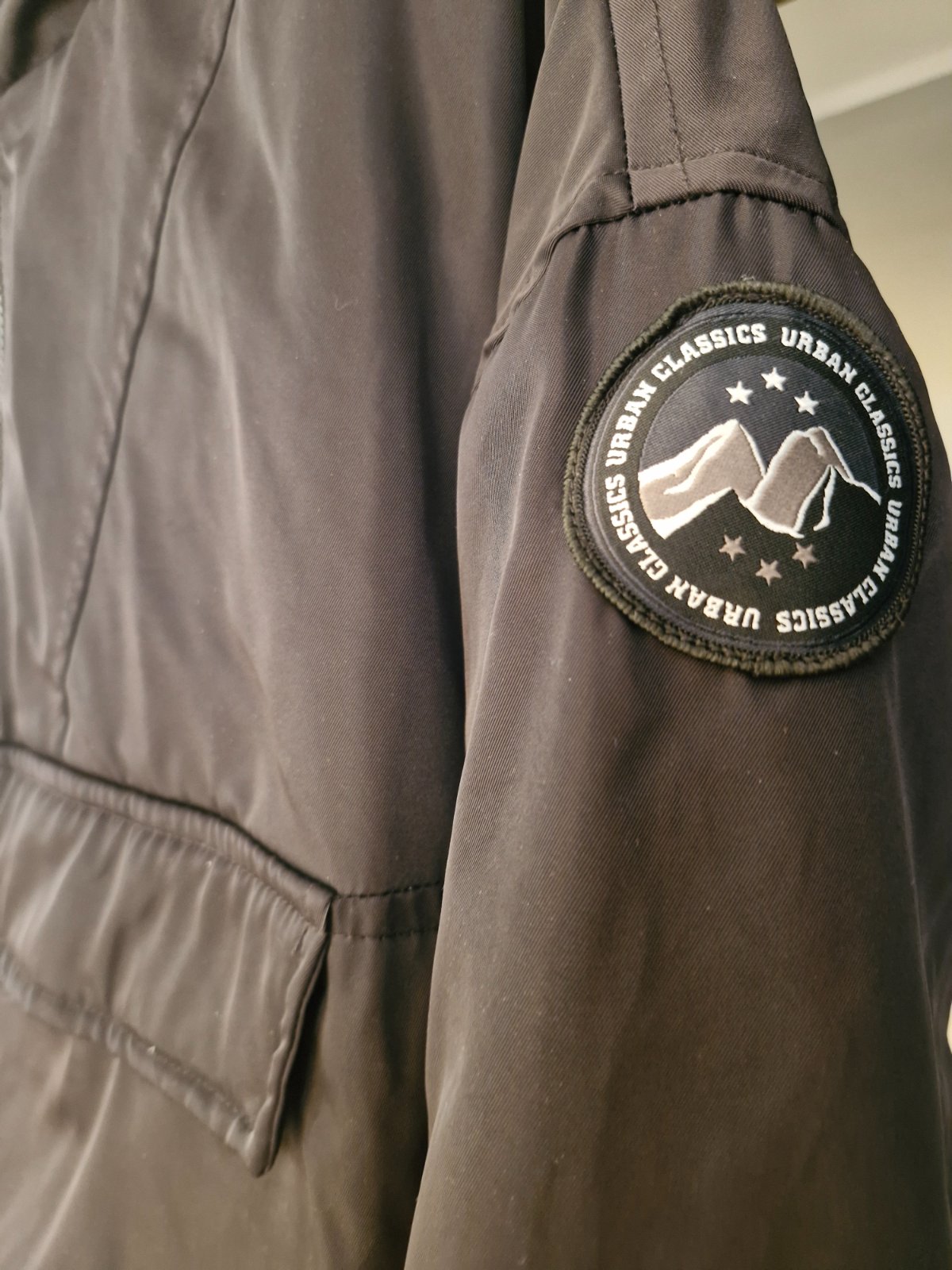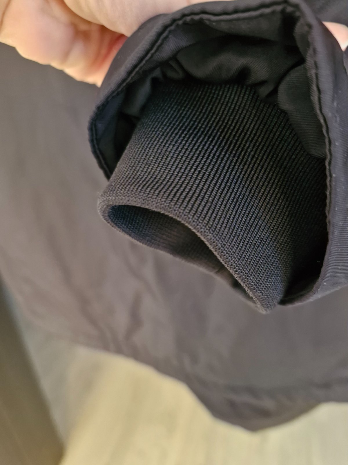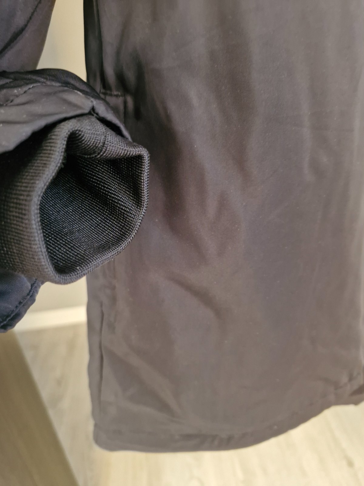 Čierna prešívaná bunda-vetrovka, skôr na miernu zimu, nie je veľmi hrubá. Dĺžka 62 cm, šírka 44 cm, rukáv od goliera 75 cm.