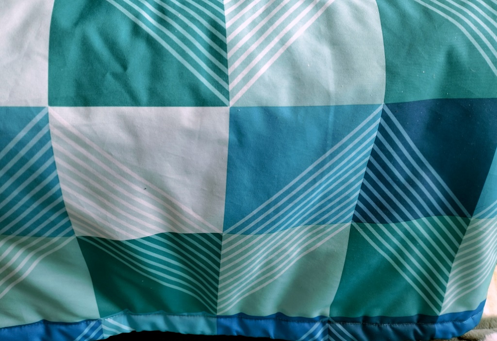 Farebná kombinácia svetlo modrej, mentolovej, bielej a tmavo zelenej. Neviem či fotky úplne ukazujú reálnu farbu, v skutočnosti je ozaj pekná.
