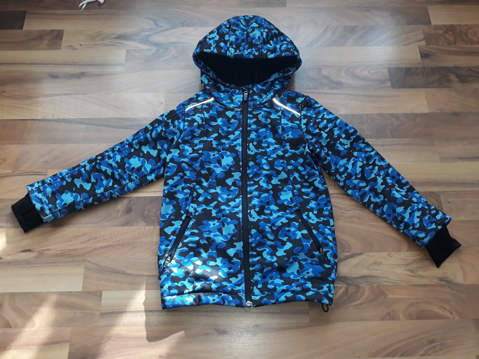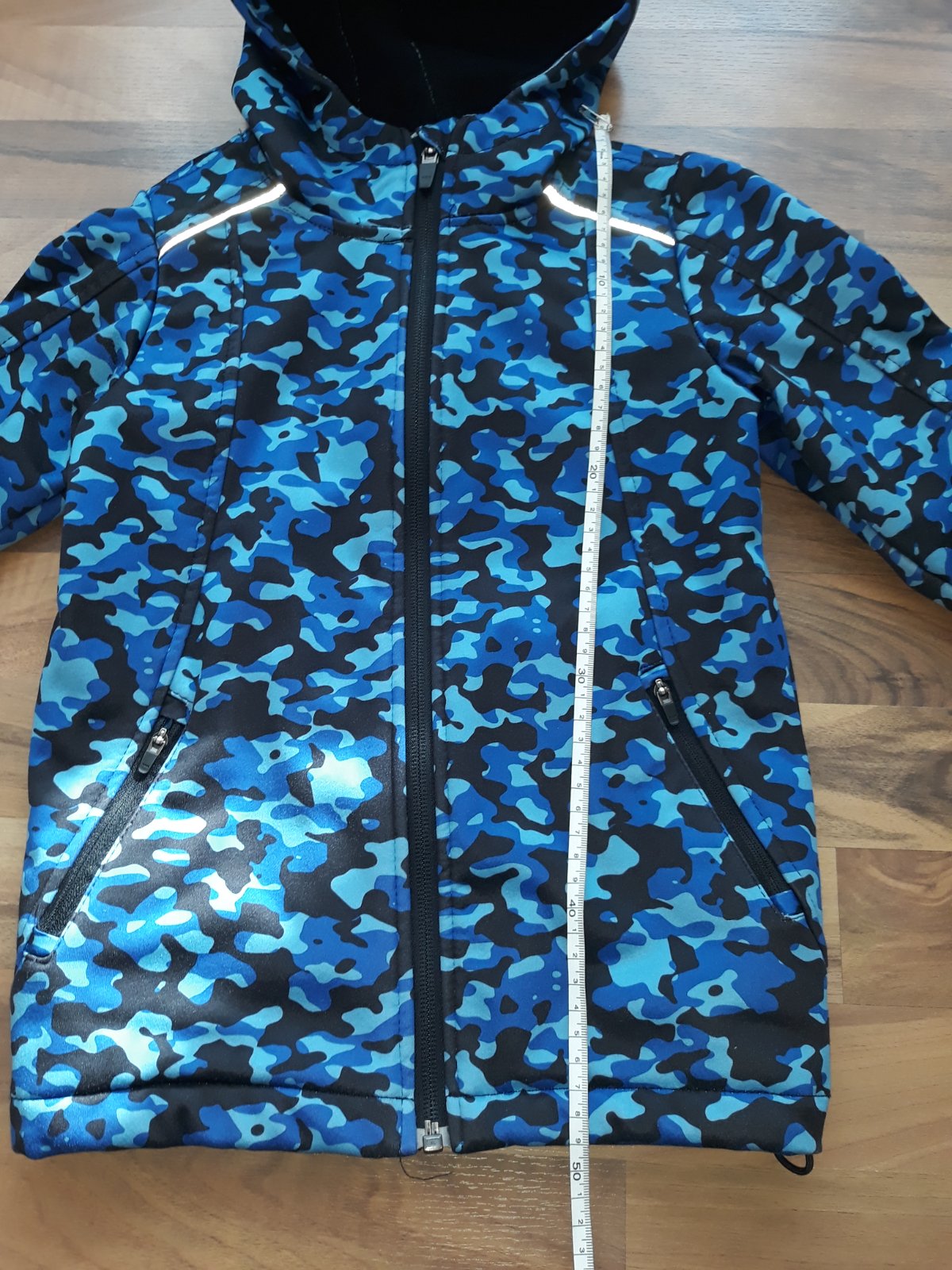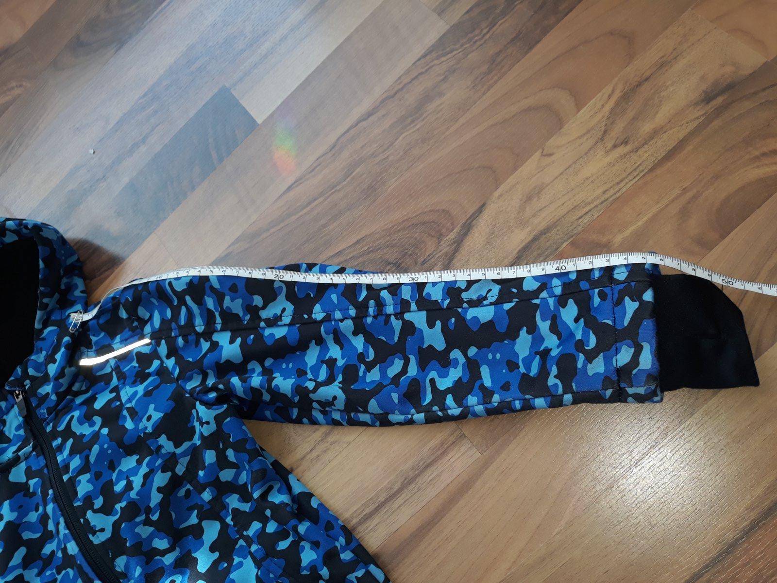 Posúvam softshellovú bundu. Synova obľúbená, vynosil ju pomerne dlho. Zvnútra mierne žmolky, trošku ošuchnuté rukávy, reflexné prvky. Všetko v galérii. Verím, že ešte poslúži. Sedí na užšiu, vyššiu postavu. Rozmery sú na foto.