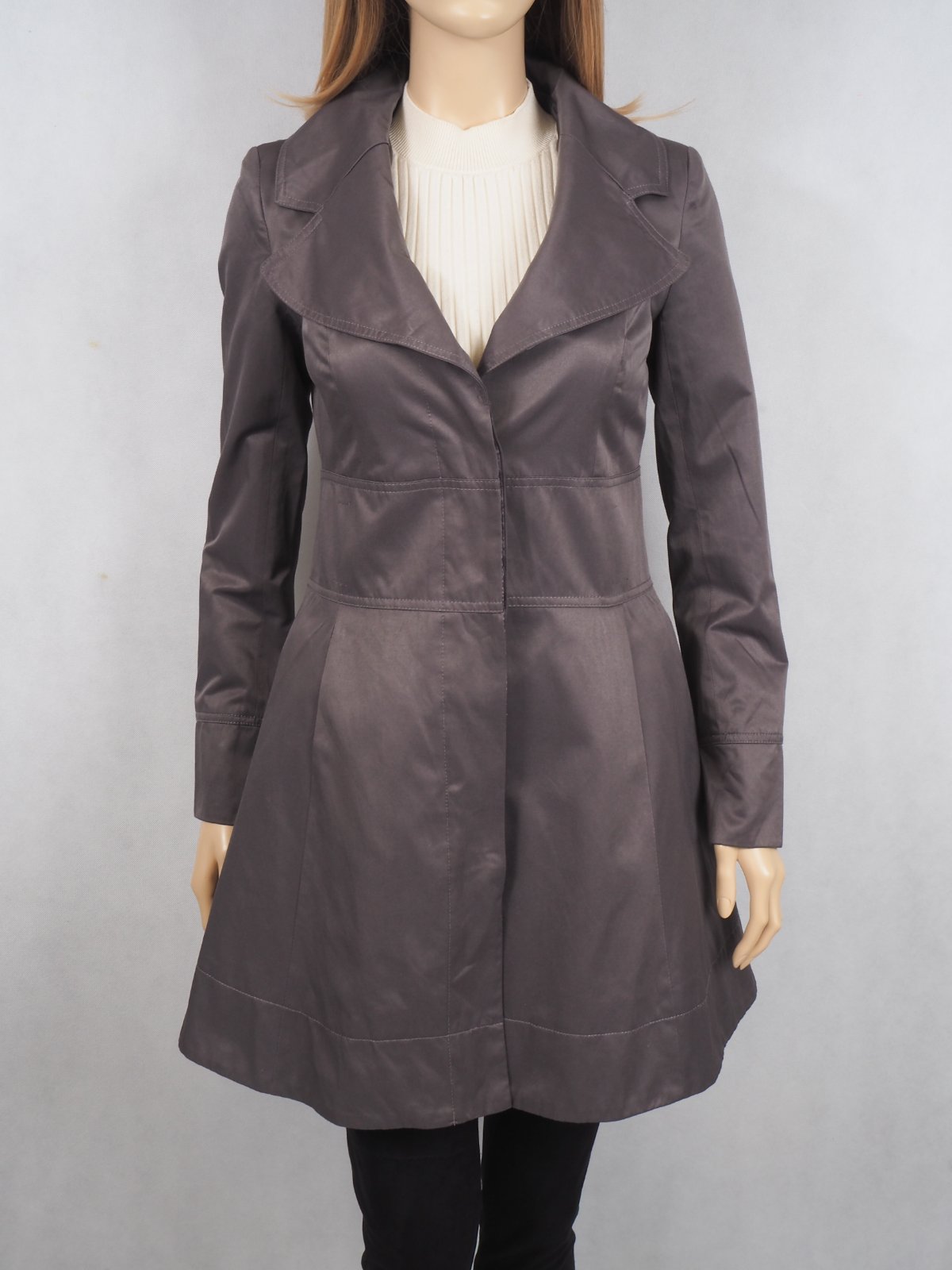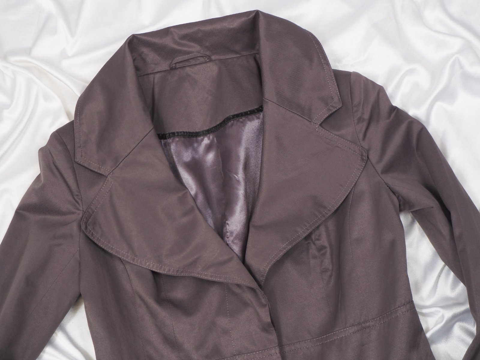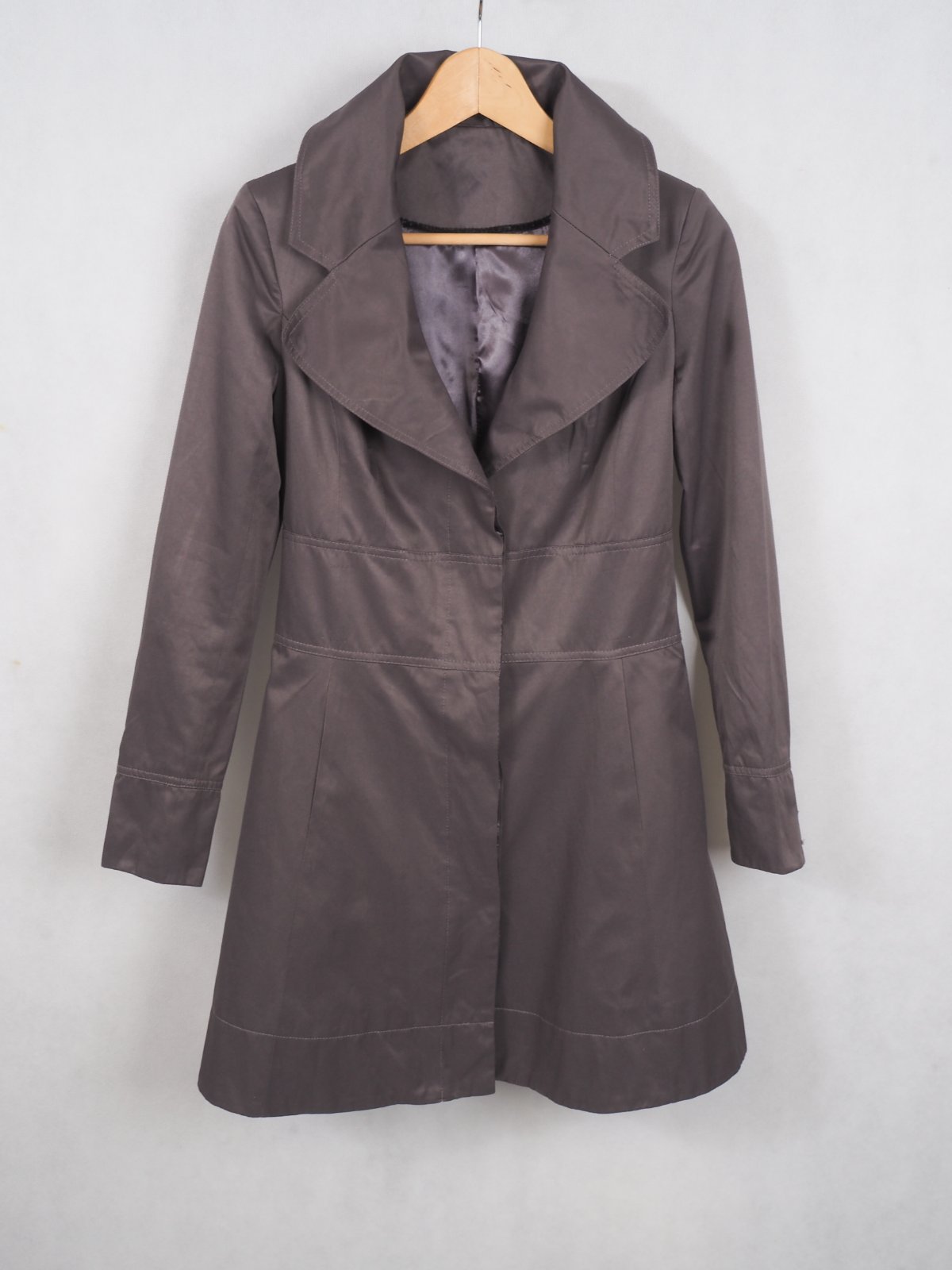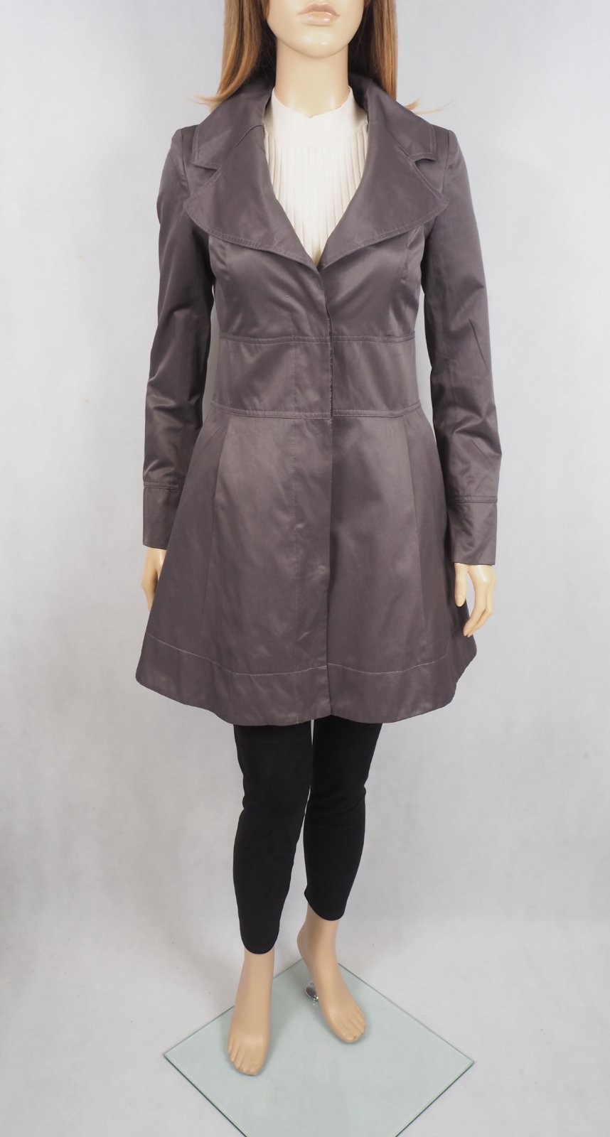 Kvalitný prechodný trenčkot, zapínanie na skryté gombíky, materiál 51% bavlna, 49% polyester, super stav.